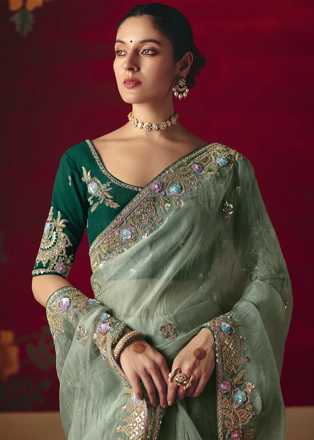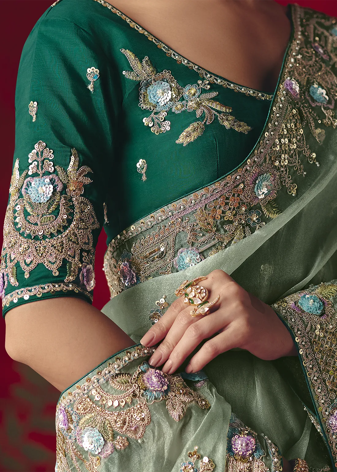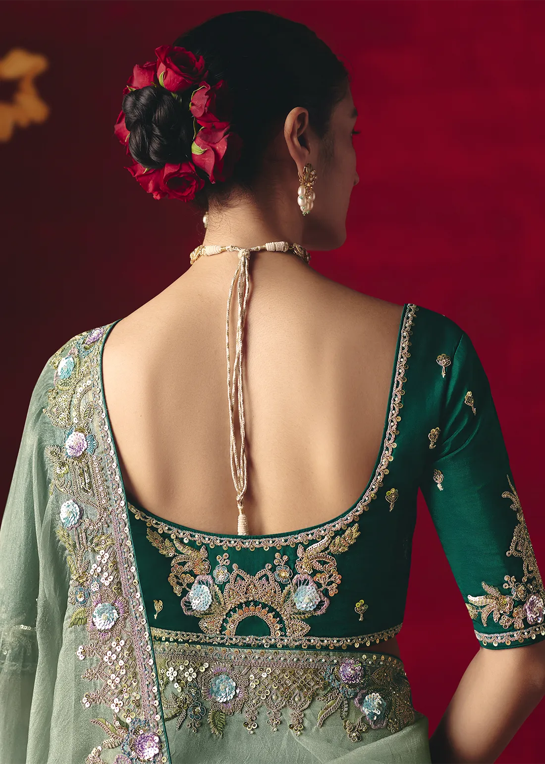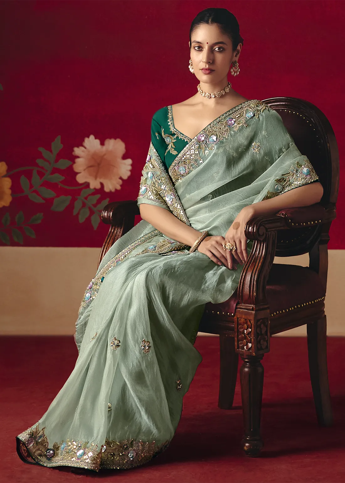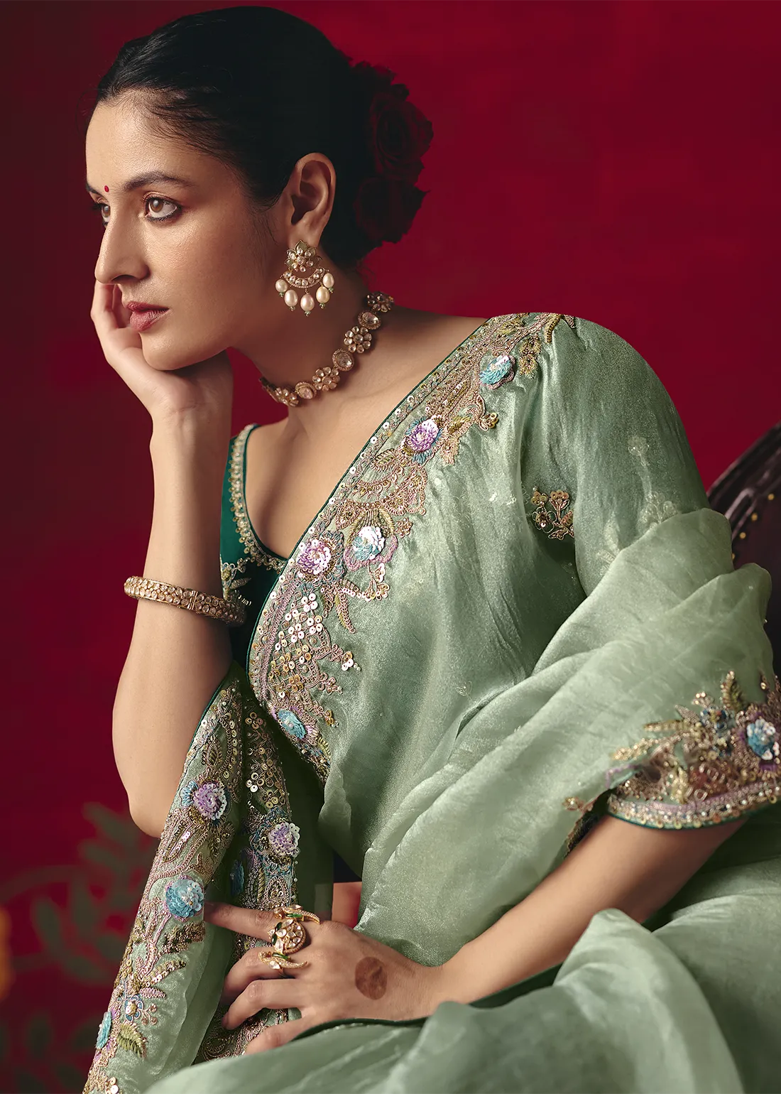 Embroidered Mint Green Tissue Silk Saree with Emerald Green Blouse