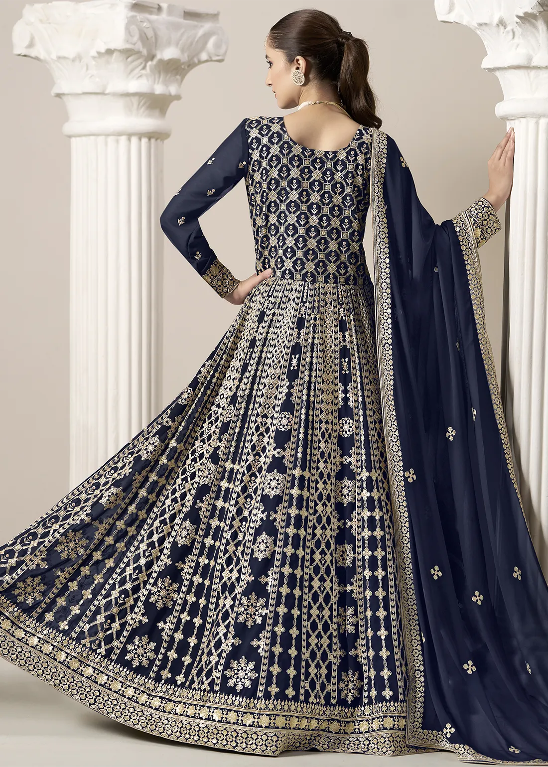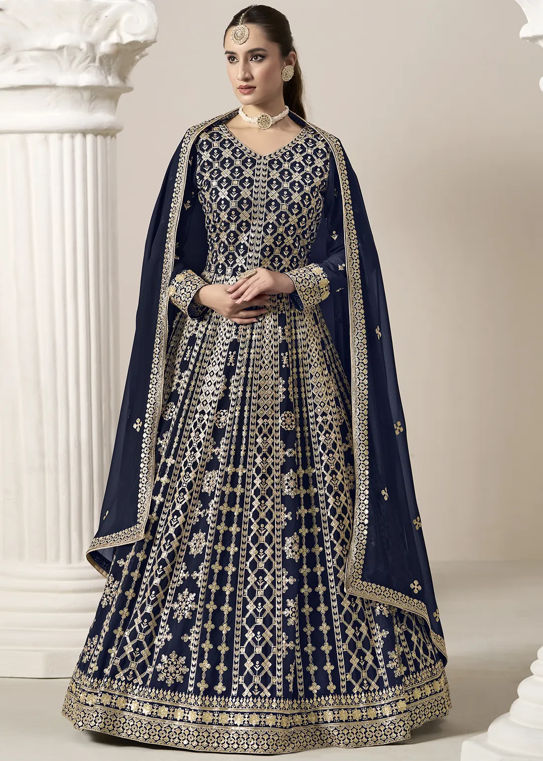 Step into timeless elegance with this Navy Blue Anarkali Suit crafted in premium georgette. The semi-stitched top features exquisite sequin and zari embroidery all over, styled with a flattering V-neck and full sleeves. Paired with a stitched santoon churidar bottom and an embroidered georgette dupatta, this ensemble is perfect for weddings, receptions, and festive occasions. The santoon inner adds comfort, while the rich embroidery lends a regal touch to your look.