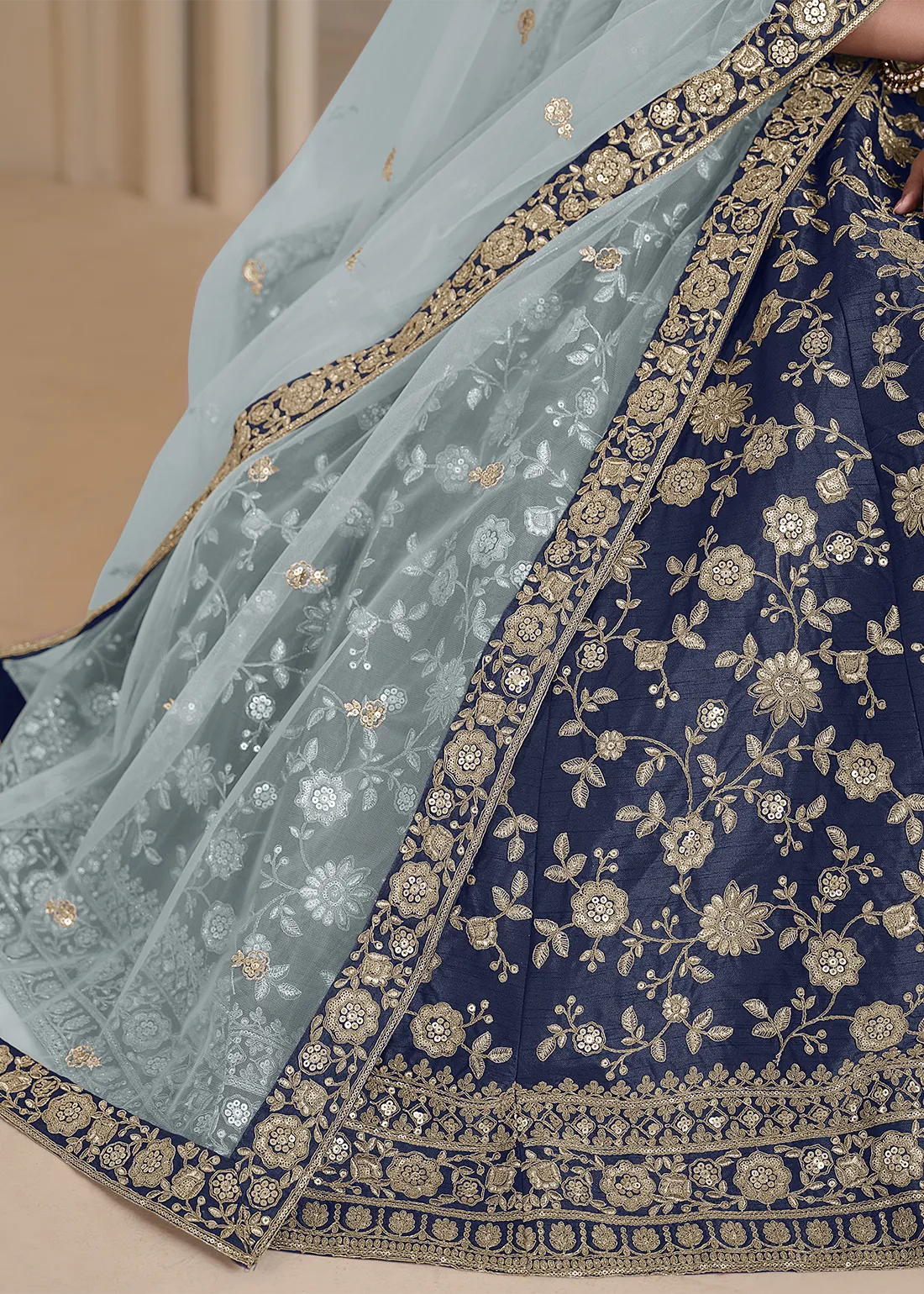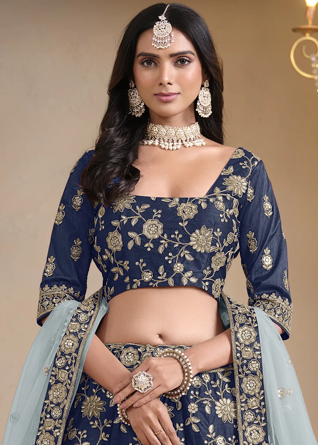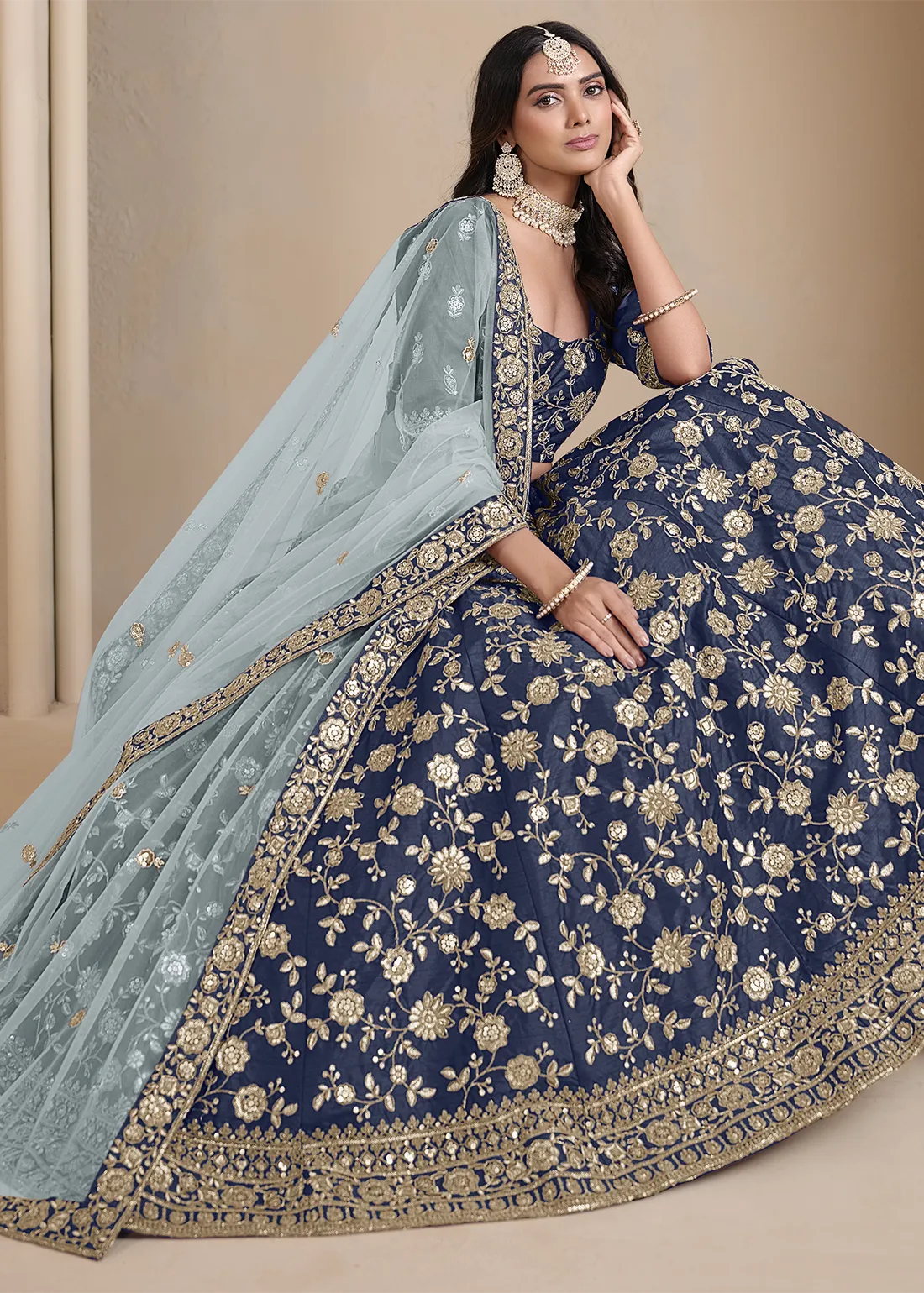 Radiate grace in this Navy Blue Silk Lehenga beautifully decorated with Resham, Dori, and Sequins embroidery. The semi-stitched lehenga is paired with a matching silk blouse and a net dupatta featuring delicate embroidered floral motifs. With a comfortable Santoon inner lining, this lehenga is perfect for weddings, festive occasions, and celebrations. Being fully customizable, it ensures a perfect blend of elegance and comfort.
