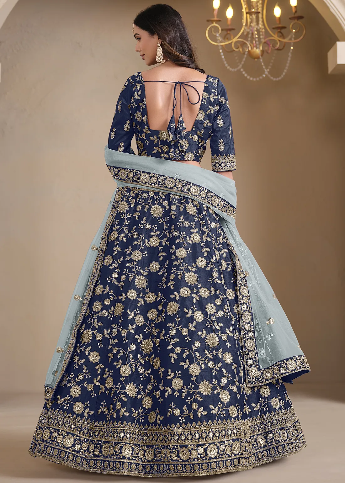 Embroidered Navy Blue Silk Lehenga with Net Dupatta