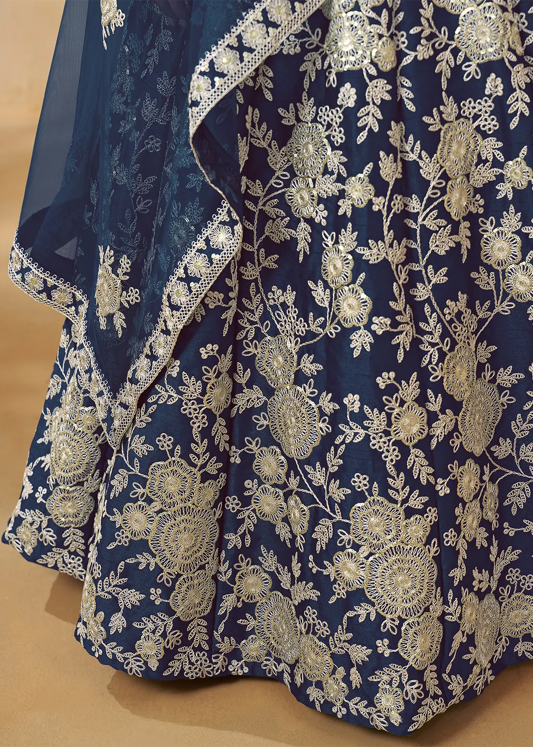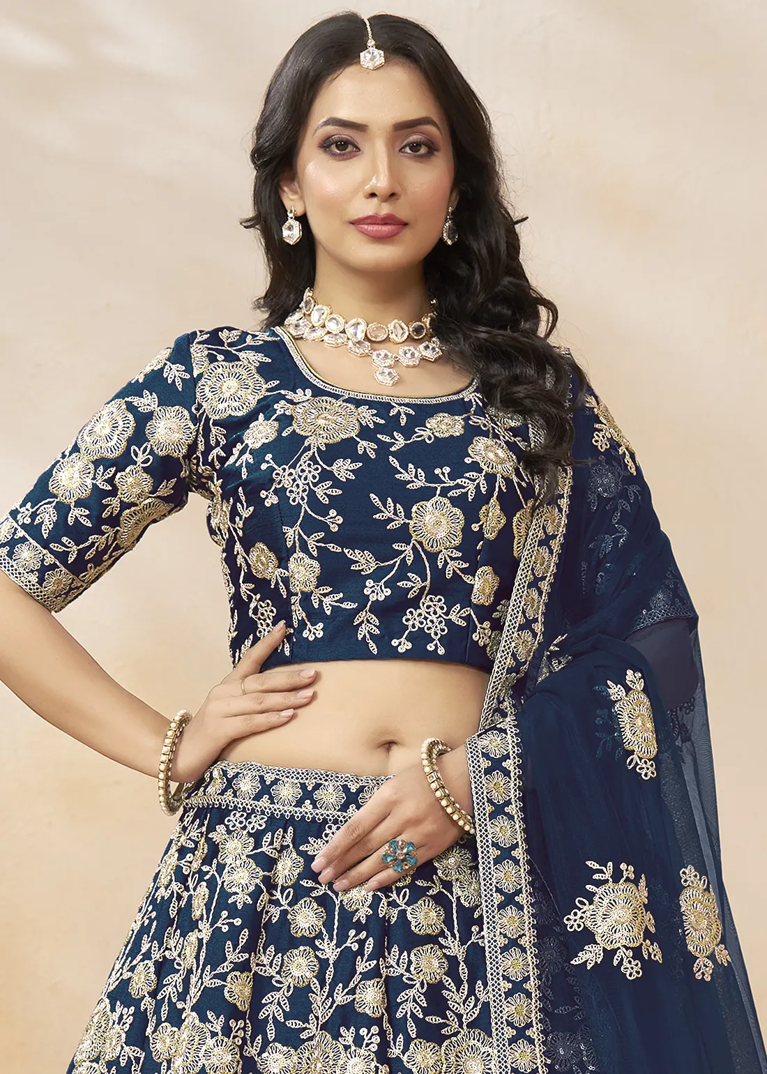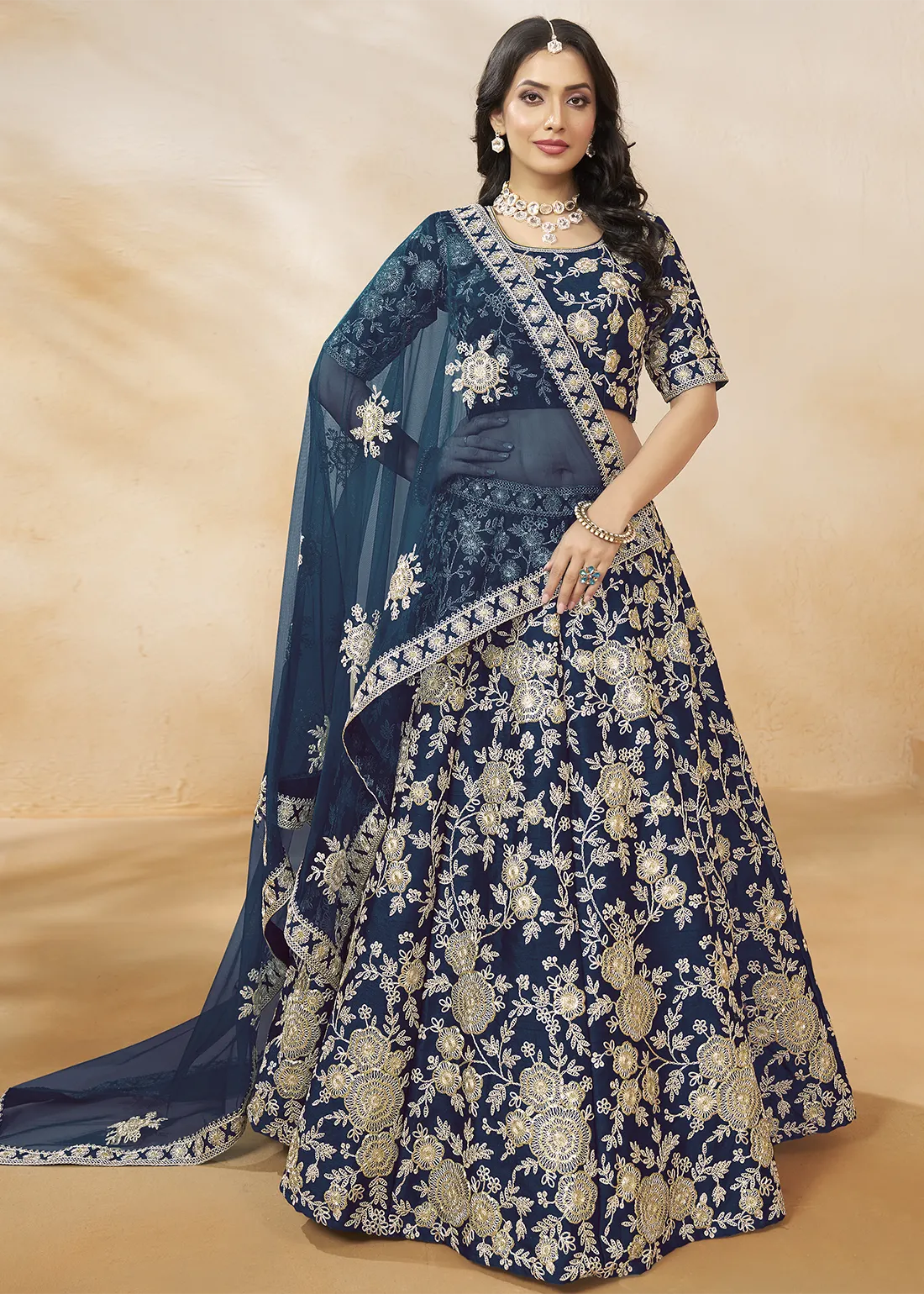 Embroidered Navy Blue Silk Lehenga with Net Dupatta