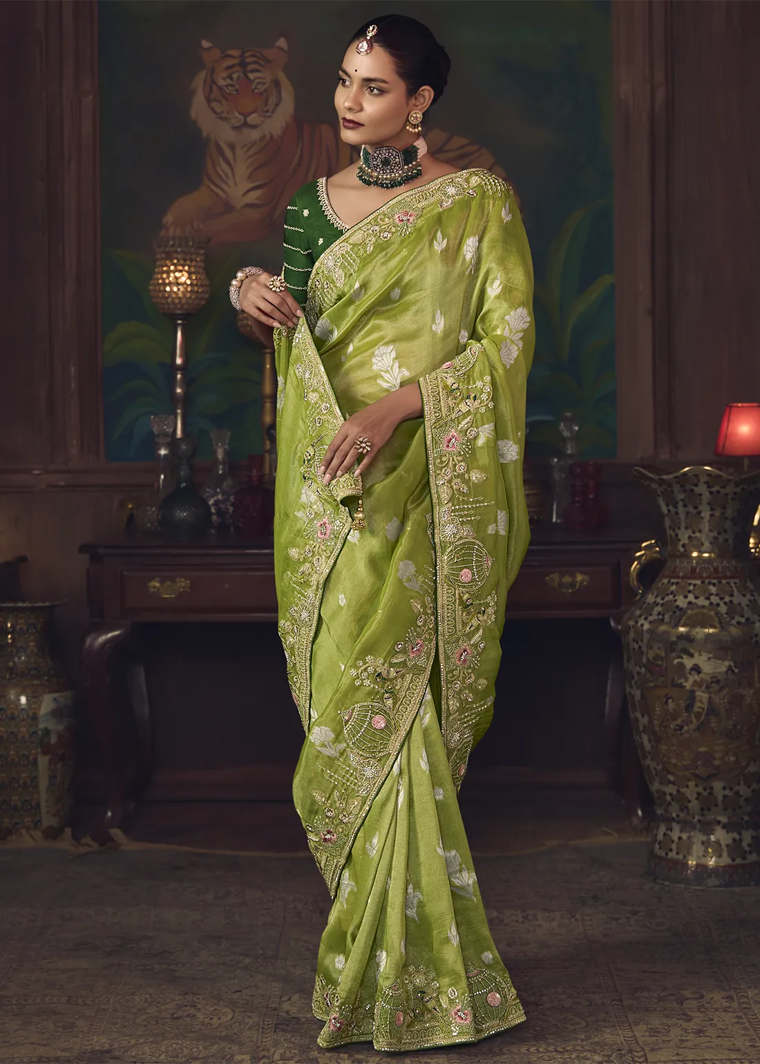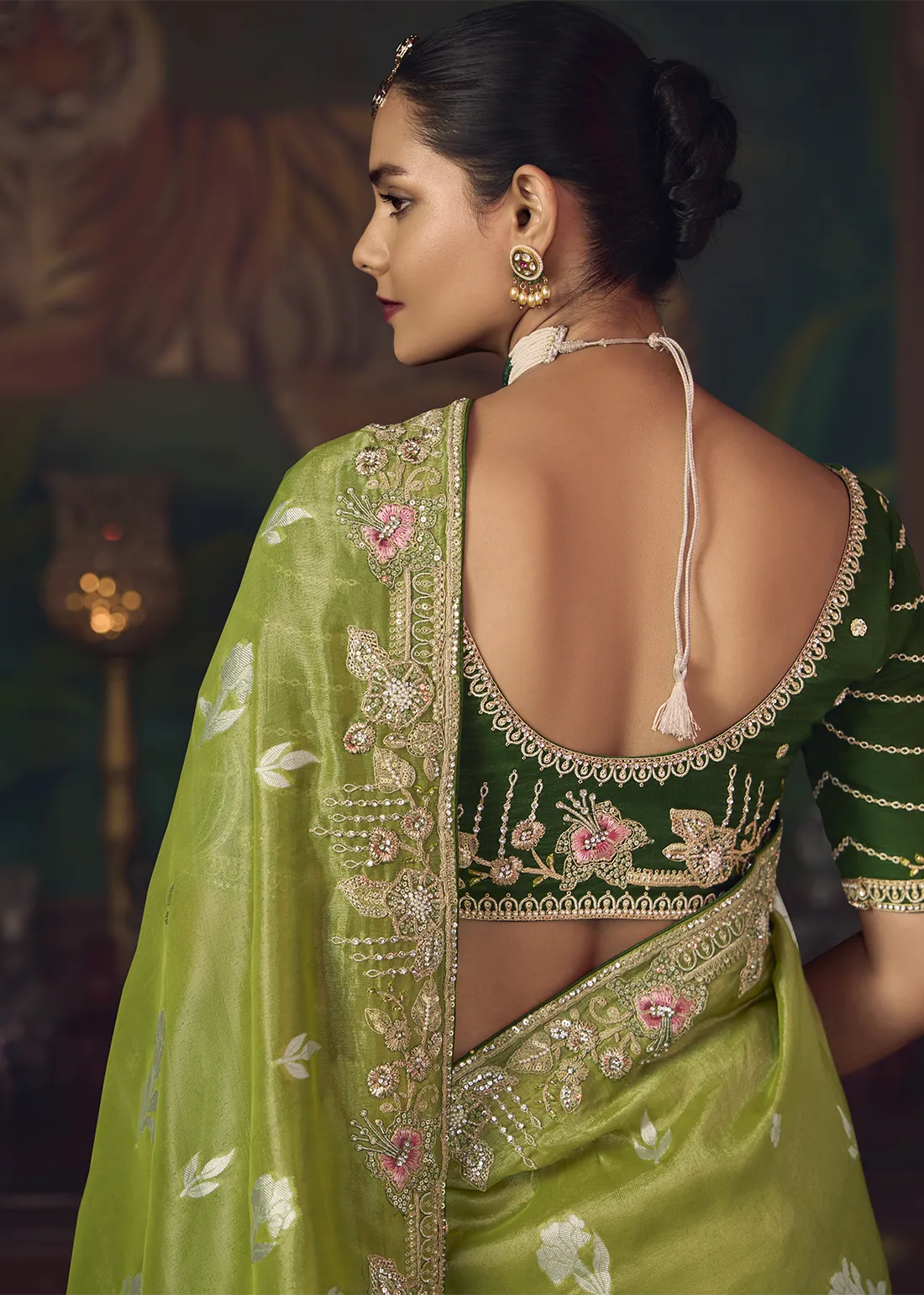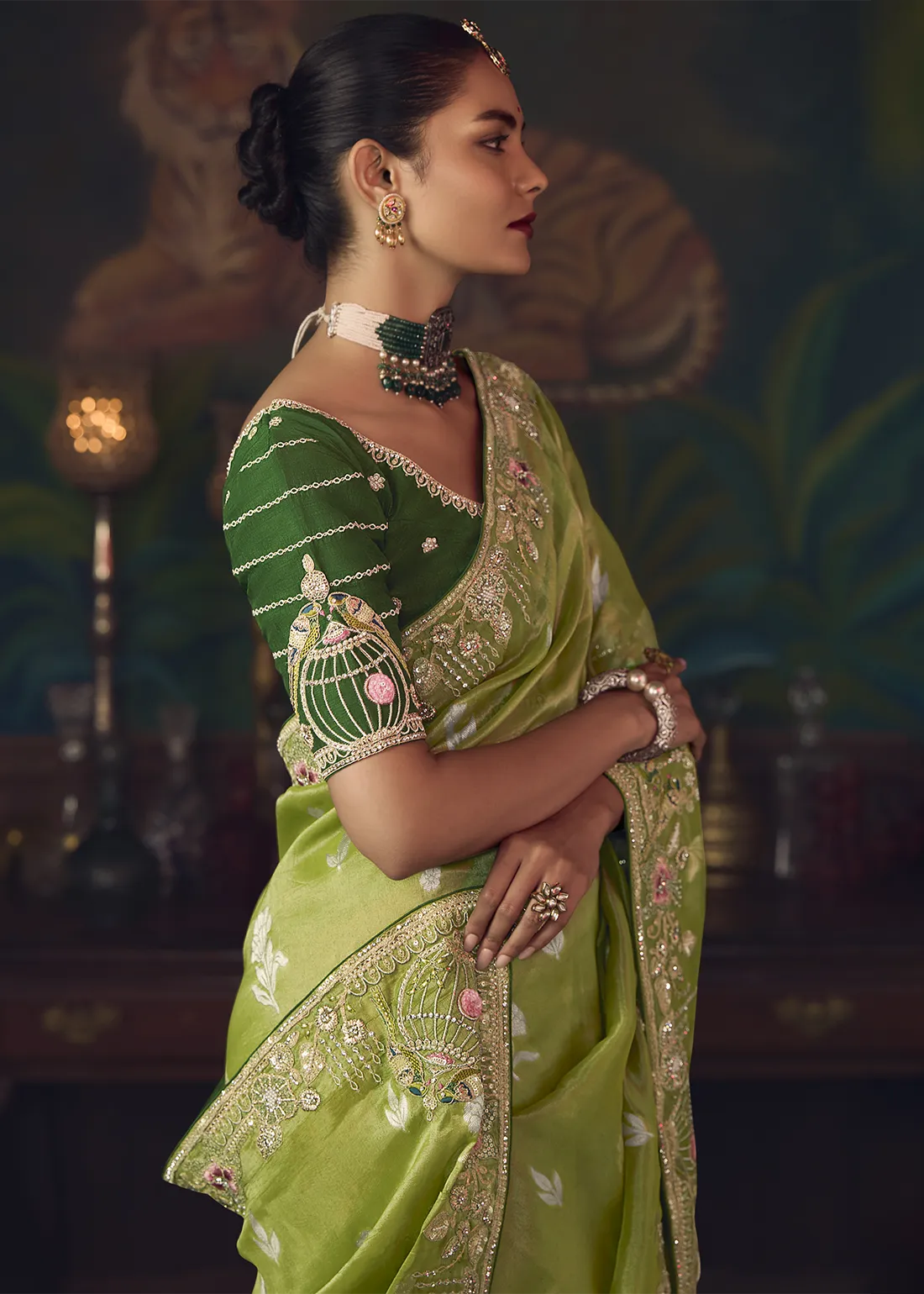 Embroidered Parrot Green Kanjivaram Silk Saree with Dark Green Blouse