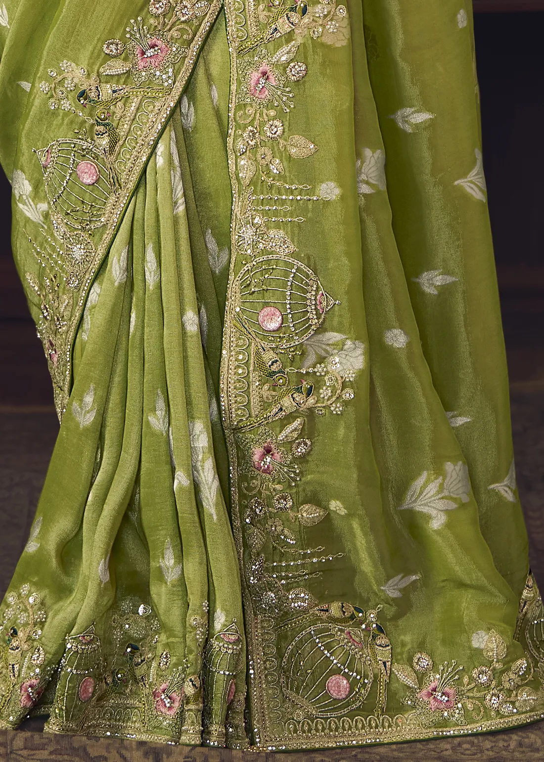 Olive & Bottle Green Kanjivaram Silk Saree with Meenakari