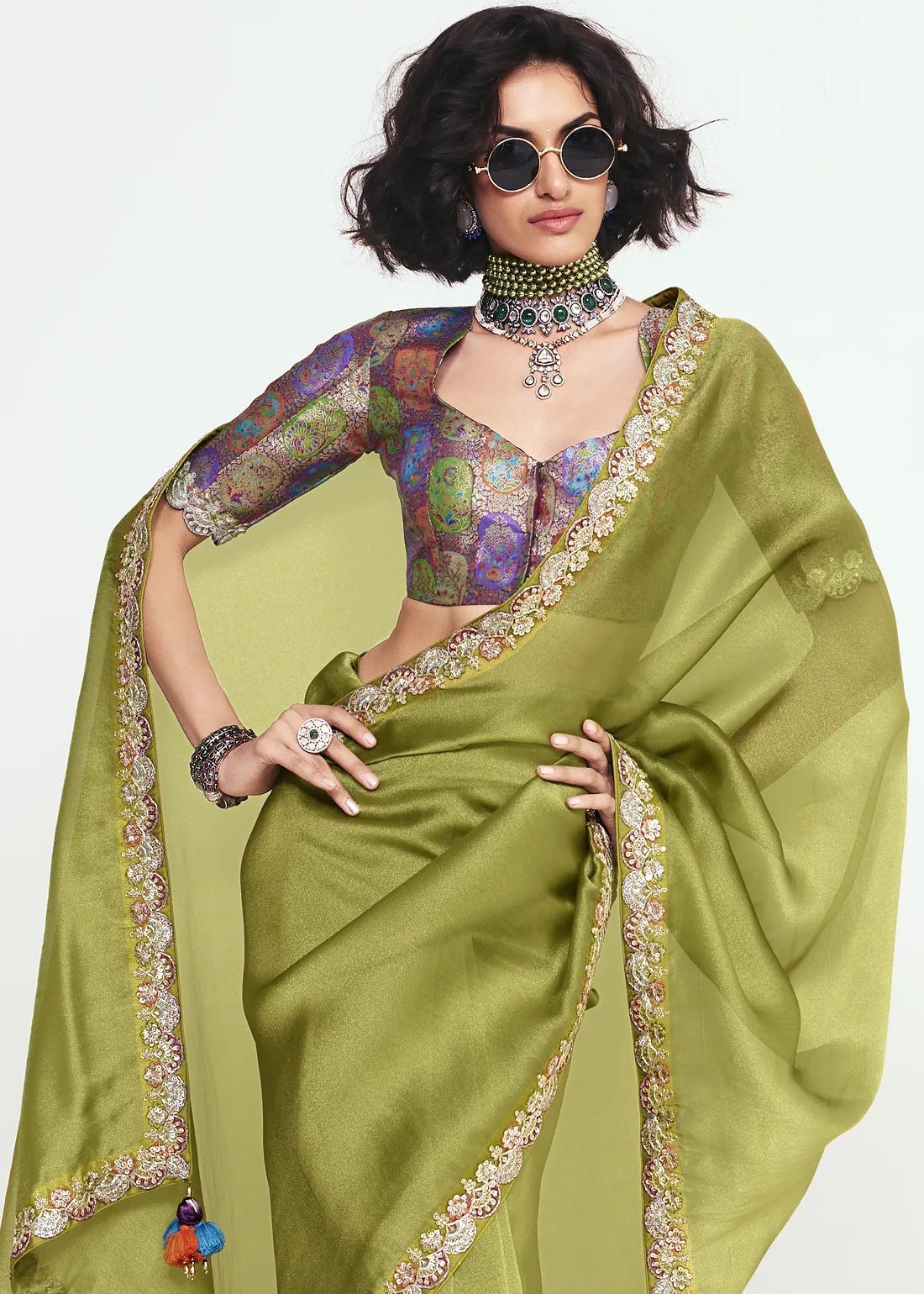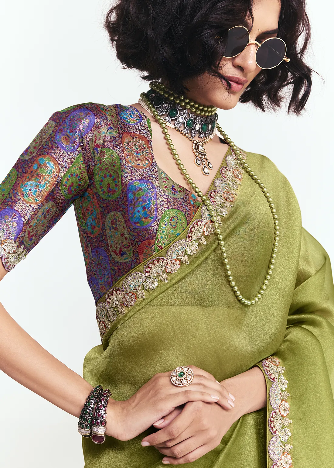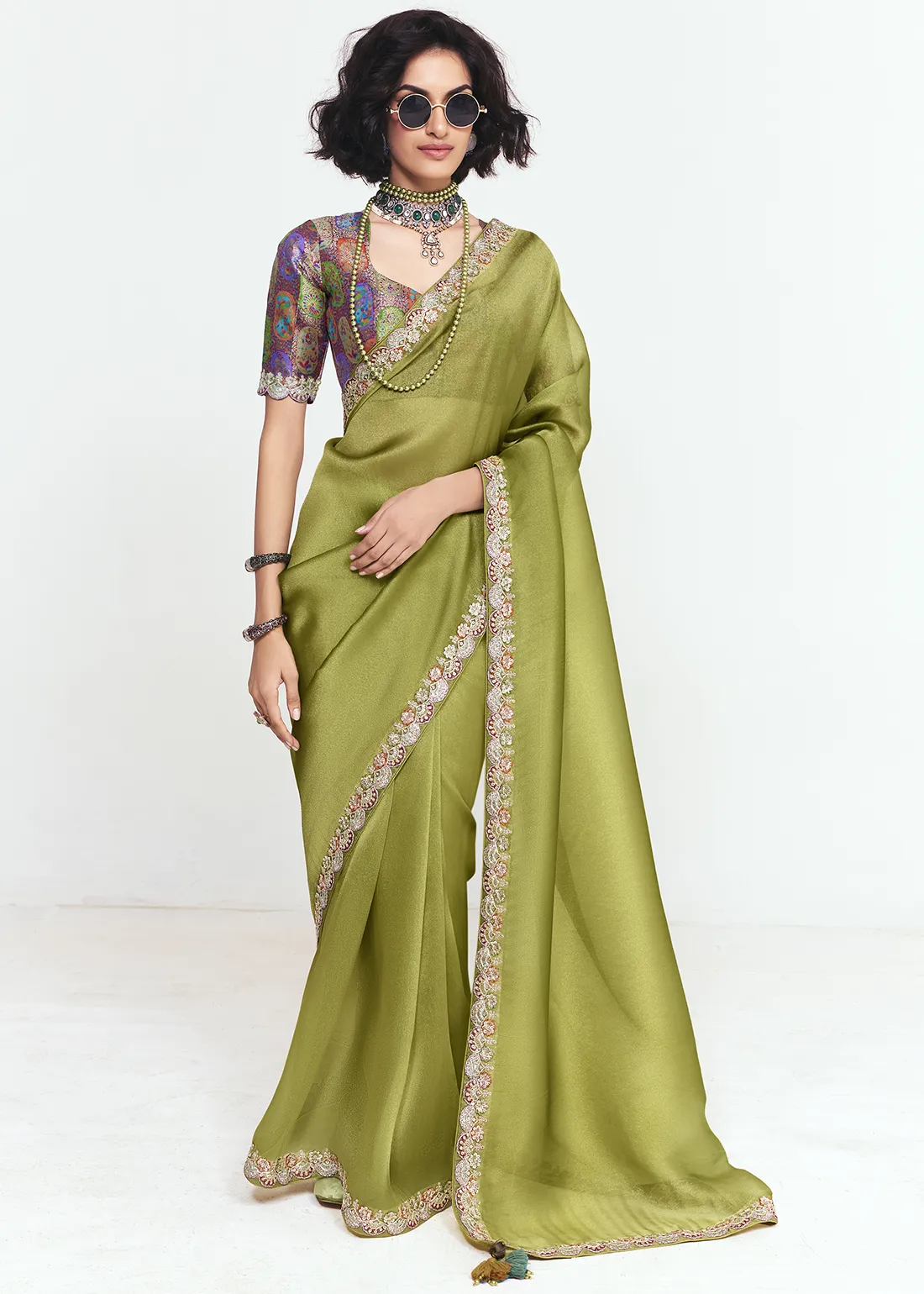 Set Content: Olive Green Saree with designer blouse.