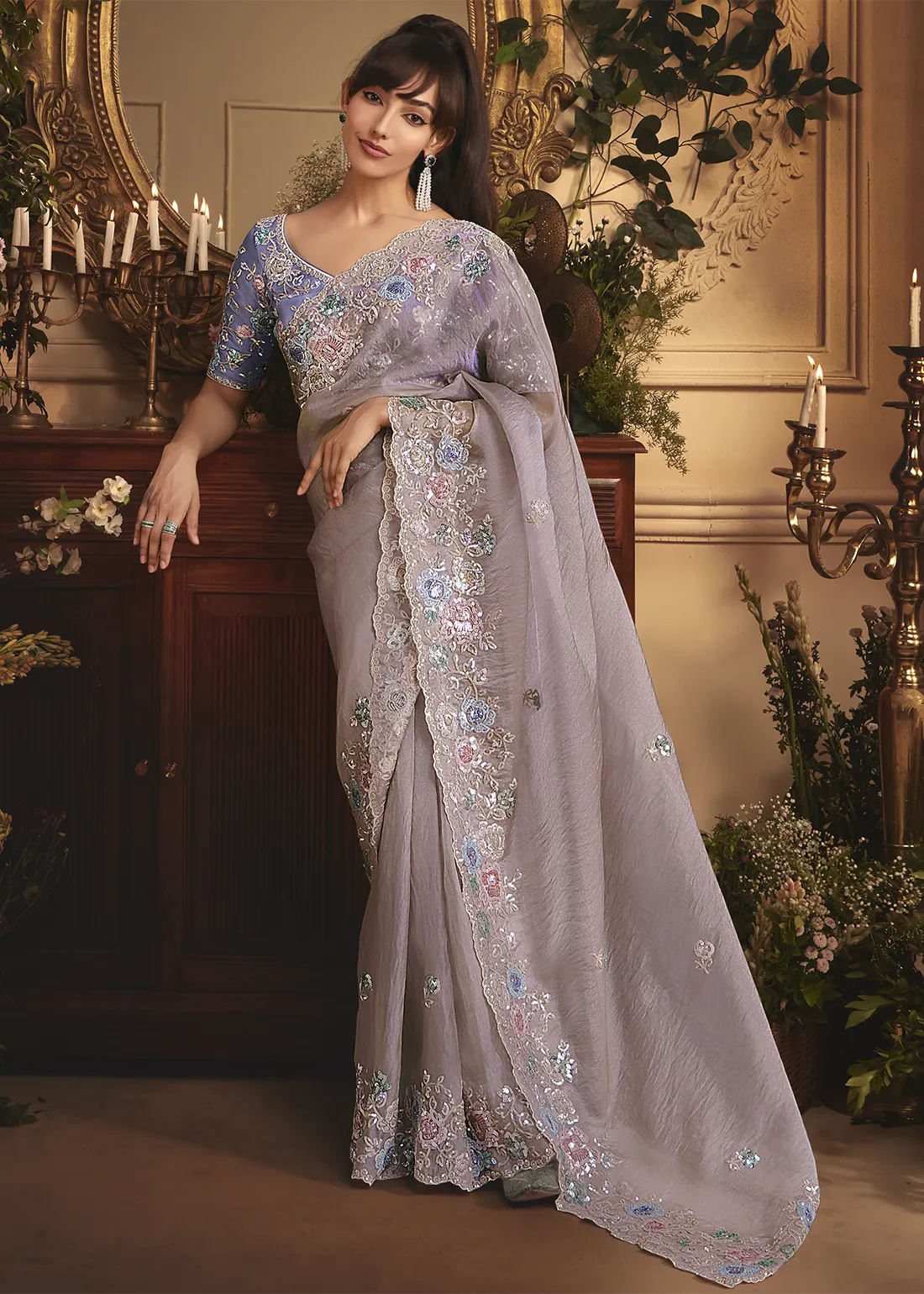 Embroidered Pastel Purple Organza Saree with Scalloped Border