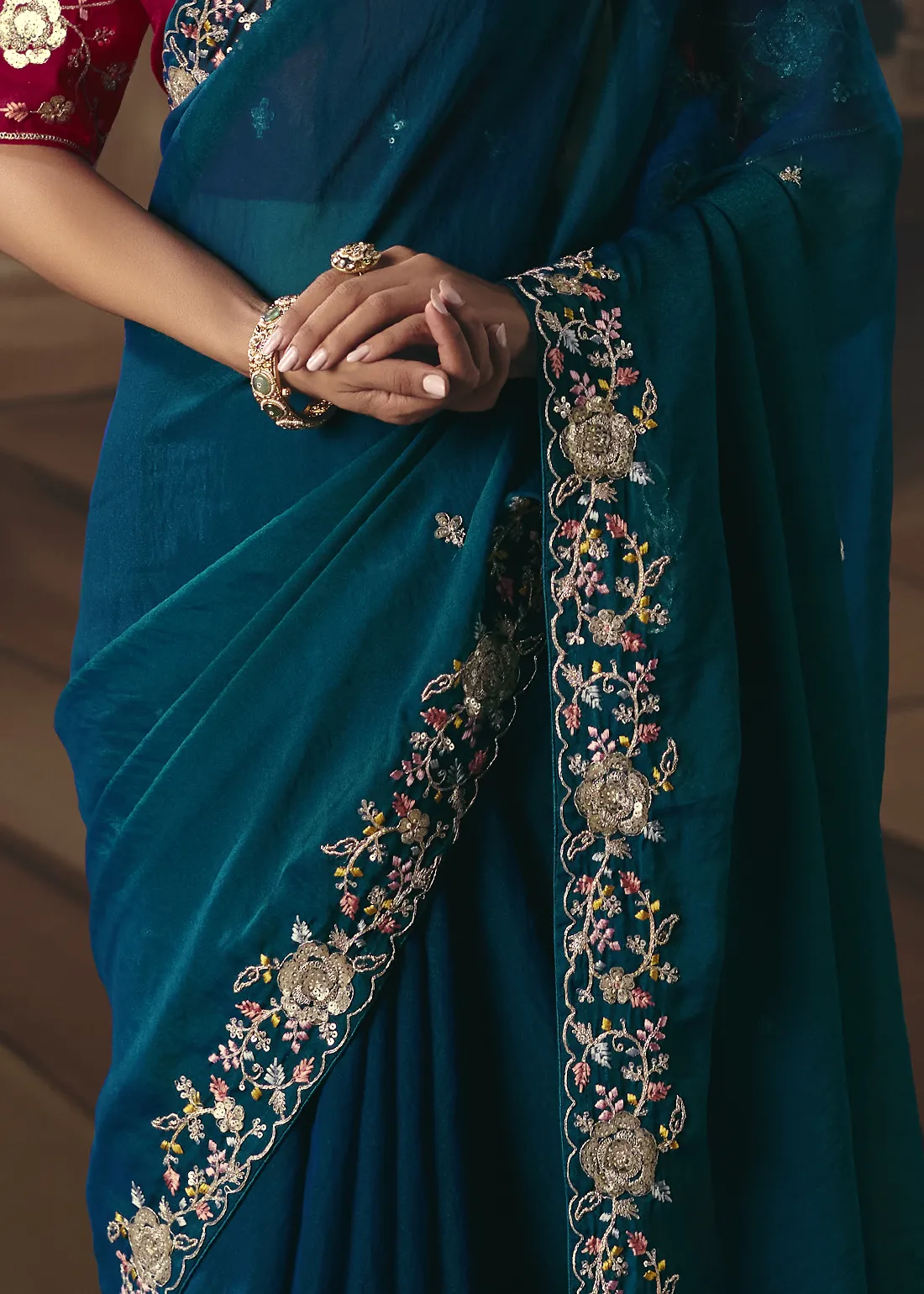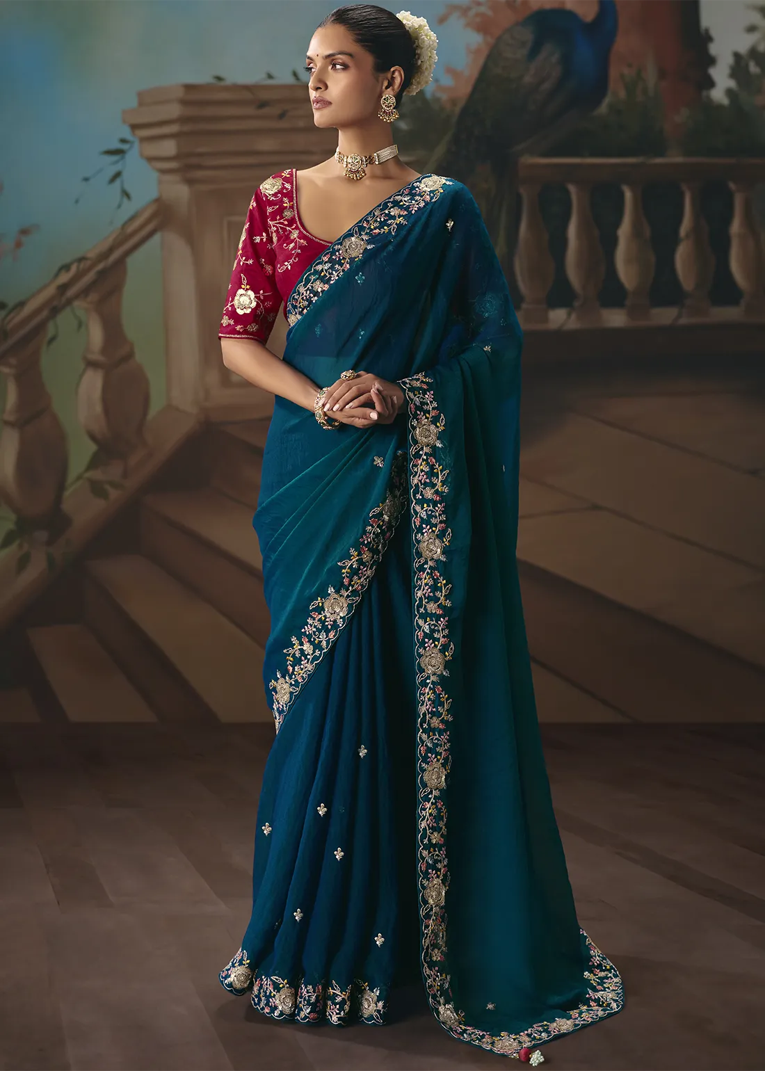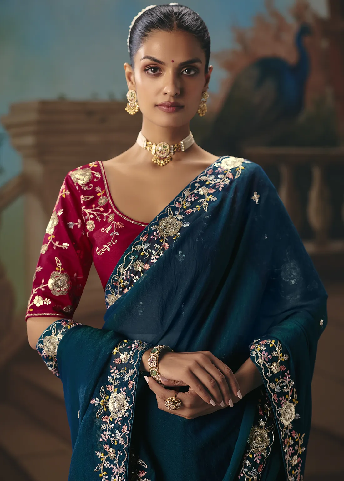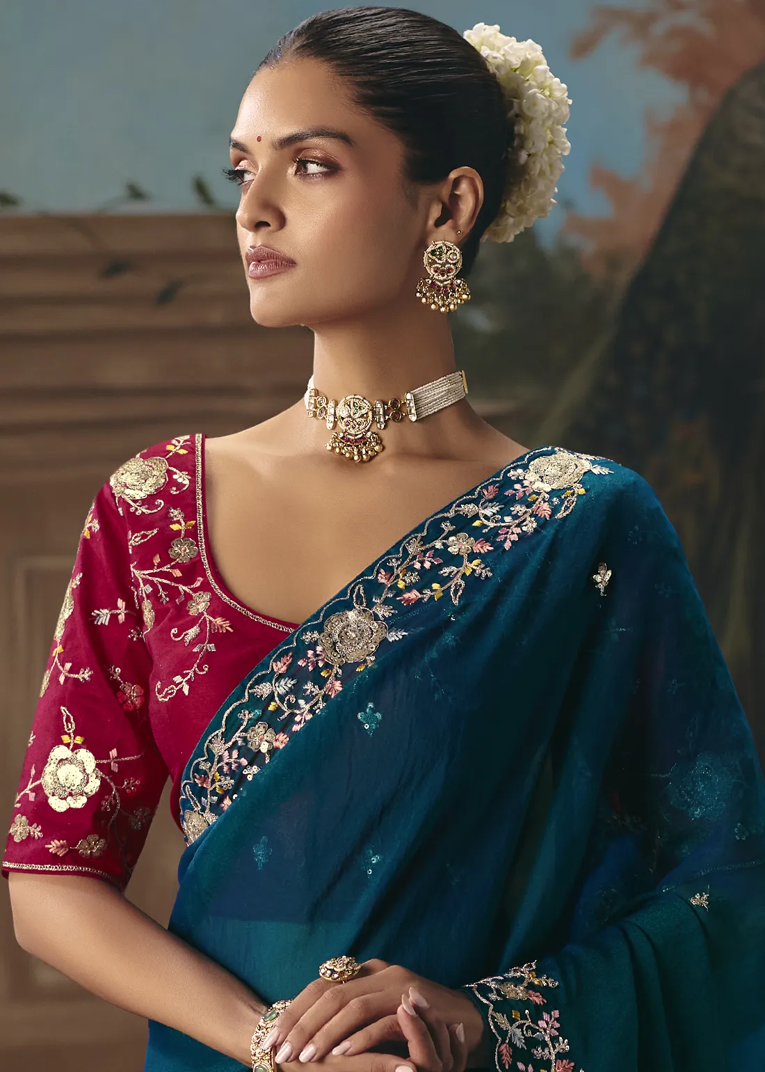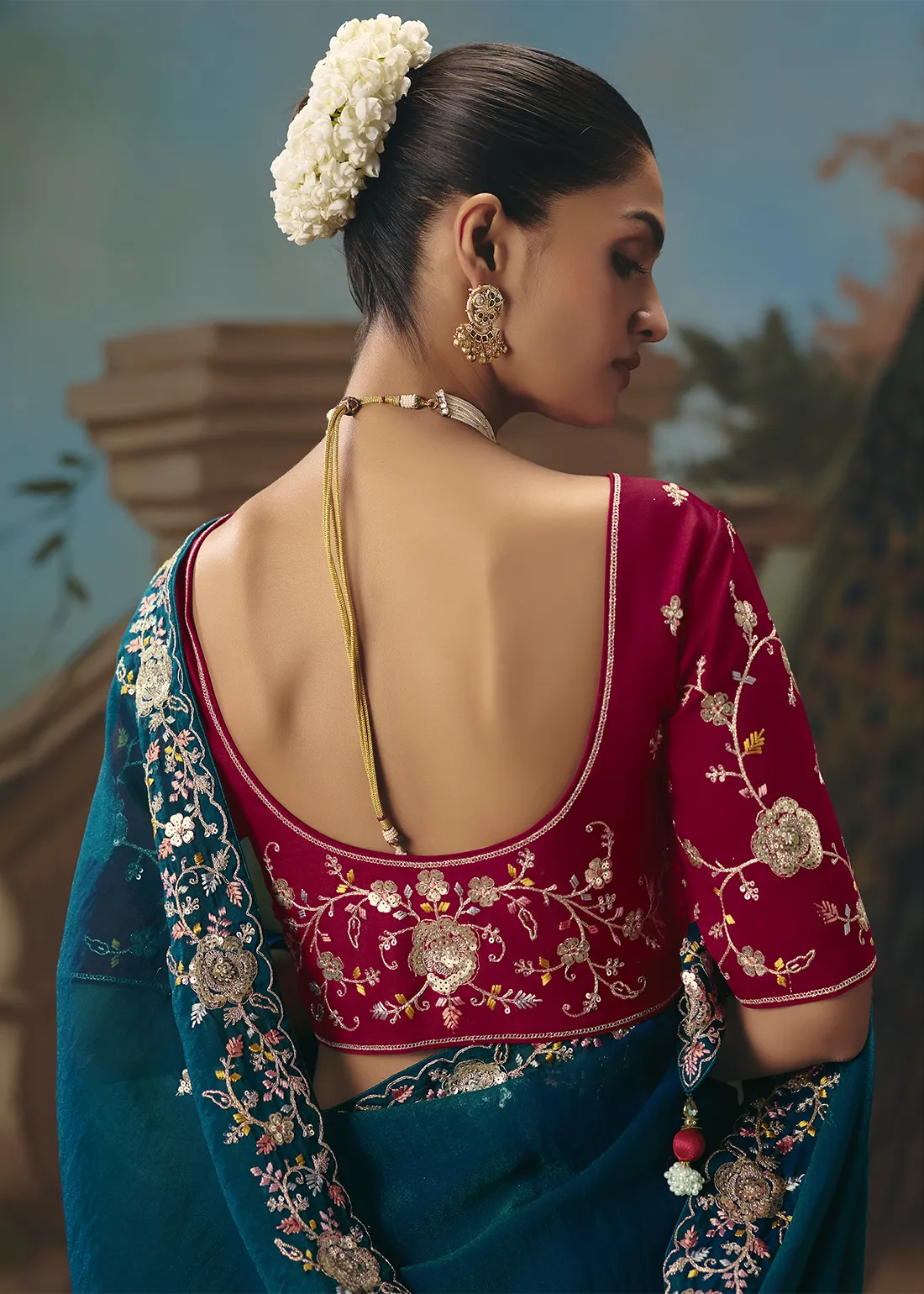 Embroidered Peacock Blue Chiffon Saree with Maroon Blouse