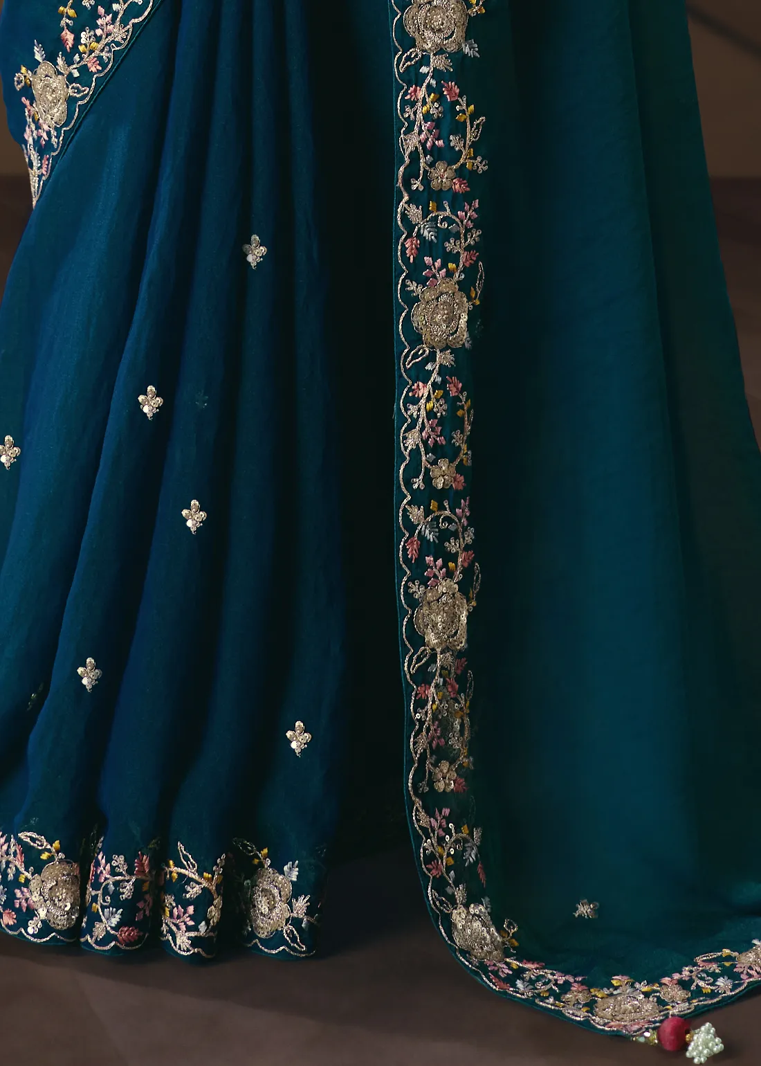 Saree: Shine in the spotlight with this exquisite Embroidered Peacock Blue Chiffon Saree, adorned with intricate resham, zari and sequins embroidery, complemented by stunning stone and beads handwork that showcases exceptional craftsmanship. This saree, with its luxurious and regal allure, captivates with every drape, making it a perfect choice for grand occasions such as weddings, festivals, or formal events. Embrace elegance and charm in this unforgettable embroidered masterpiece that is sure to leave a lasting impression.