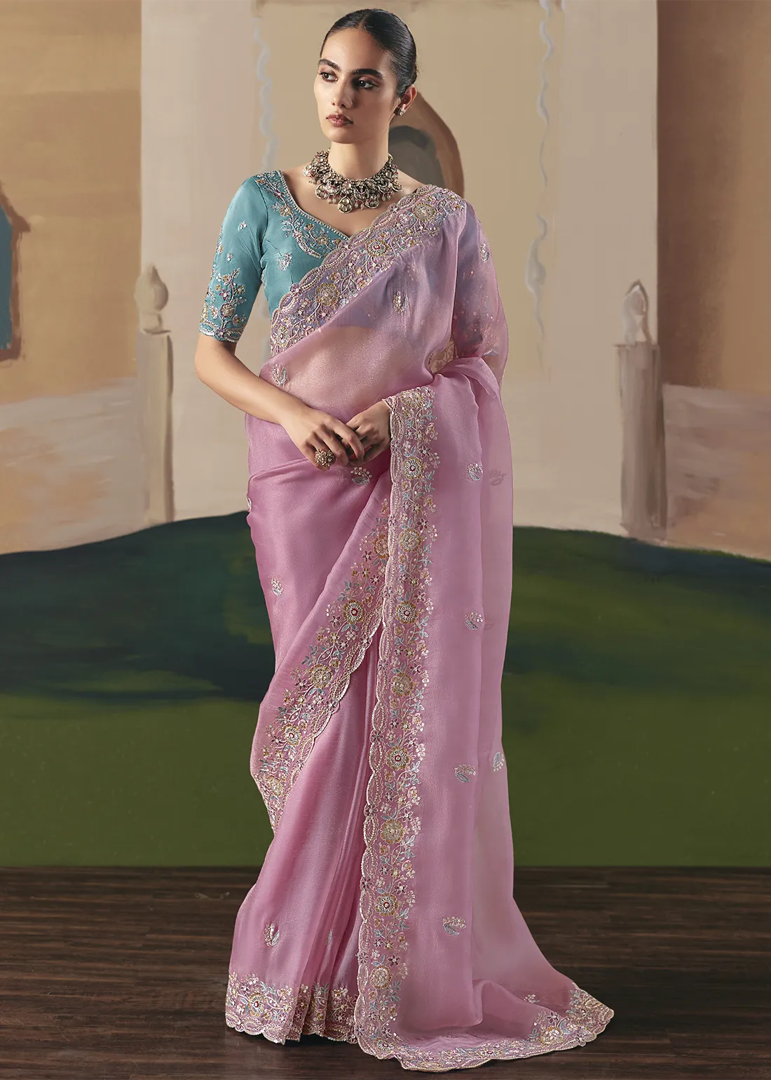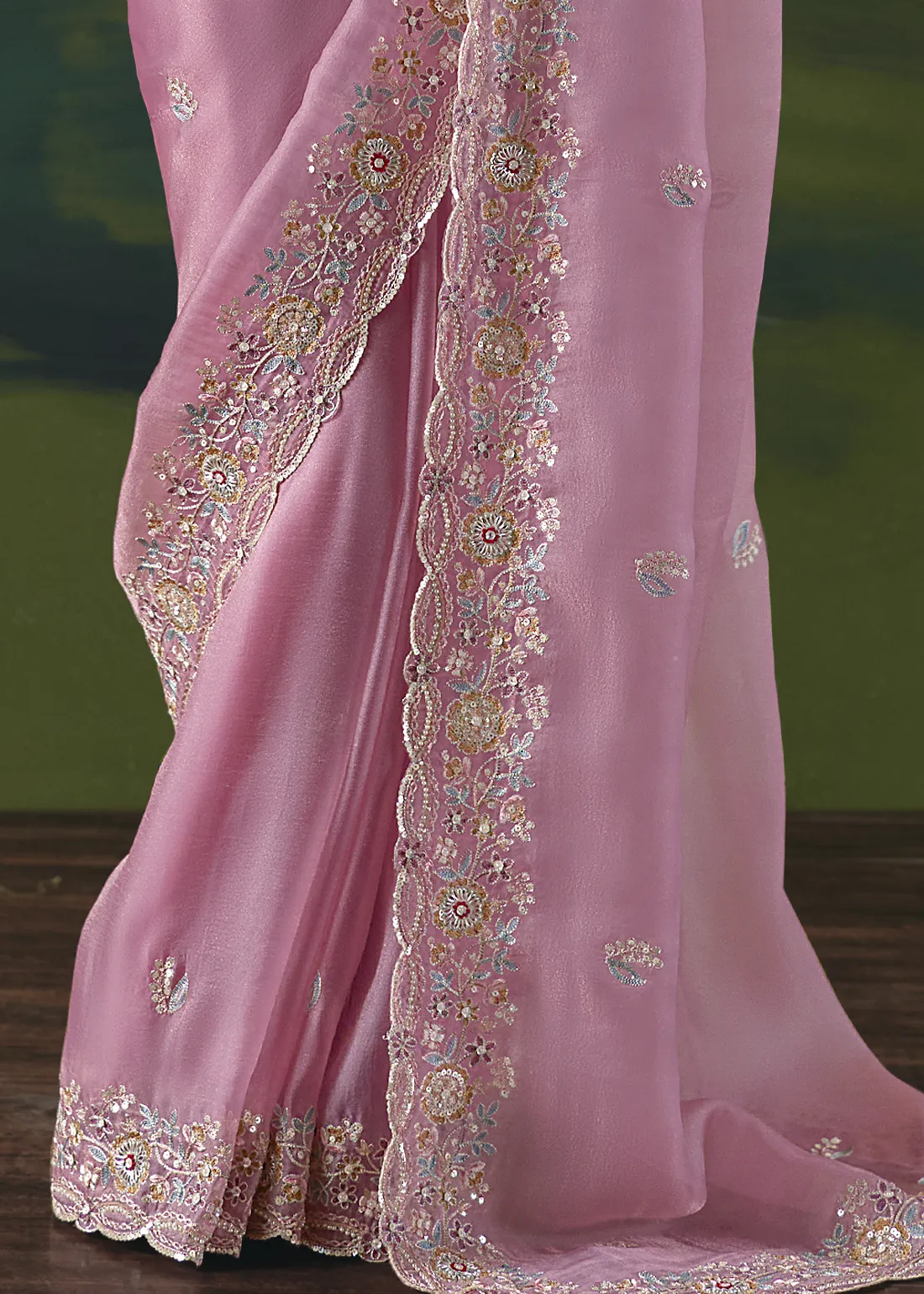Embroidered Pink Organza Silk Saree with Sequins & Stone Work