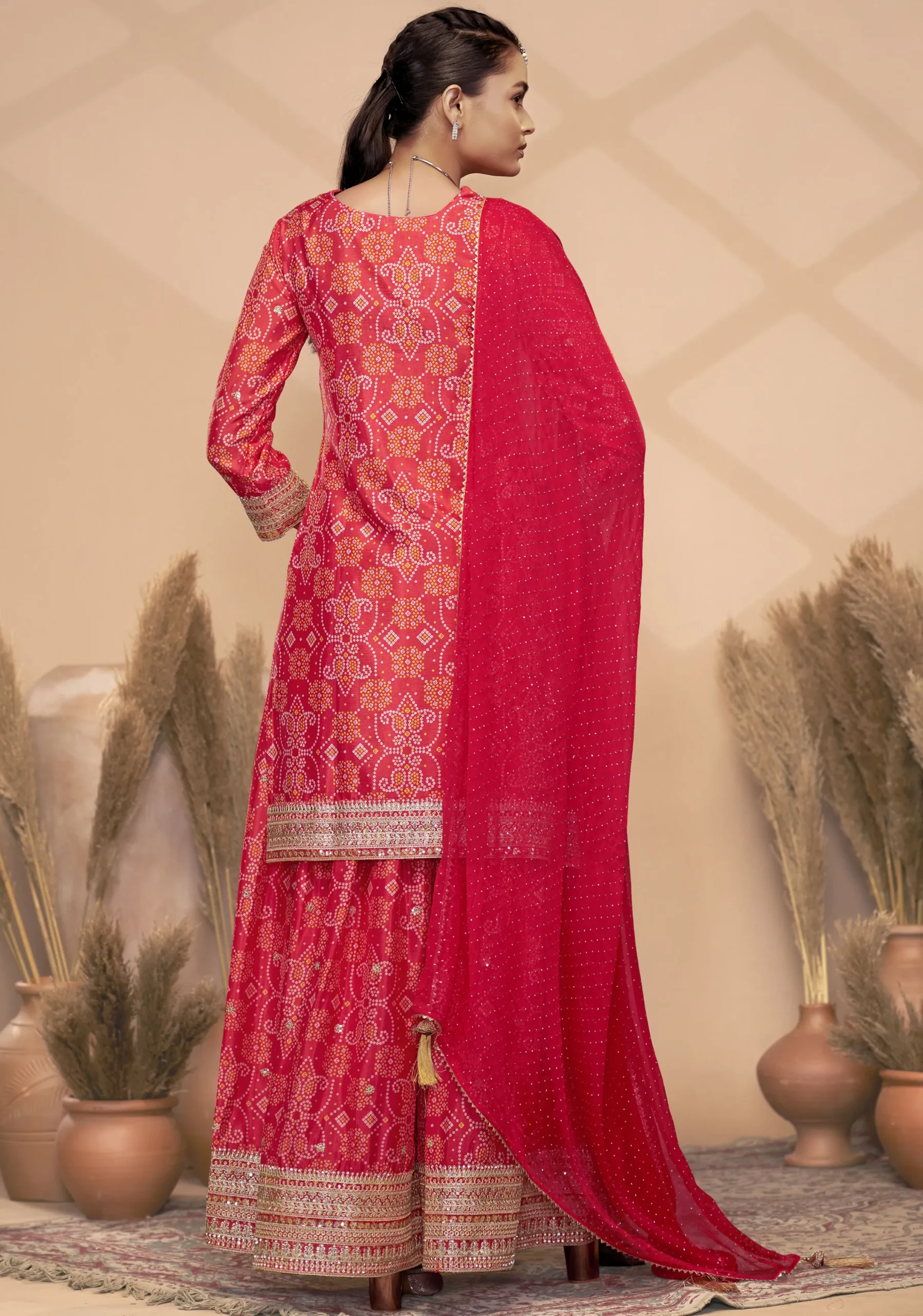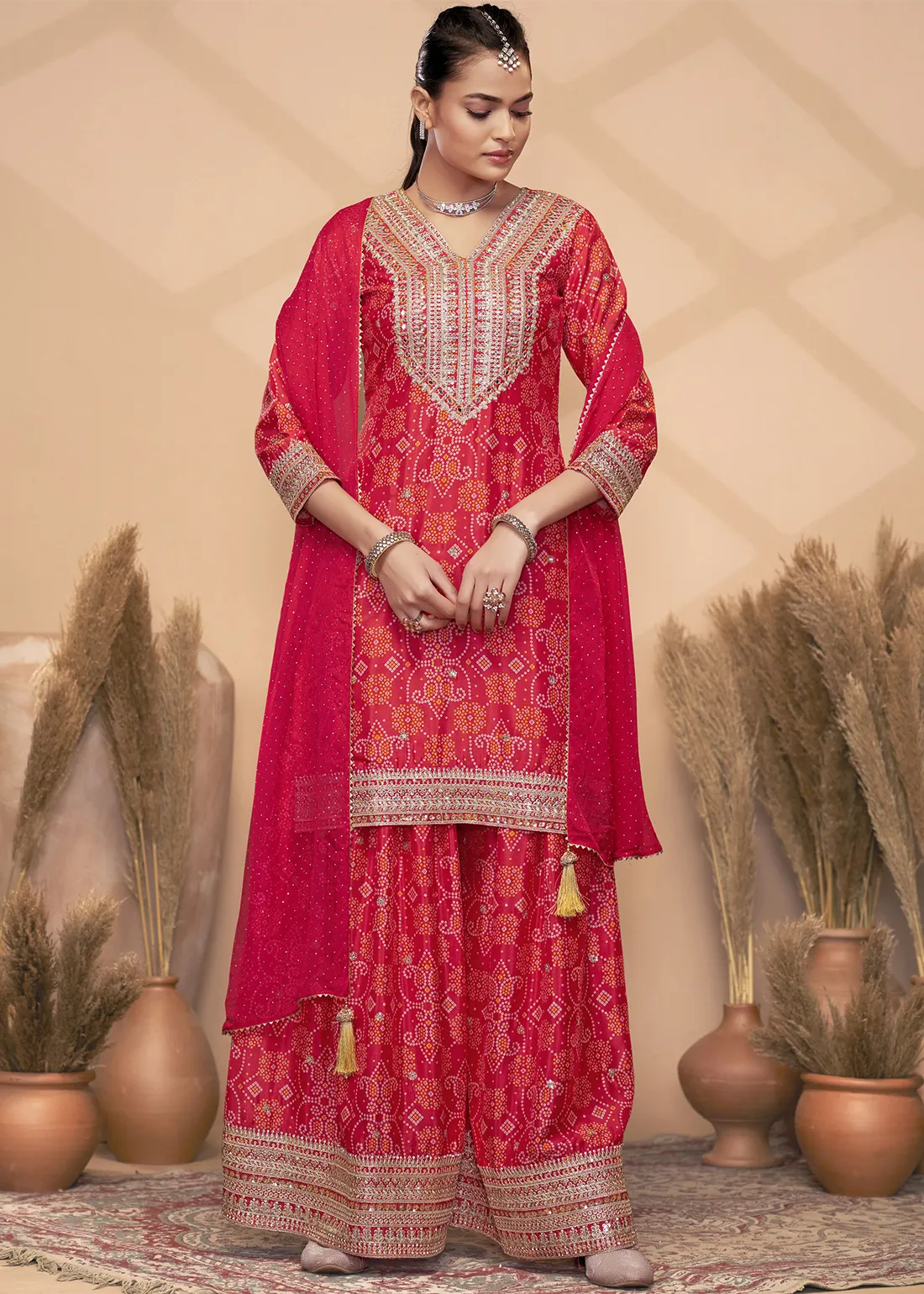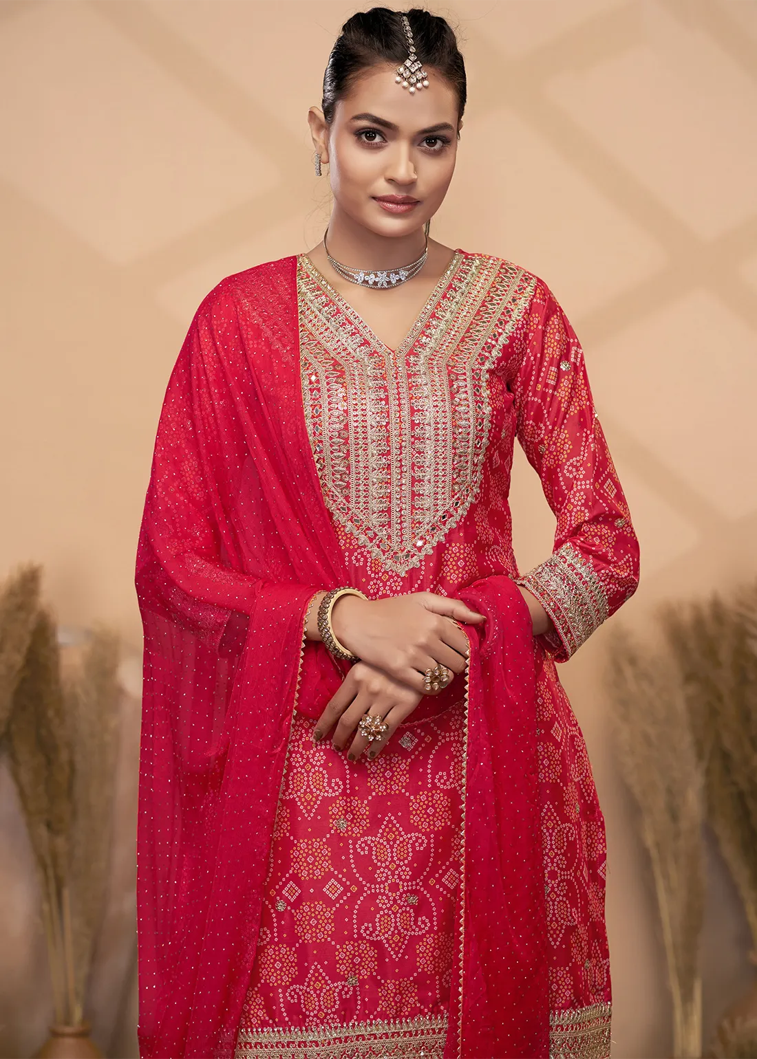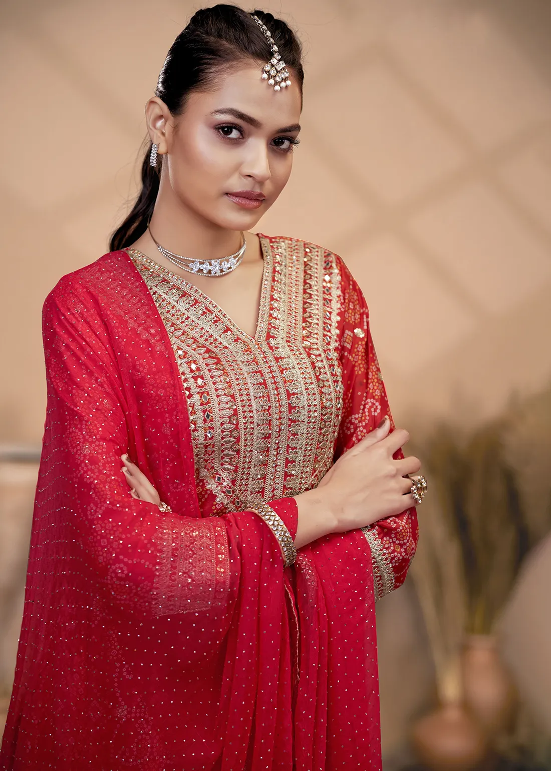 Embroidered Red Bandhani Palazzo Suit with Mirror Work