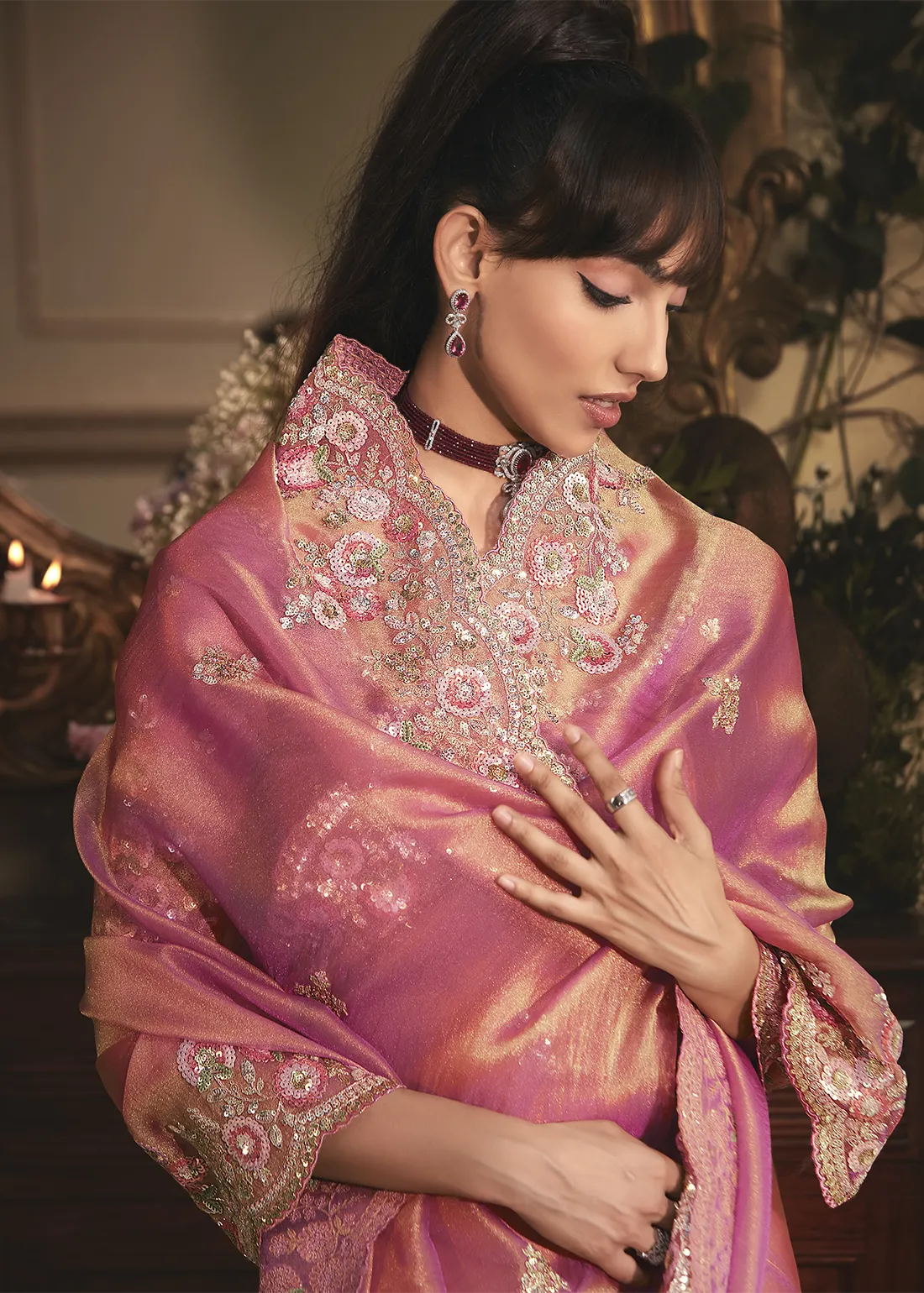 Embroidered Rose Pink Tissue Organza Saree with Scalloped Border