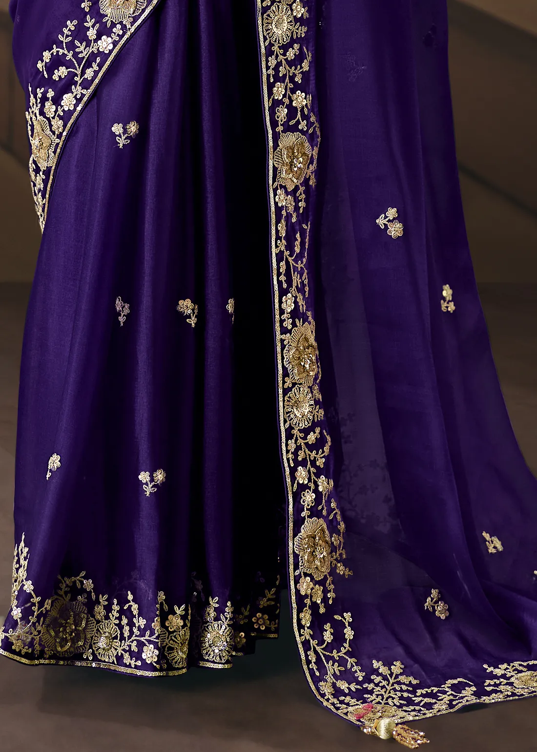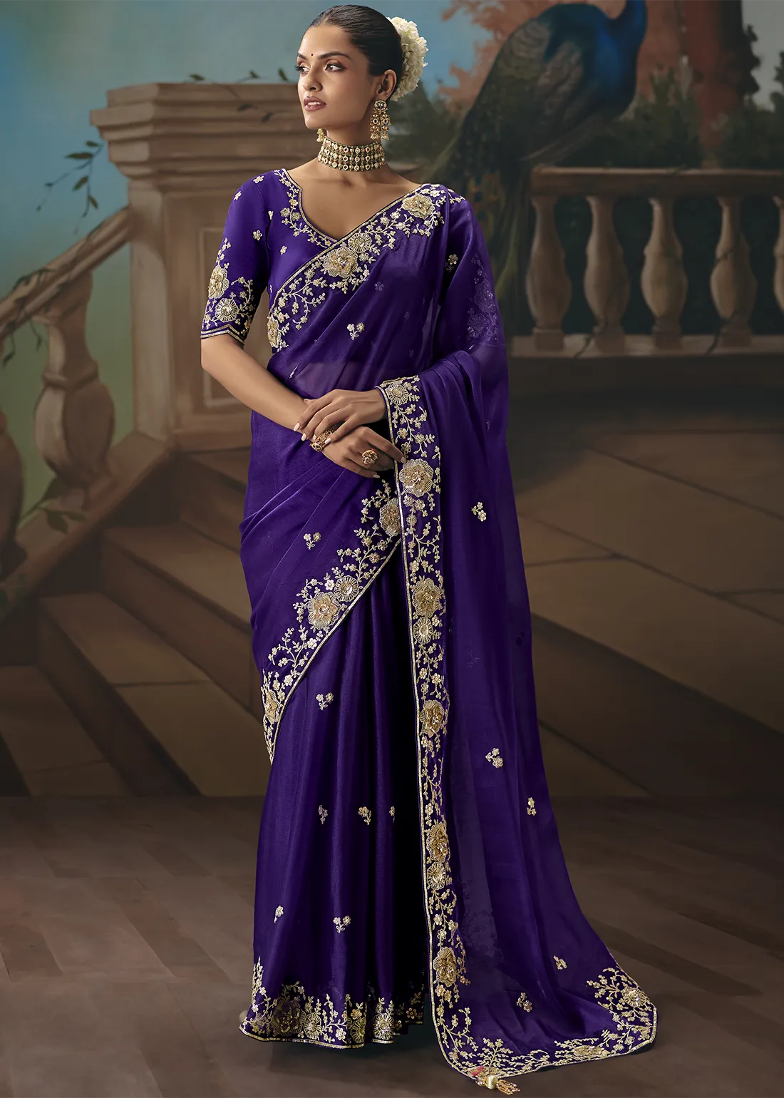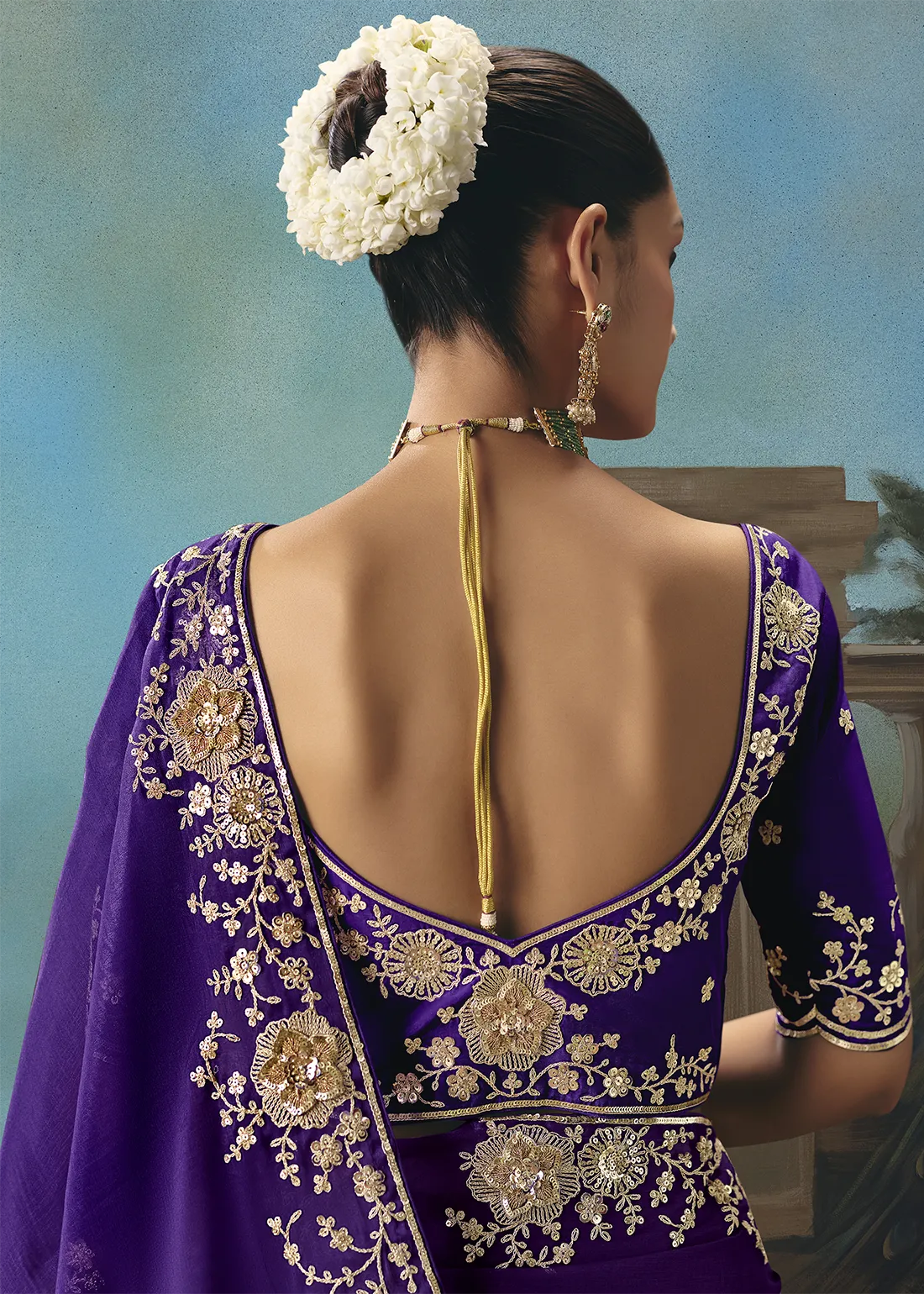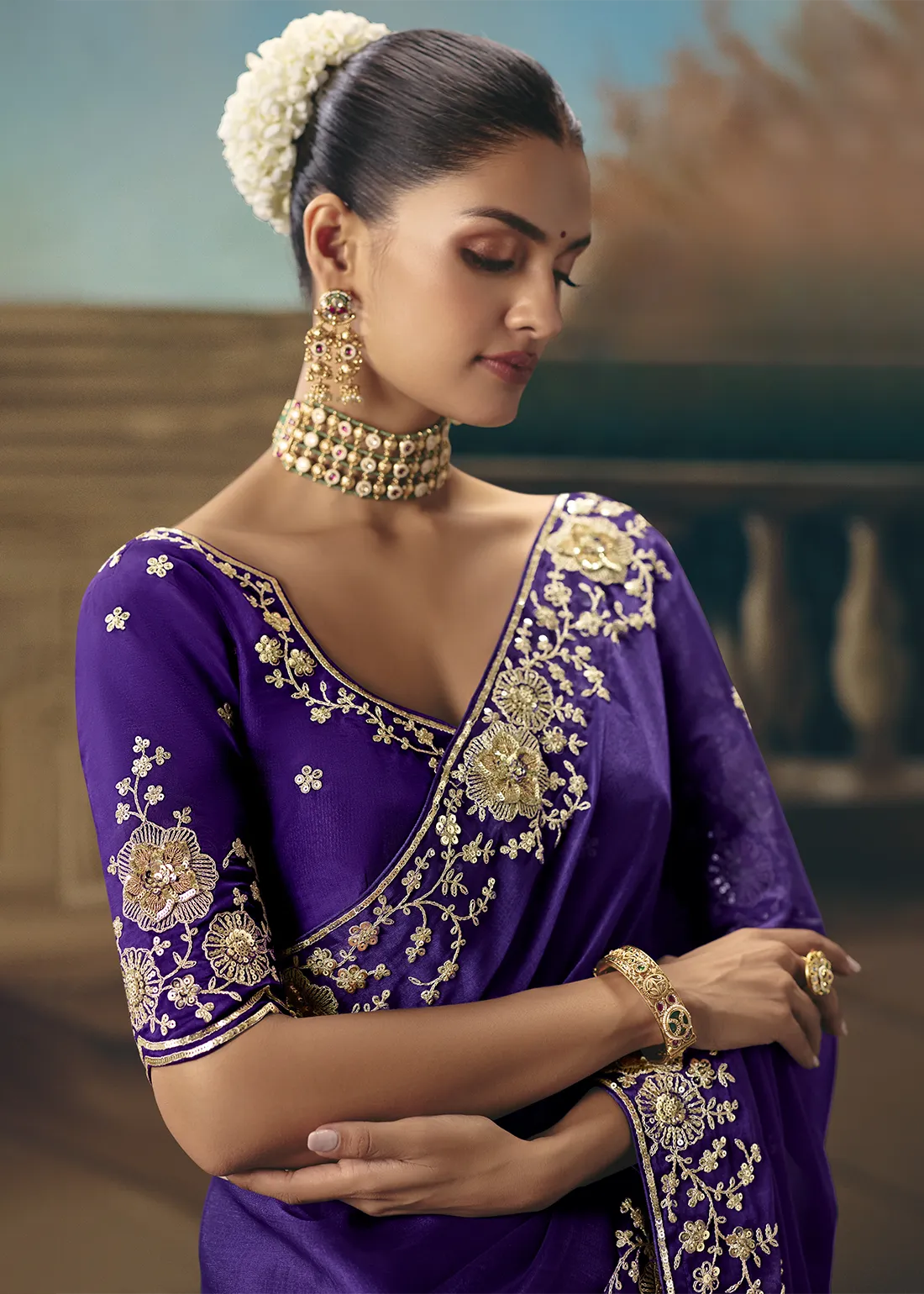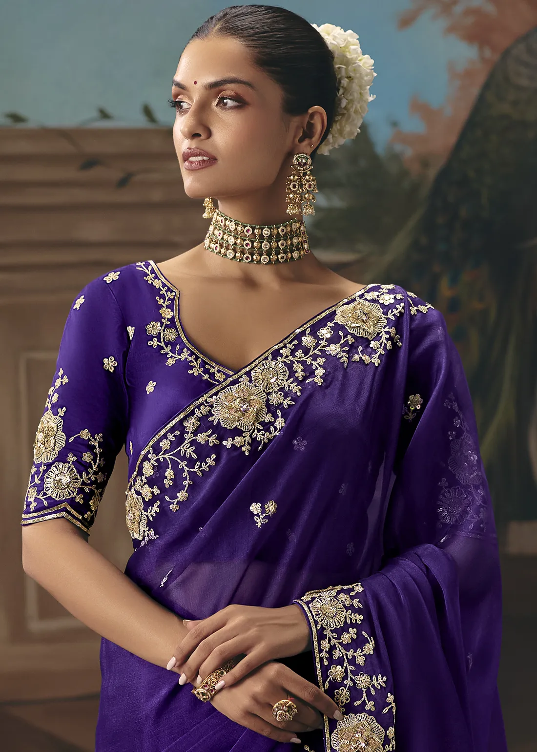 Embroidered Royal Purple Chiffon Saree with Embroidered Blouse