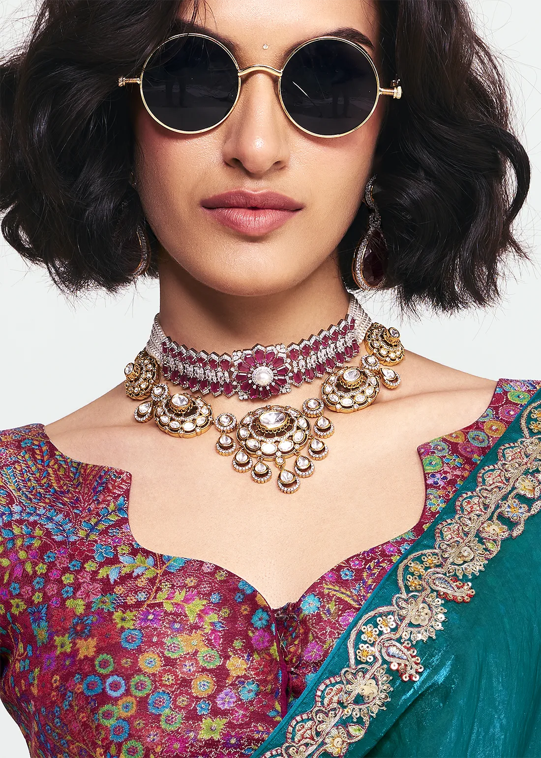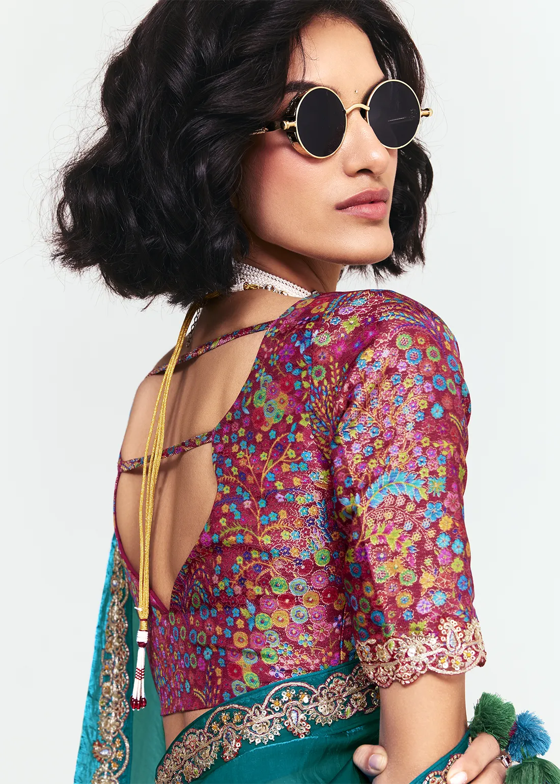 Embroidered Teal Chiffon Saree with Magenta Blouse