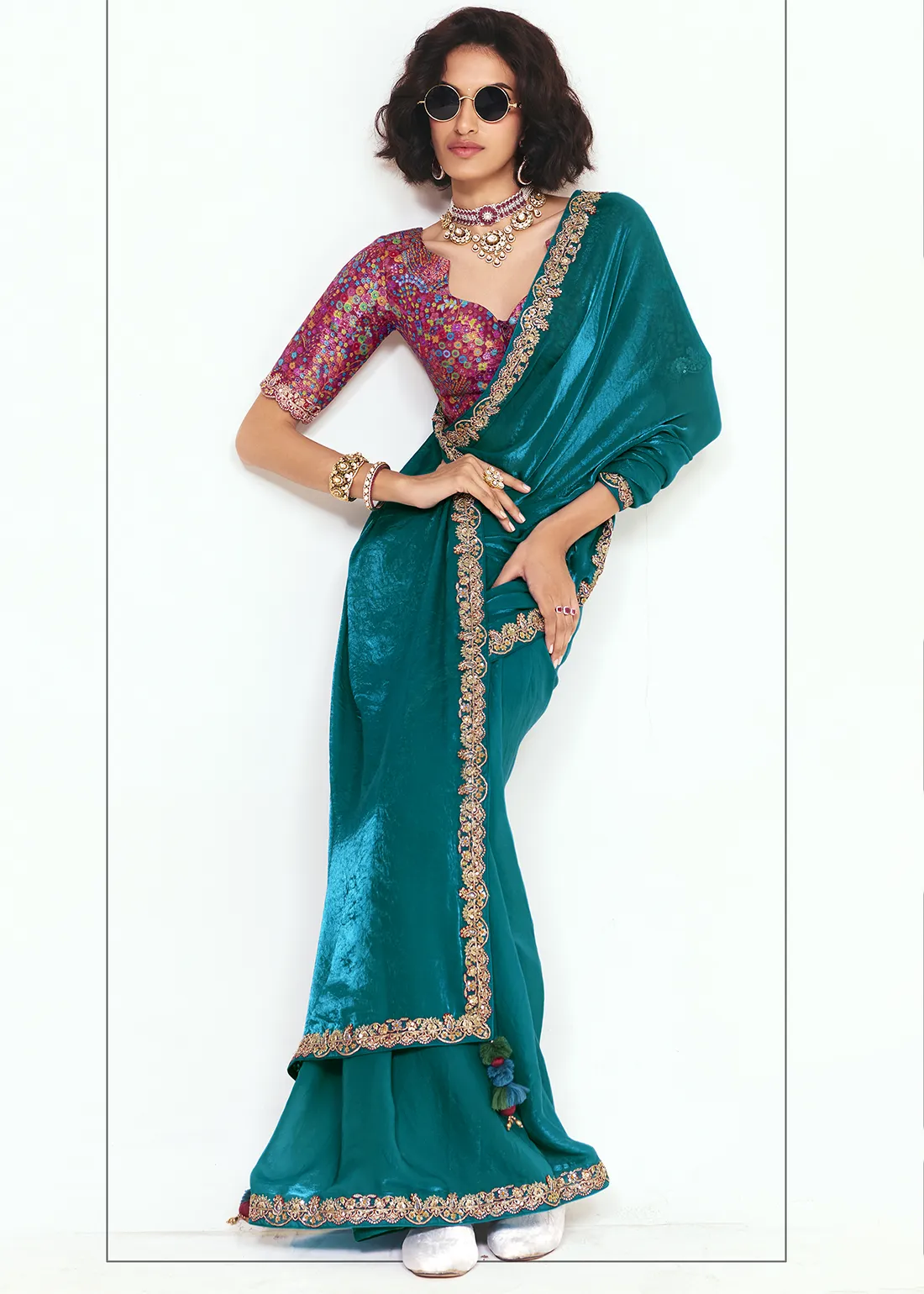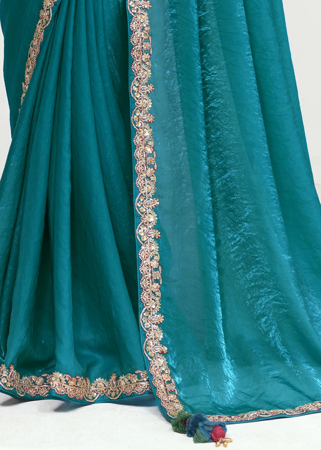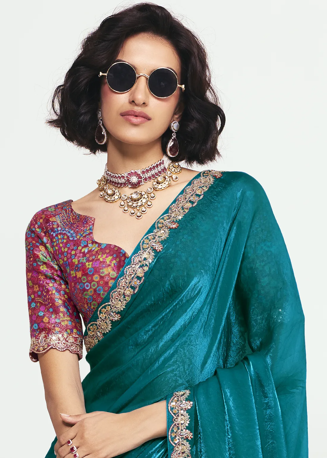 Step into effortless elegance with our Designer Embroidered Teal Chiffon Saree, specially curated for summer parties, cocktail evenings, and elegant celebrations. Crafted in lightweight, chiffon, this saree is delicately beautified with sequins, dhaga, and intricate thread embroidery, creating a refined shimmer that feels luxurious yet breathable.