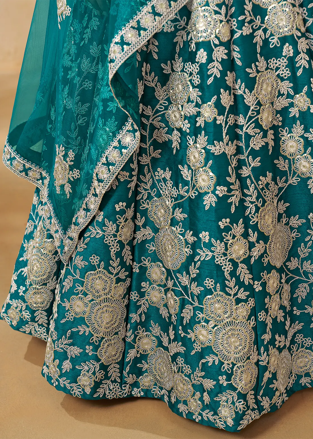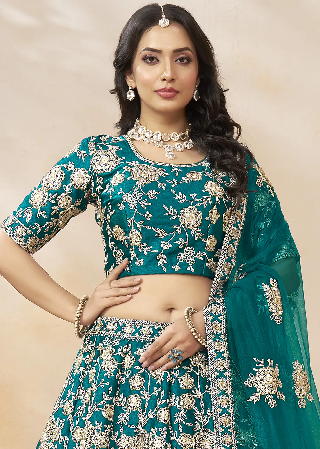 Embroidered Teal Silk Lehenga with Net Dupatta