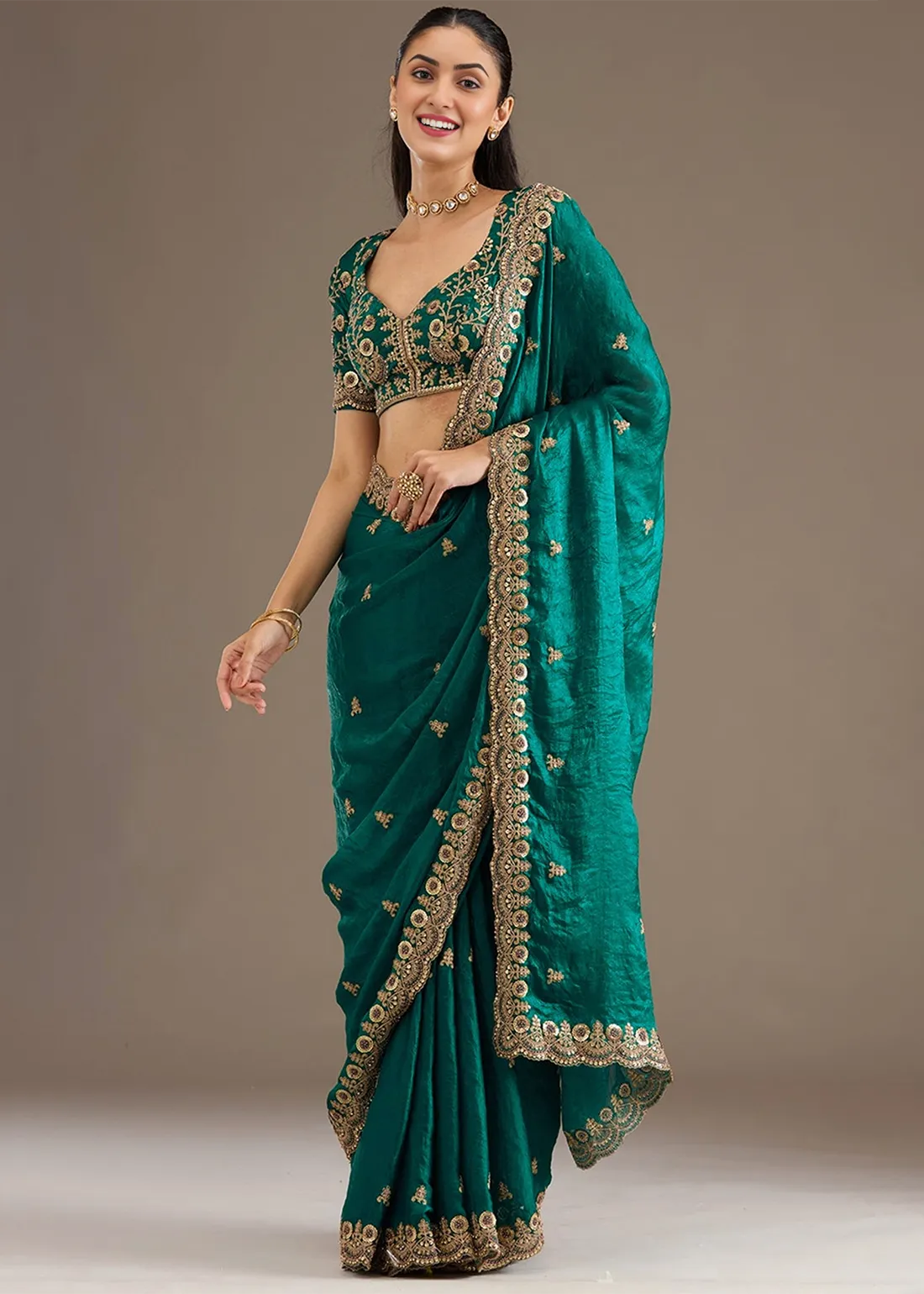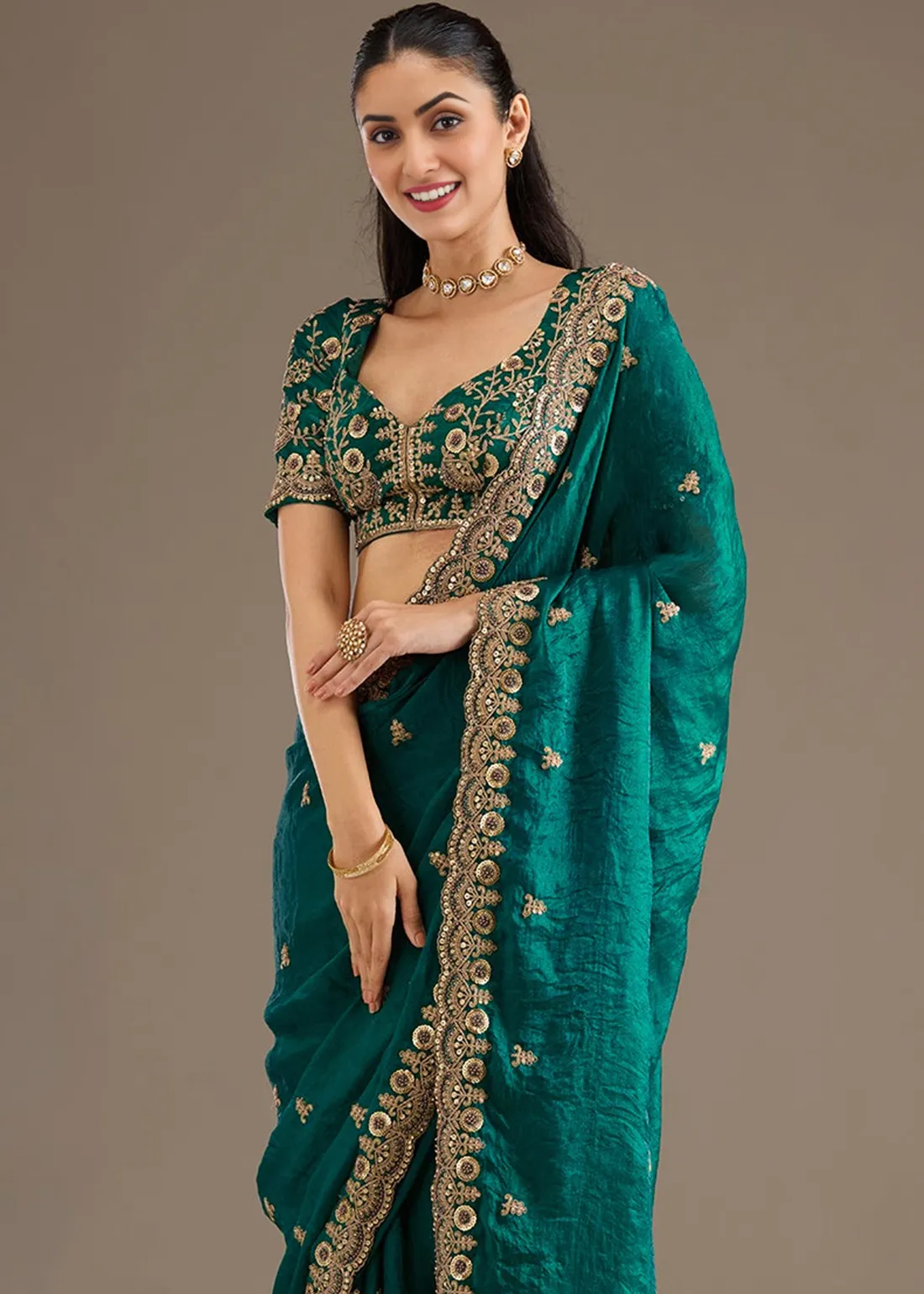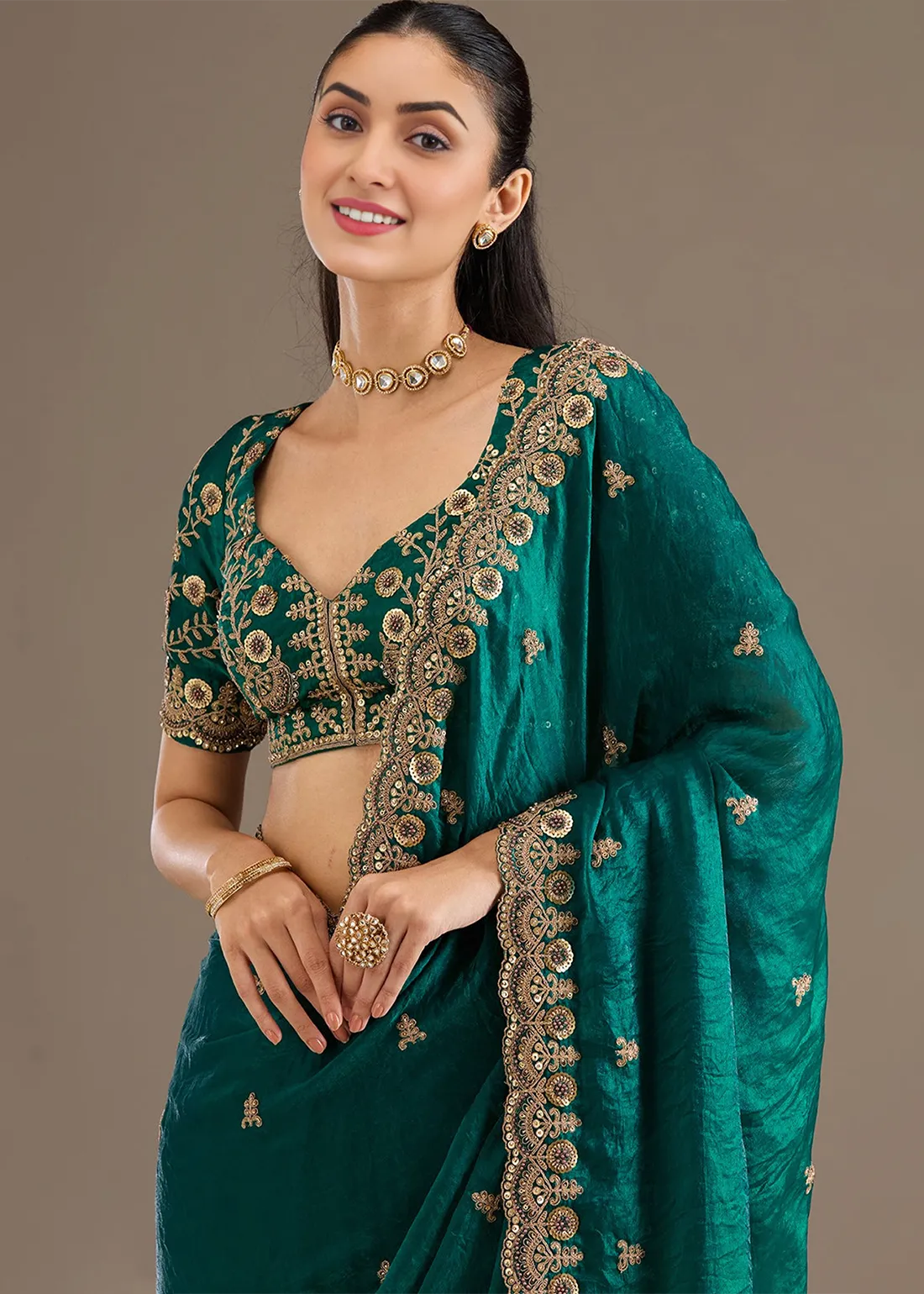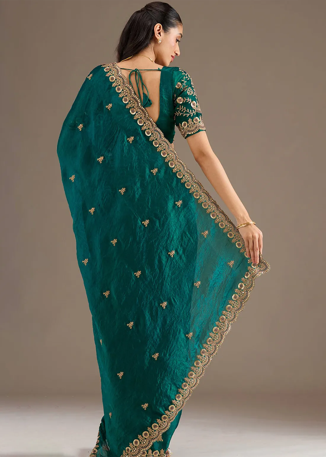 Saree: Shine in the spotlight with this exquisite Embroidered Teal Tissue Silk Saree, adorned with intricate resham, zari and sequins embroidery, complemented by stunning stone and beads handwork that showcases exceptional craftsmanship. This saree, with its luxurious and regal allure, captivates with every drape, making it a perfect choice for grand occasions such as weddings, festivals, or formal events. Embrace elegance and charm in this unforgettable embroidered masterpiece that is sure to leave a lasting impression.