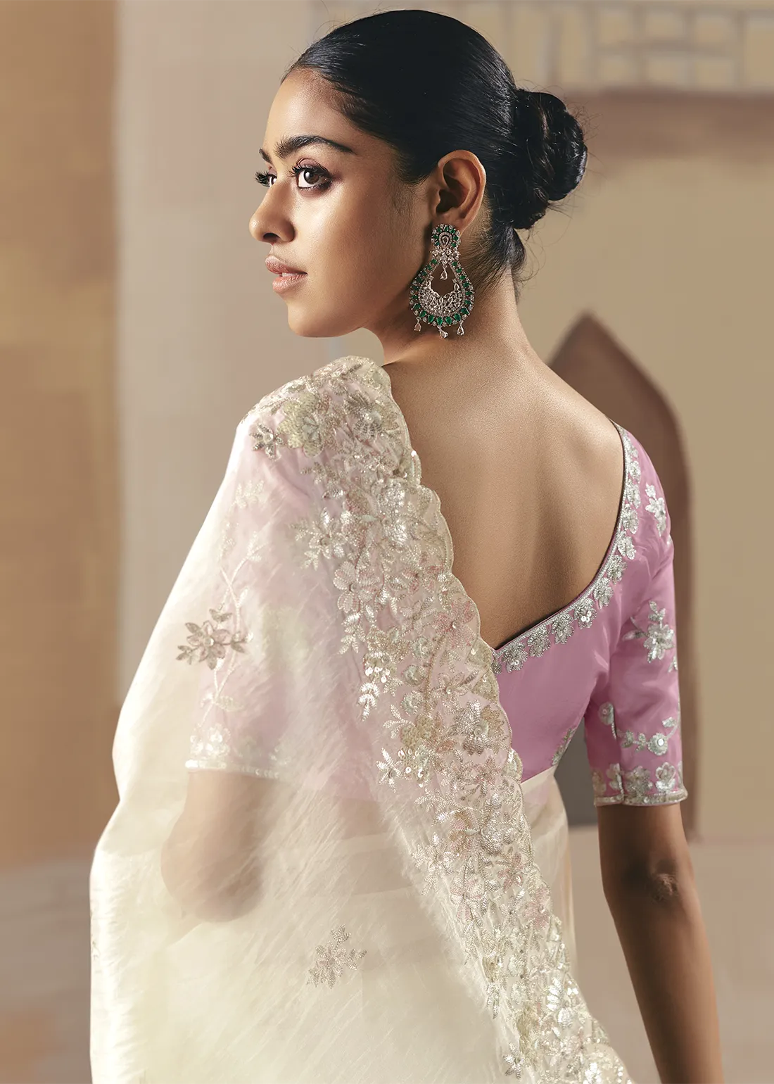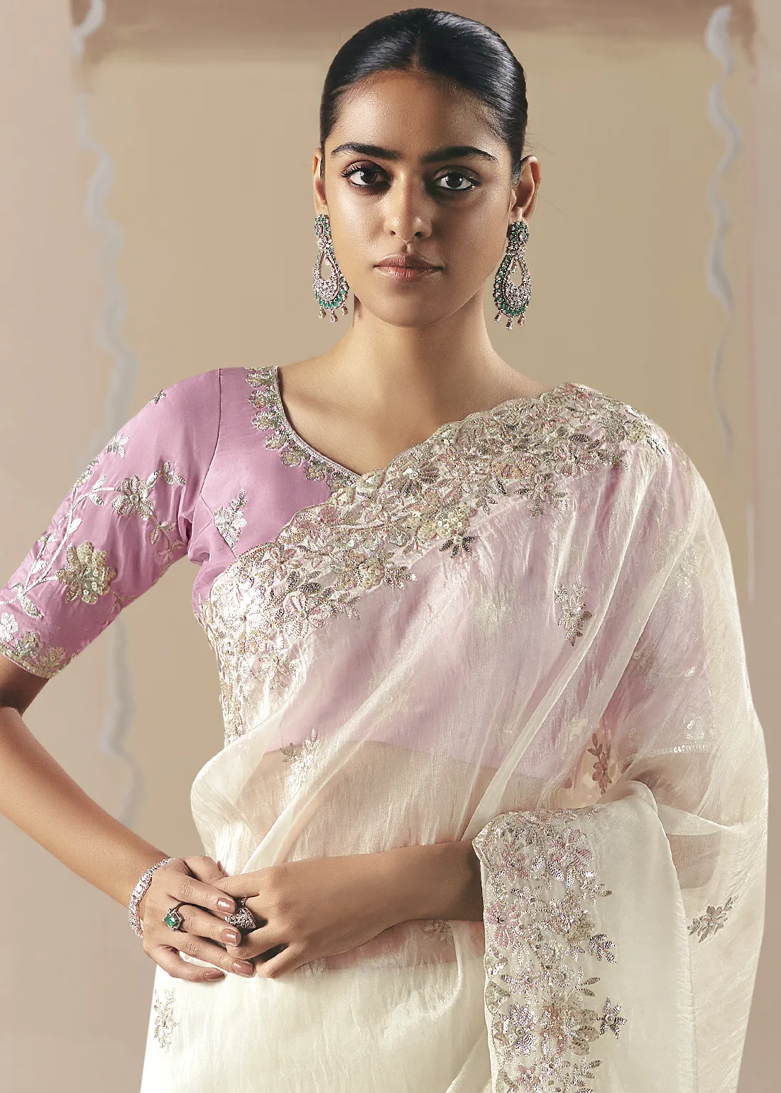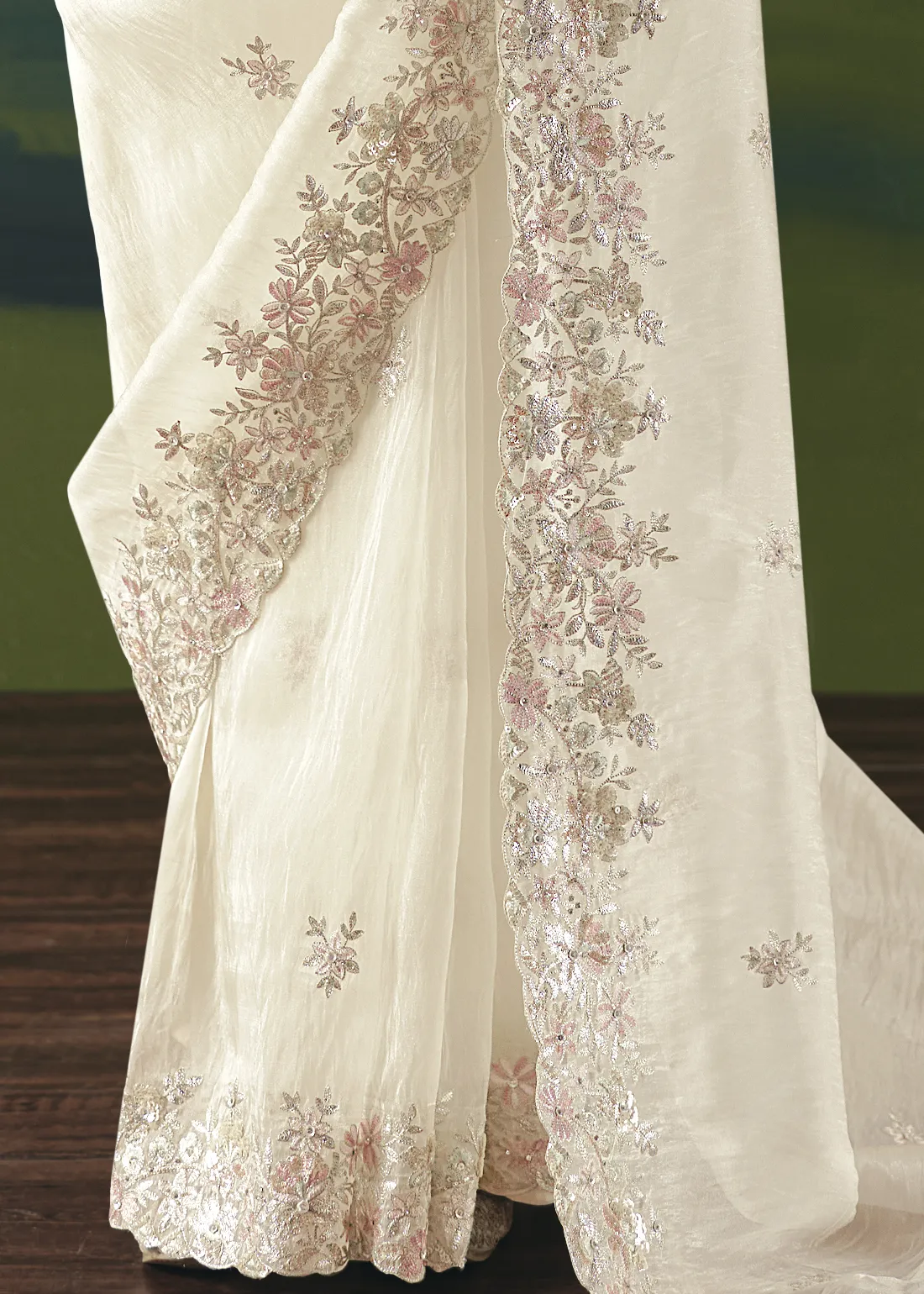 Embroidered Cream Organza Silk Saree with Sequins & Stone Work