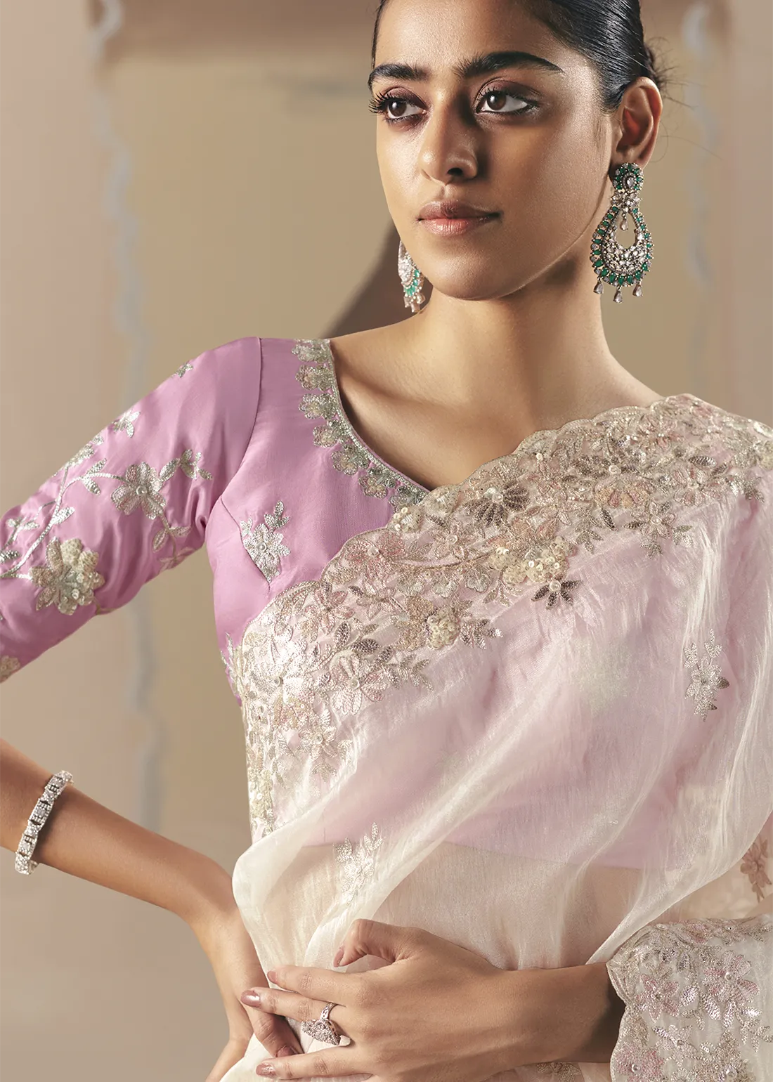 Embroidered Baby Pink Organza Silk Saree with Sequins & Stone Work
