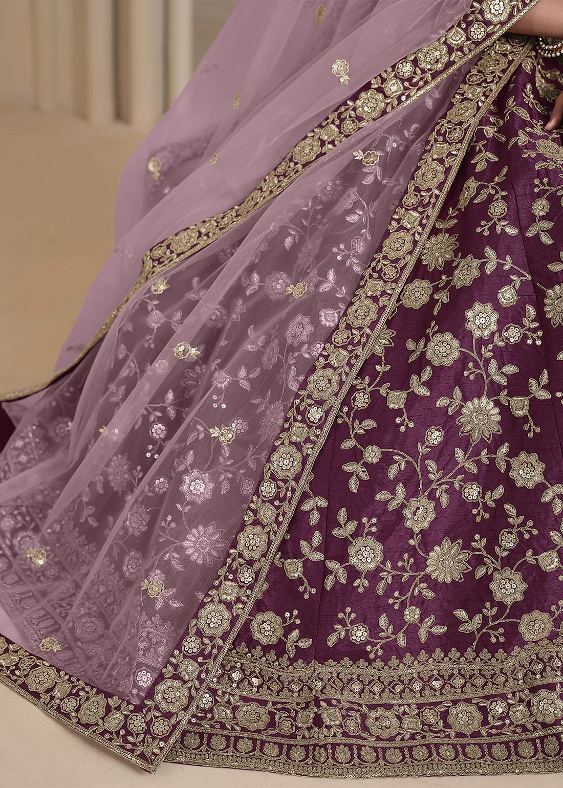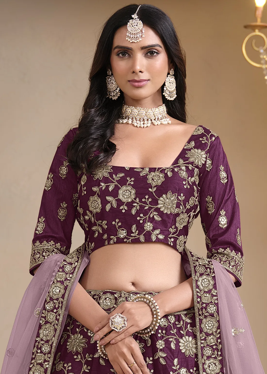 Embroidered Wine Silk Lehenga with Net Dupatta