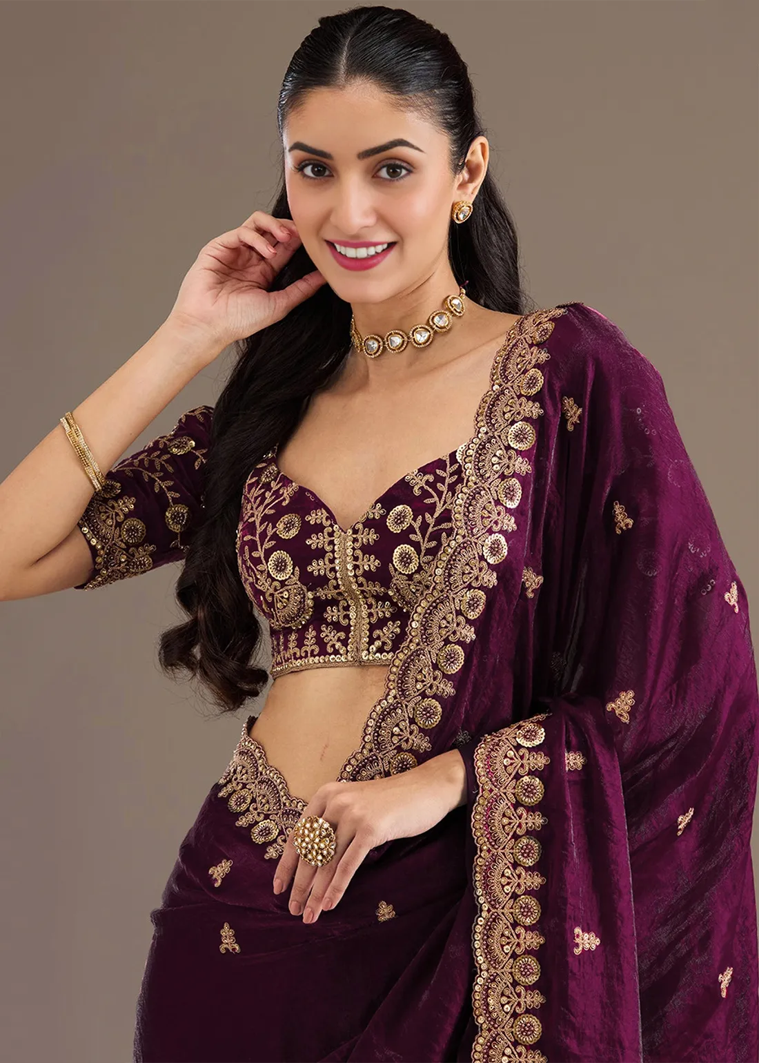 Embroidered Wine Chiffon Saree