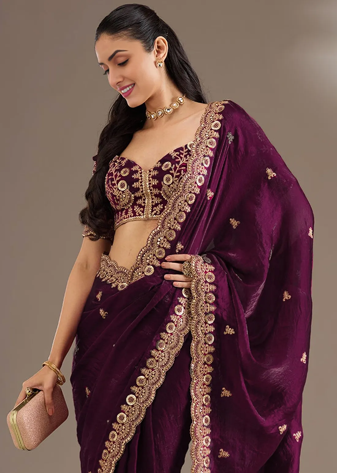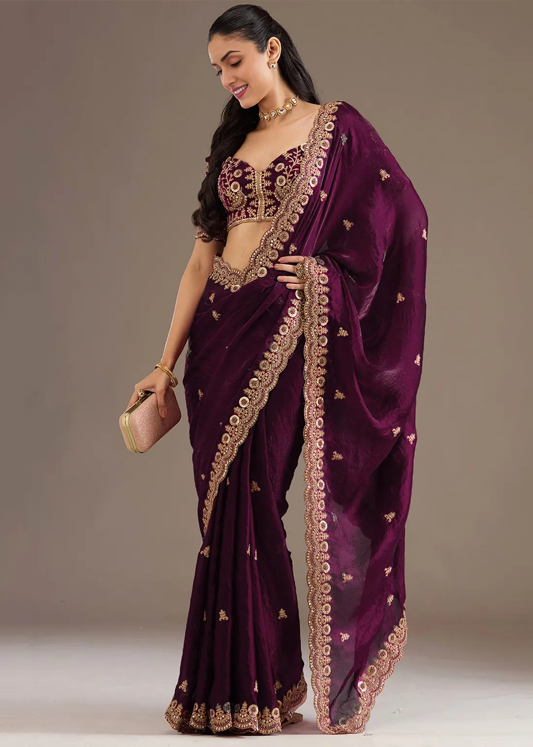 Wine Purple Banarasi Silk Saree with Stone Work