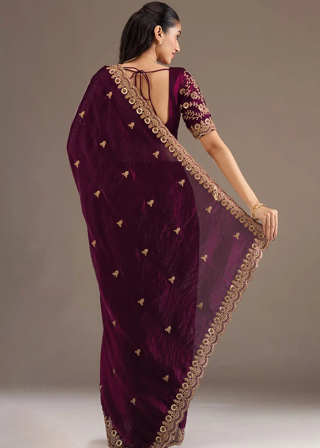 Embroidered Wine Tissue Silk Saree