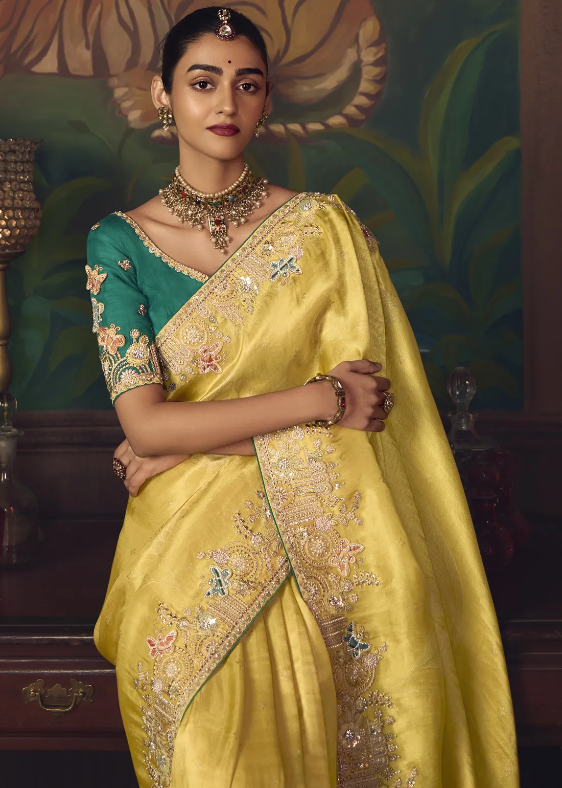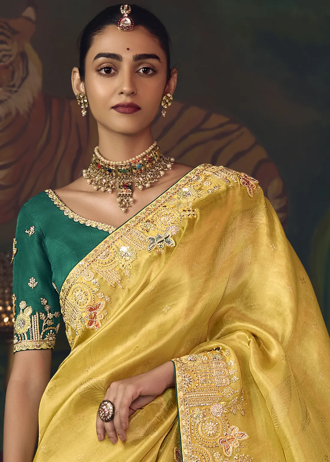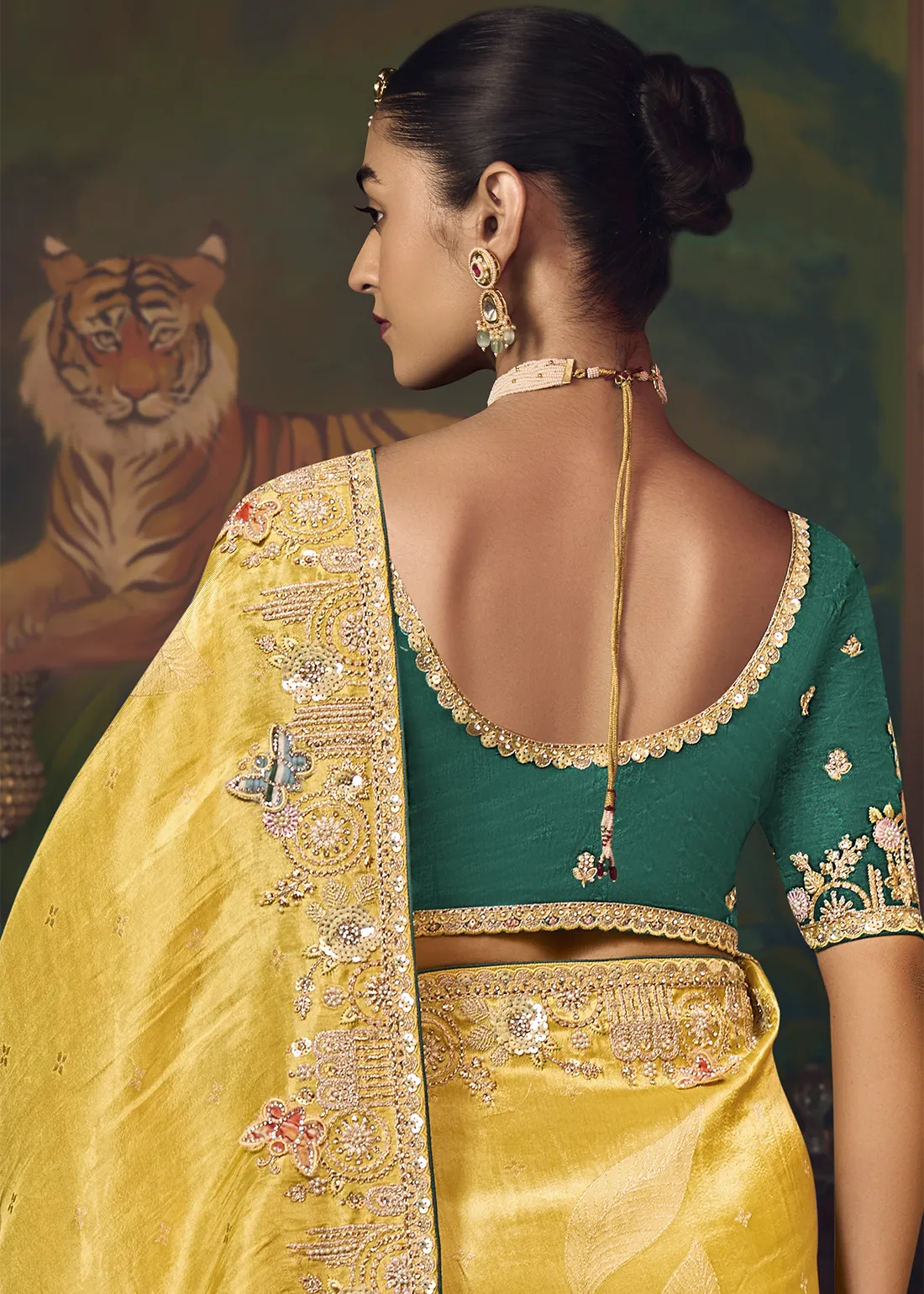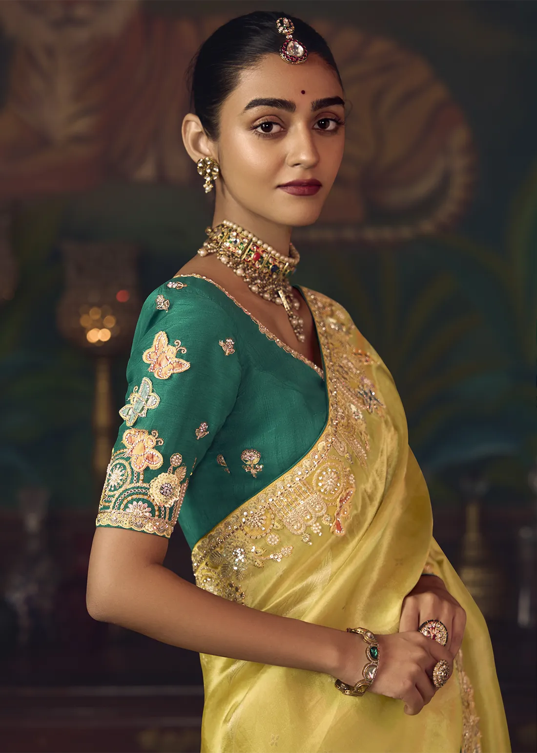 Embroidered Yellow Kanjivaram Silk Saree with Teal Blouse