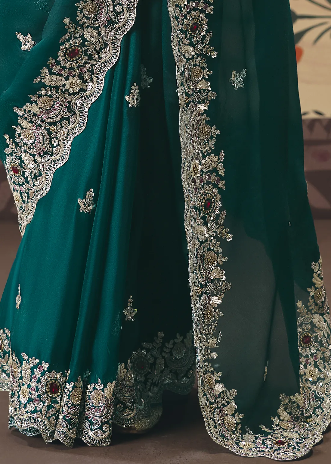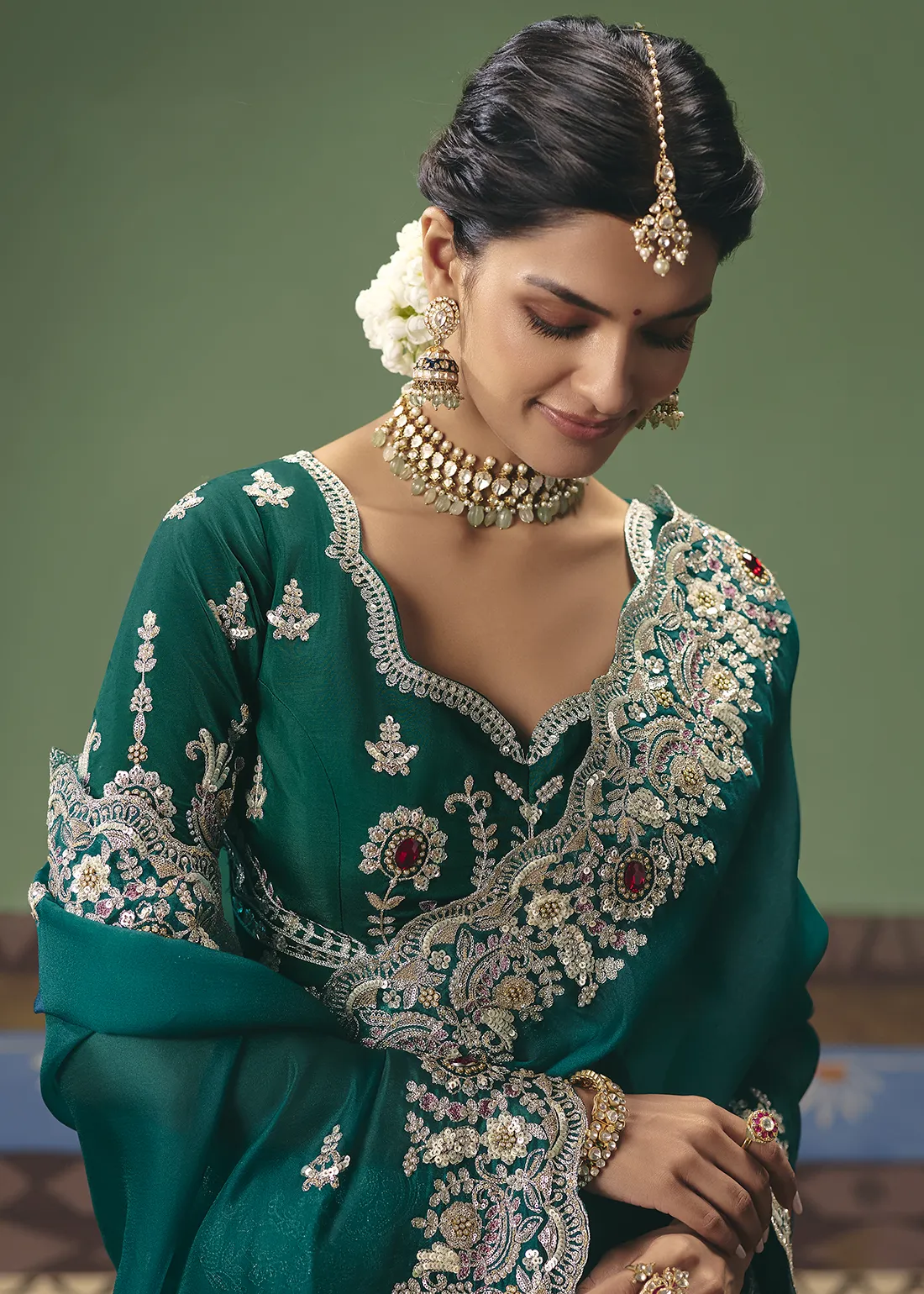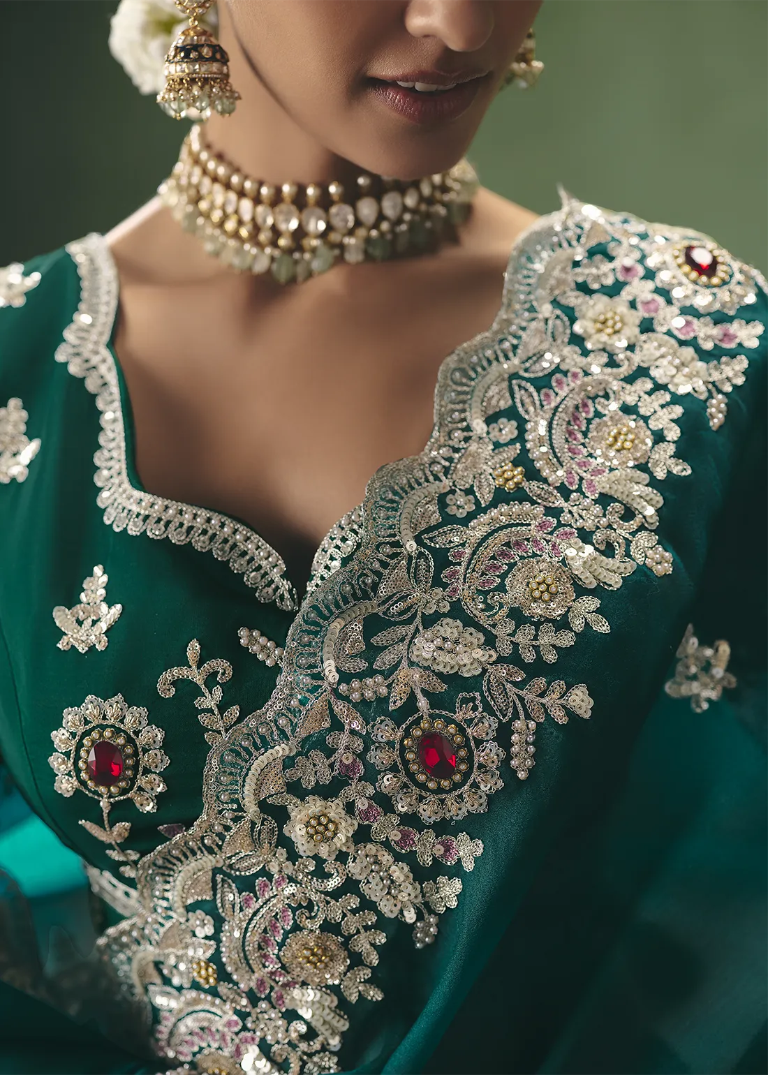 Saree: Command the room with this majestic Emerald Green Embroidered Organza Saree. The sheer, lightweight drape of premium organza provides a rich, jewel-toned canvas for delicate silver-toned floral threadwork. The true masterpiece is the exquisite, heavily scalloped border—lavishly hand-embellished with intricate zari, shimmering sequins, pearl-like beads, and striking ruby-red stone accents. Designed for modern royalty, this drape is the ultimate choice for bridal receptions, bridesmaids, and glamorous evening galas.