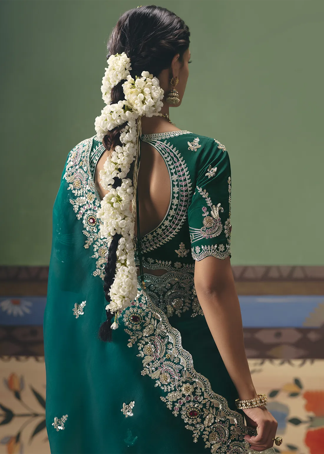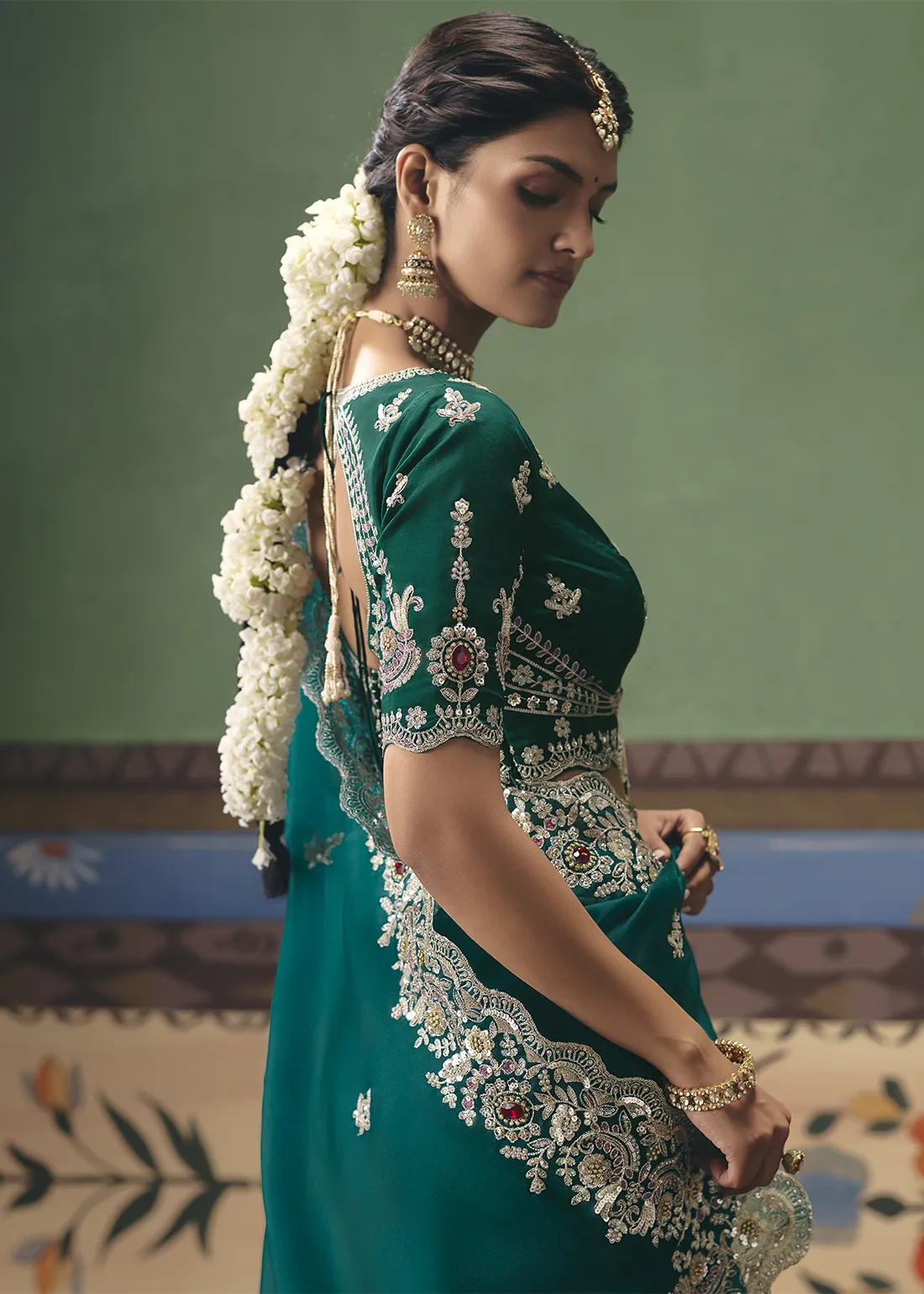 Blouse: Includes a matching Emerald Green unstitched blouse piece that perfectly mirrors the saree’s opulence. Featuring heavy, coordinating embroidery with zari, sequins, and rich red stonework, it allows you to tailor a flawless, couture-level designer ensemble.