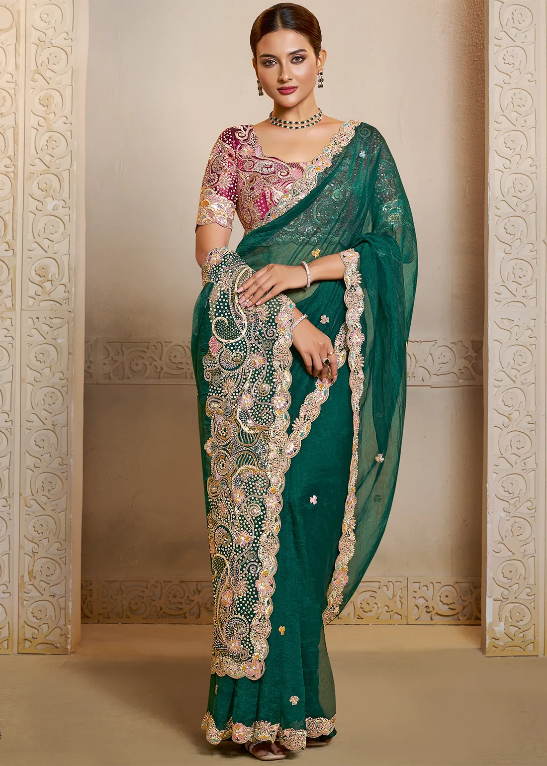 Emerald Green Organza Saree with Heavy Embroidery, Stone & Sequin Work