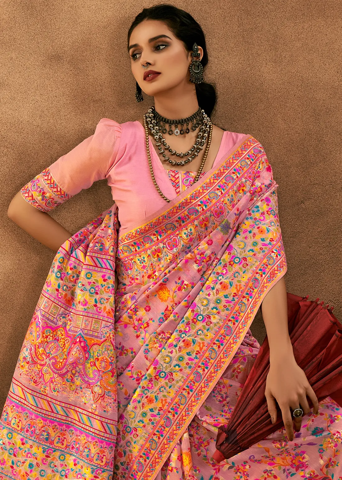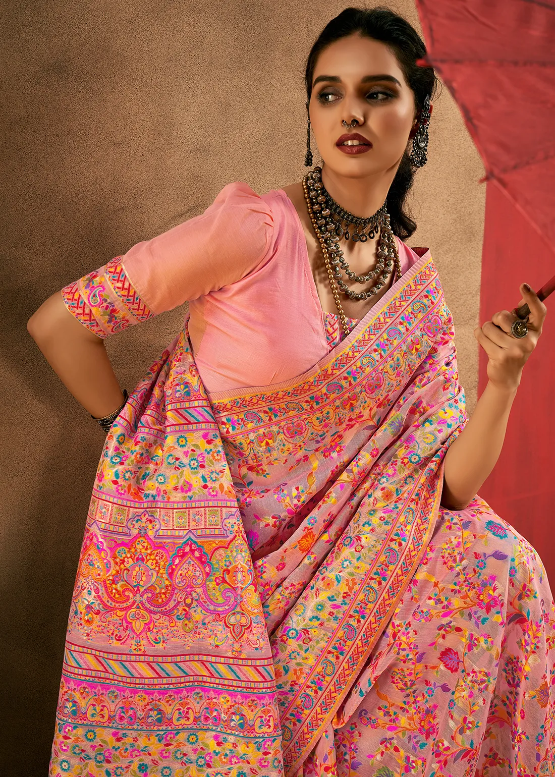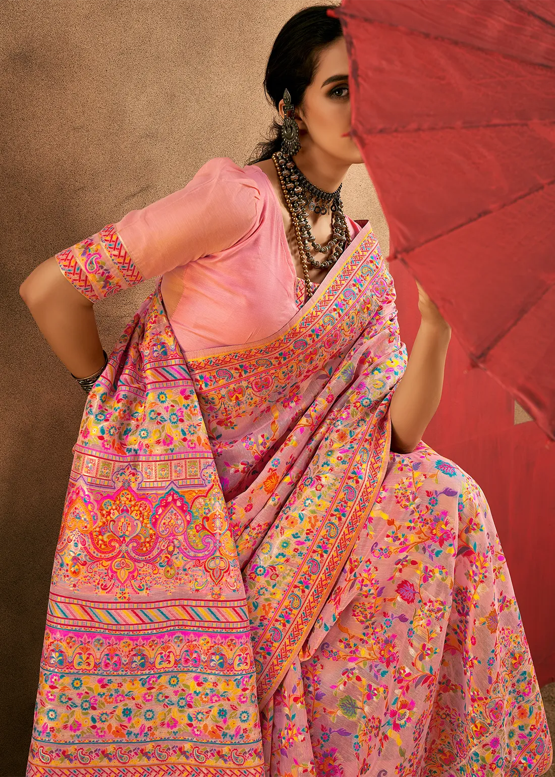 Flamingo Pink Kashmiri Jamawar Modal Cotton Saree