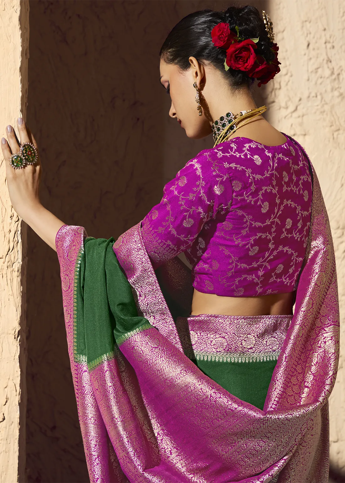 Stand out in regal elegance with this Forest Green Georgette Banarasi Saree, beautifully woven with a striking magenta-gold Zari border that blends tradition with contemporary vibrance. The soft georgette drape flows effortlessly, offering comfort while maintaining a rich festive appeal.