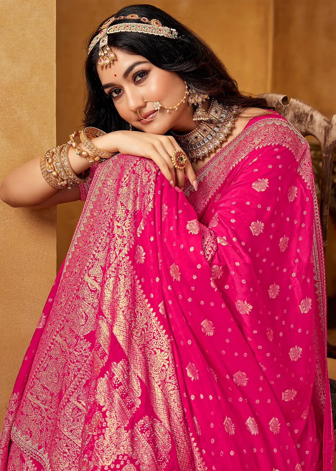 Step into timeless elegance with our Majestic Fuchsia Banarasi Silk Saree, an exquisite piece from our premium Banarasi Stone Work Collection. Crafted in a rich pink hue, this saree features intricate golden zari weaving, showcasing traditional temple-inspired motifs, and heritage patterns. Delicately placed handworked stones enhance the luxurious zari detailing, adding a subtle shimmer perfect for festive lights and wedding functions.