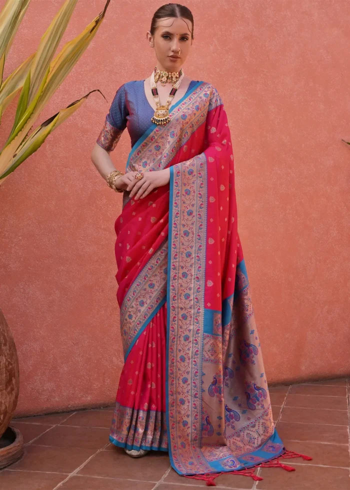 Fuchsia Paithani Silk Saree with Blue Blouse