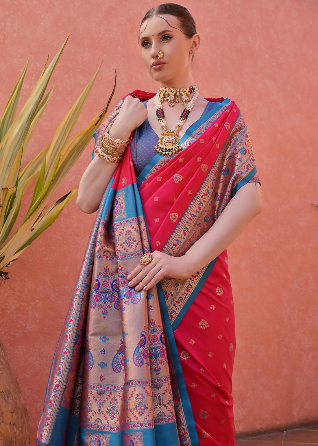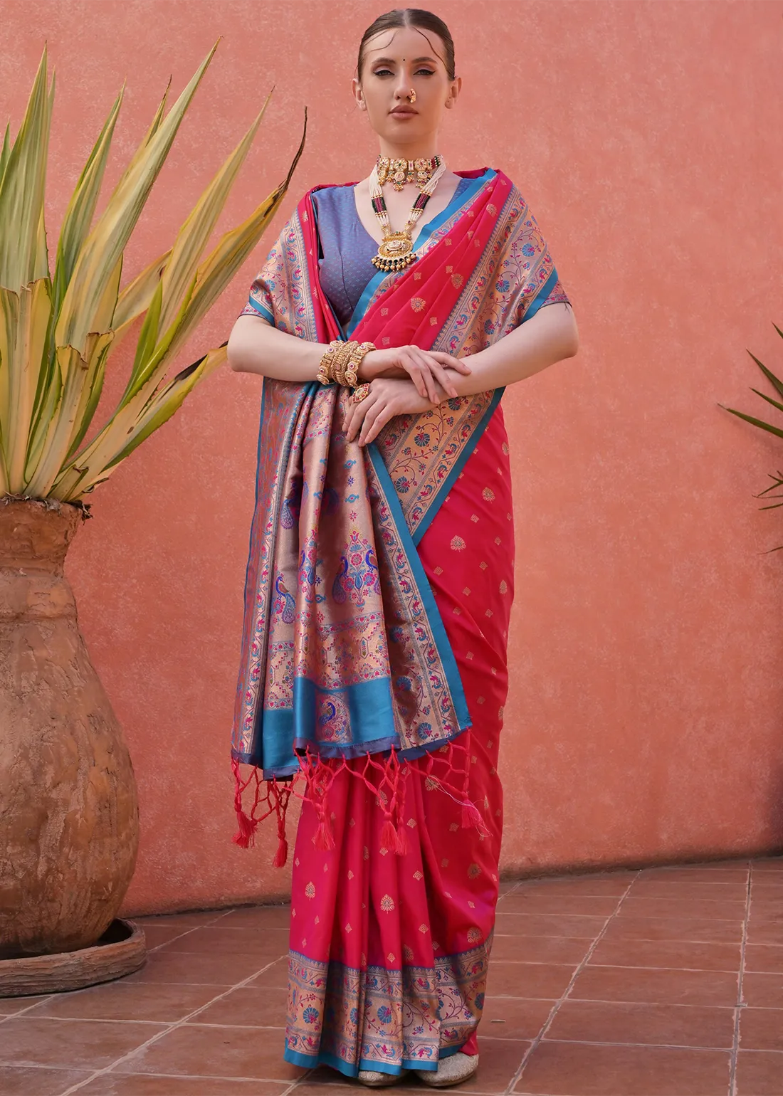 Raspberry Pink Paithani Silk Saree with Teal Blouse