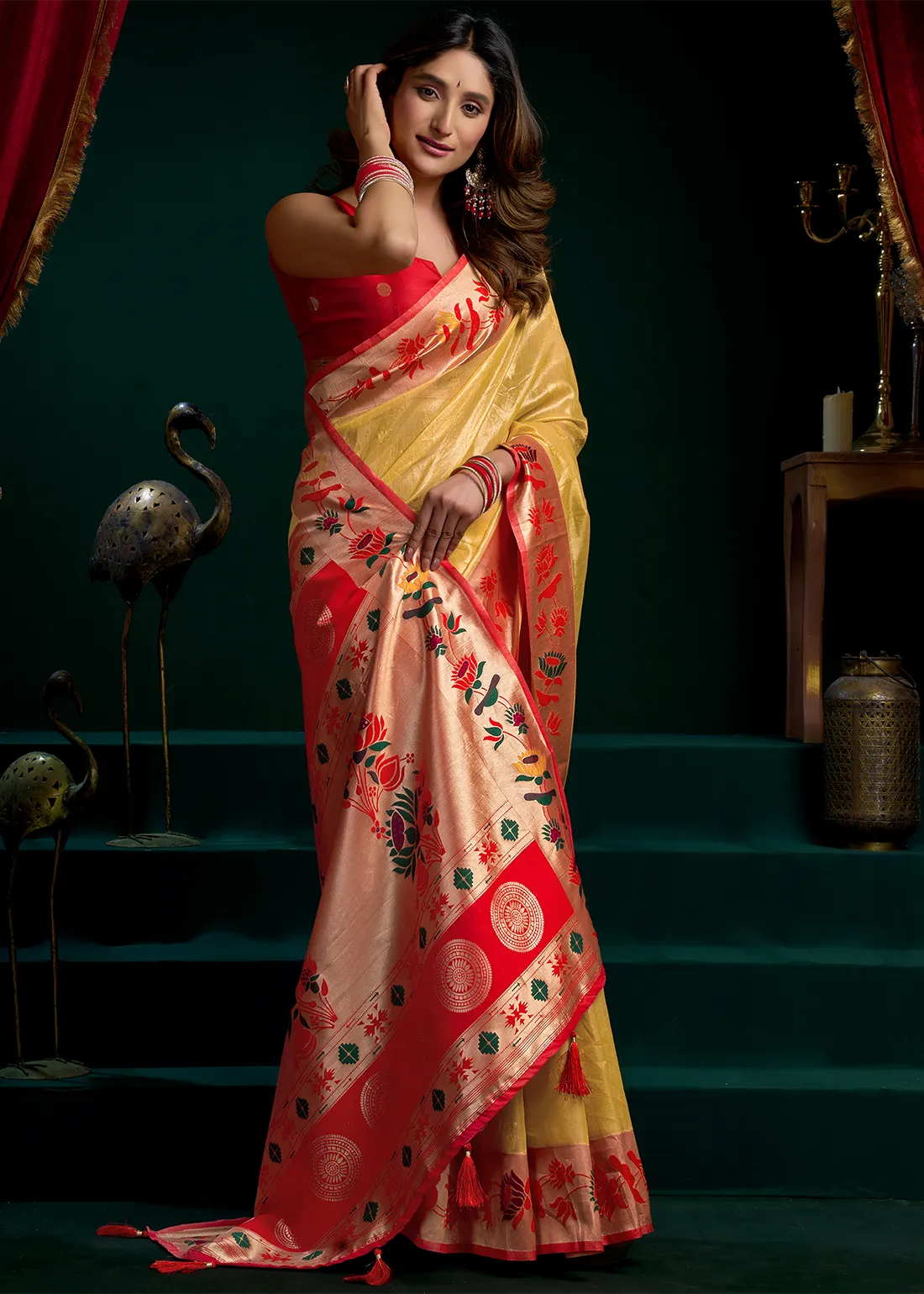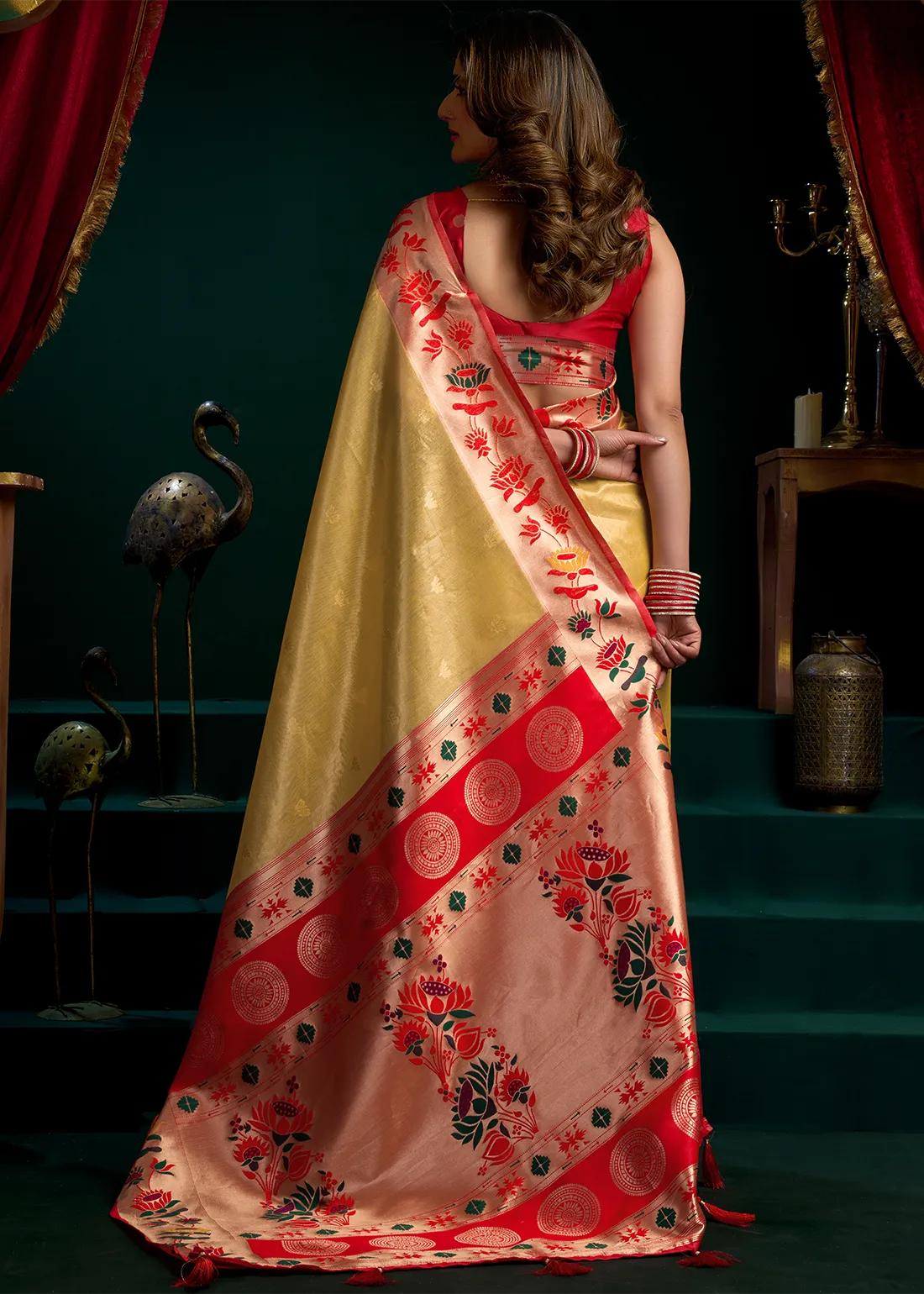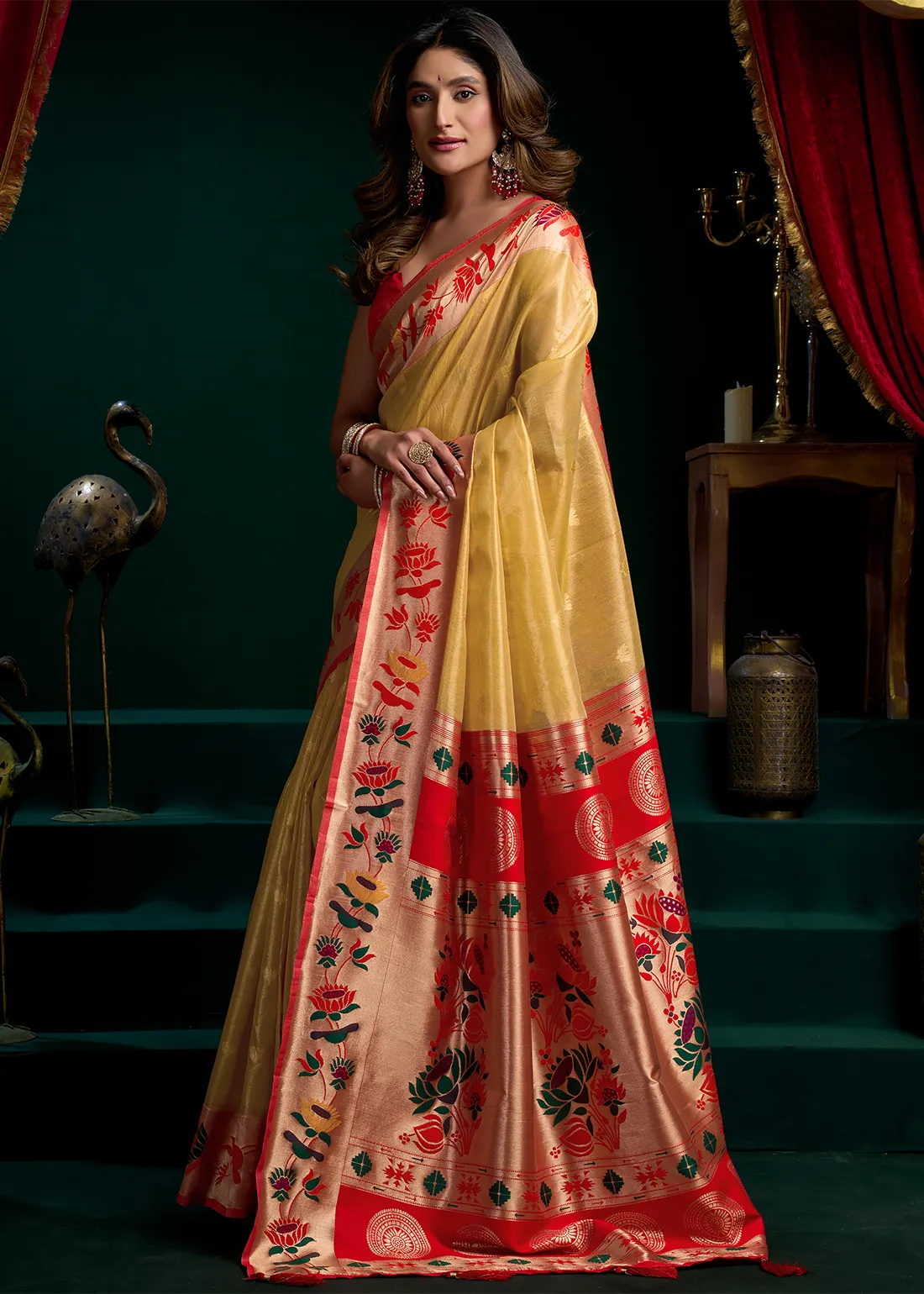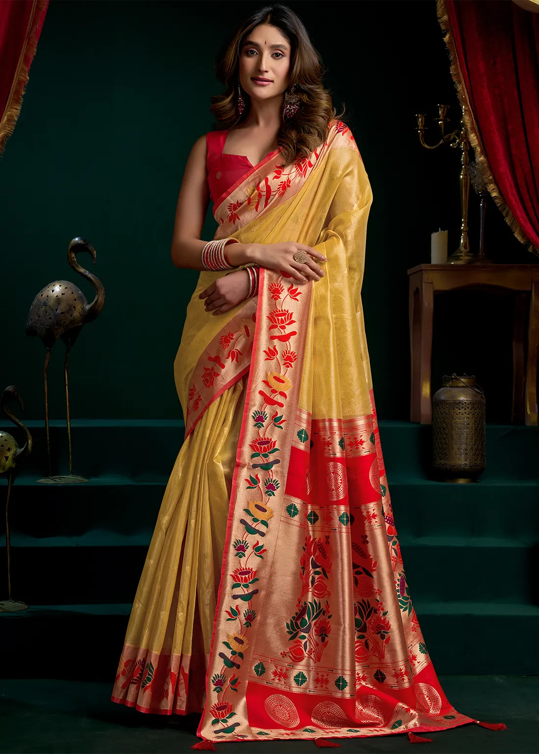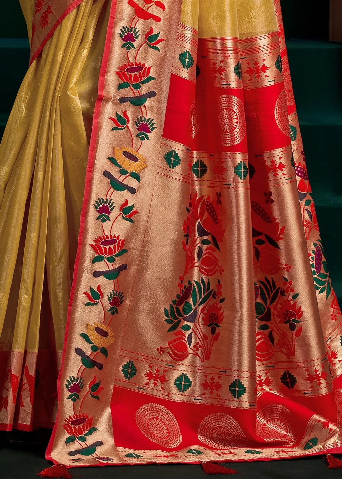 Golden Yellow Tissue Silk Paithani Saree with Red Blouse