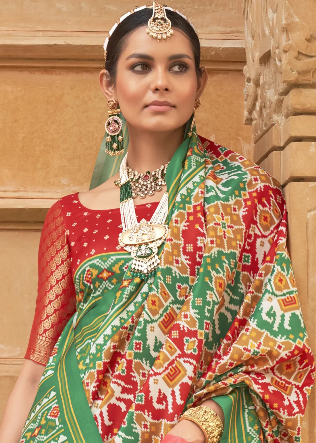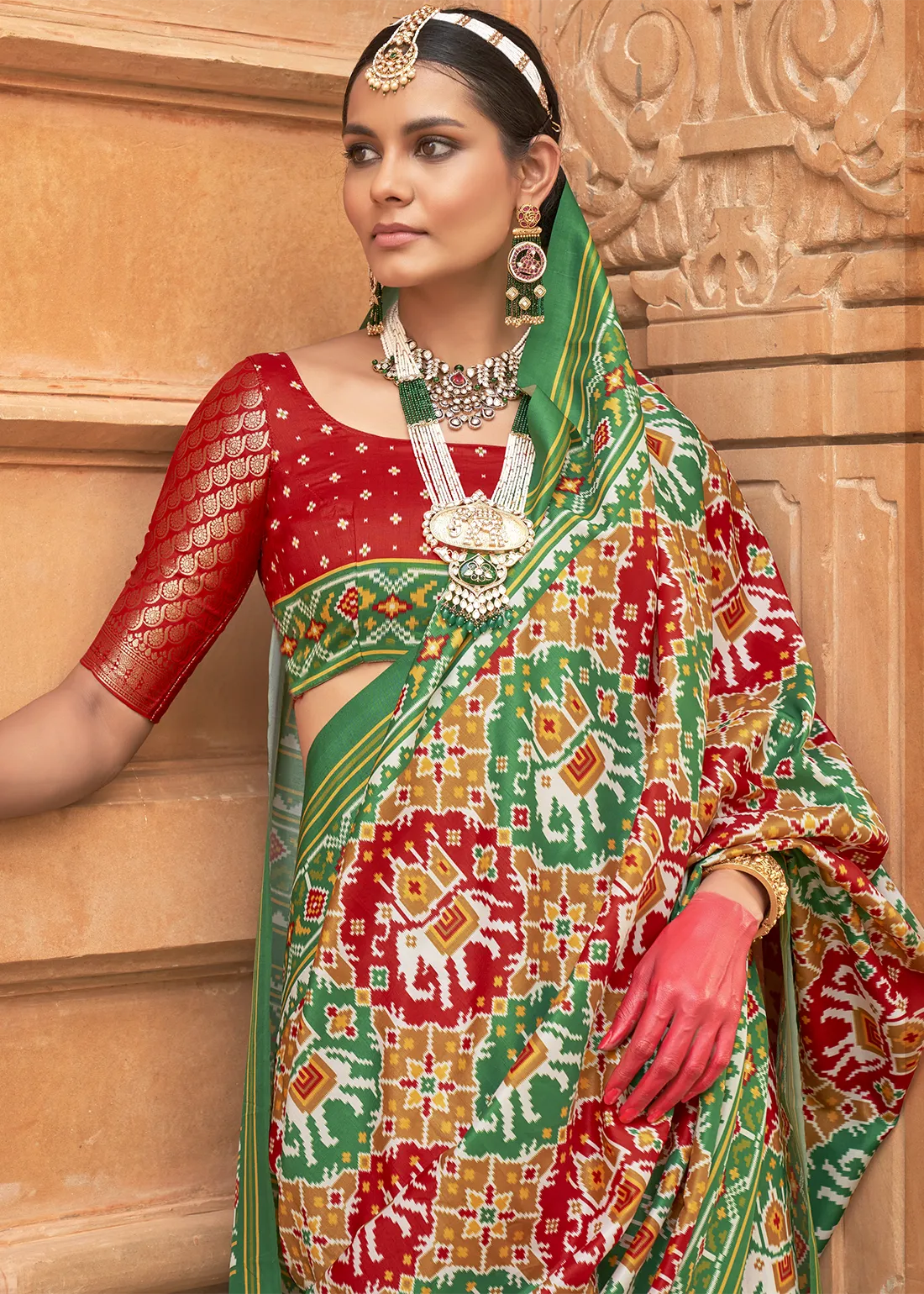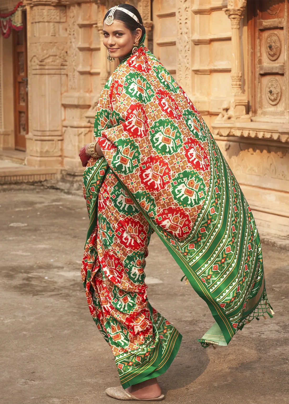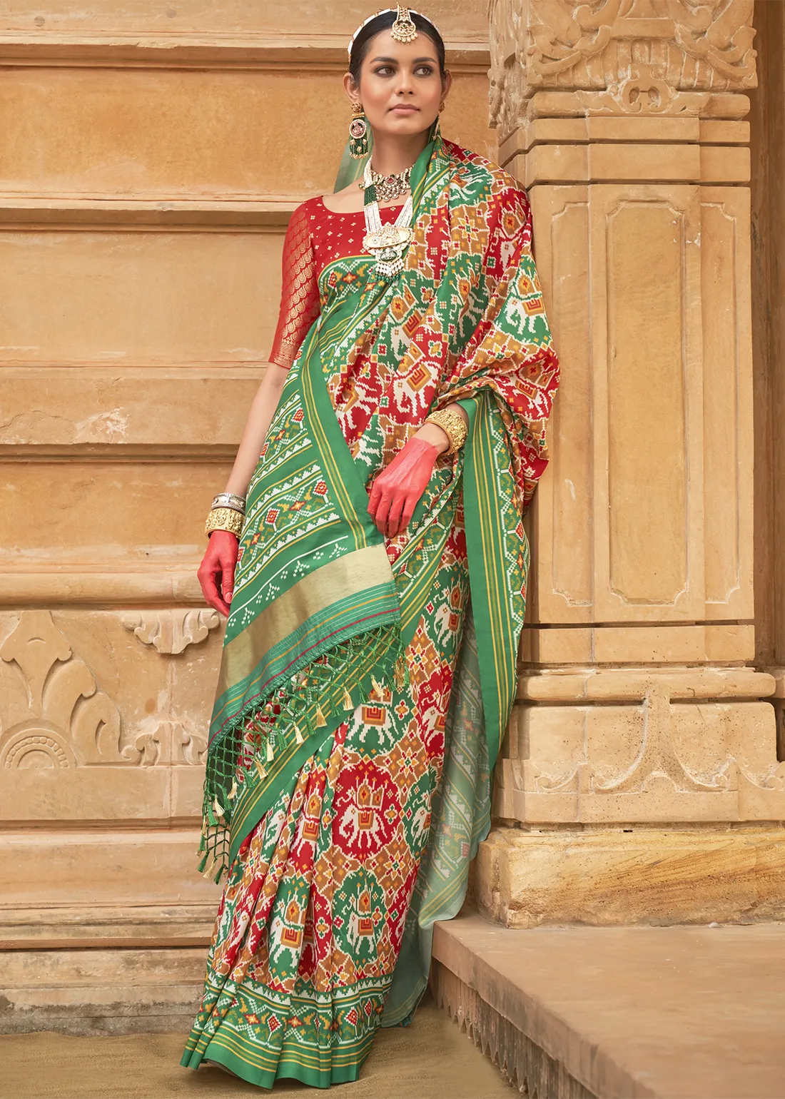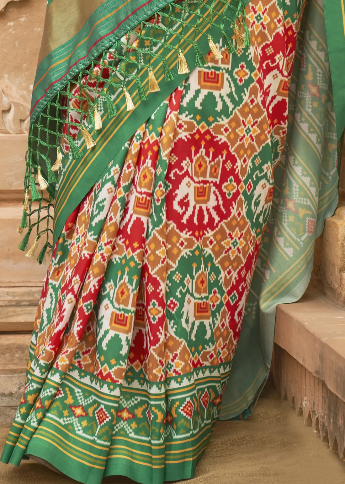 Green and Red Printed Patola Silk Saree