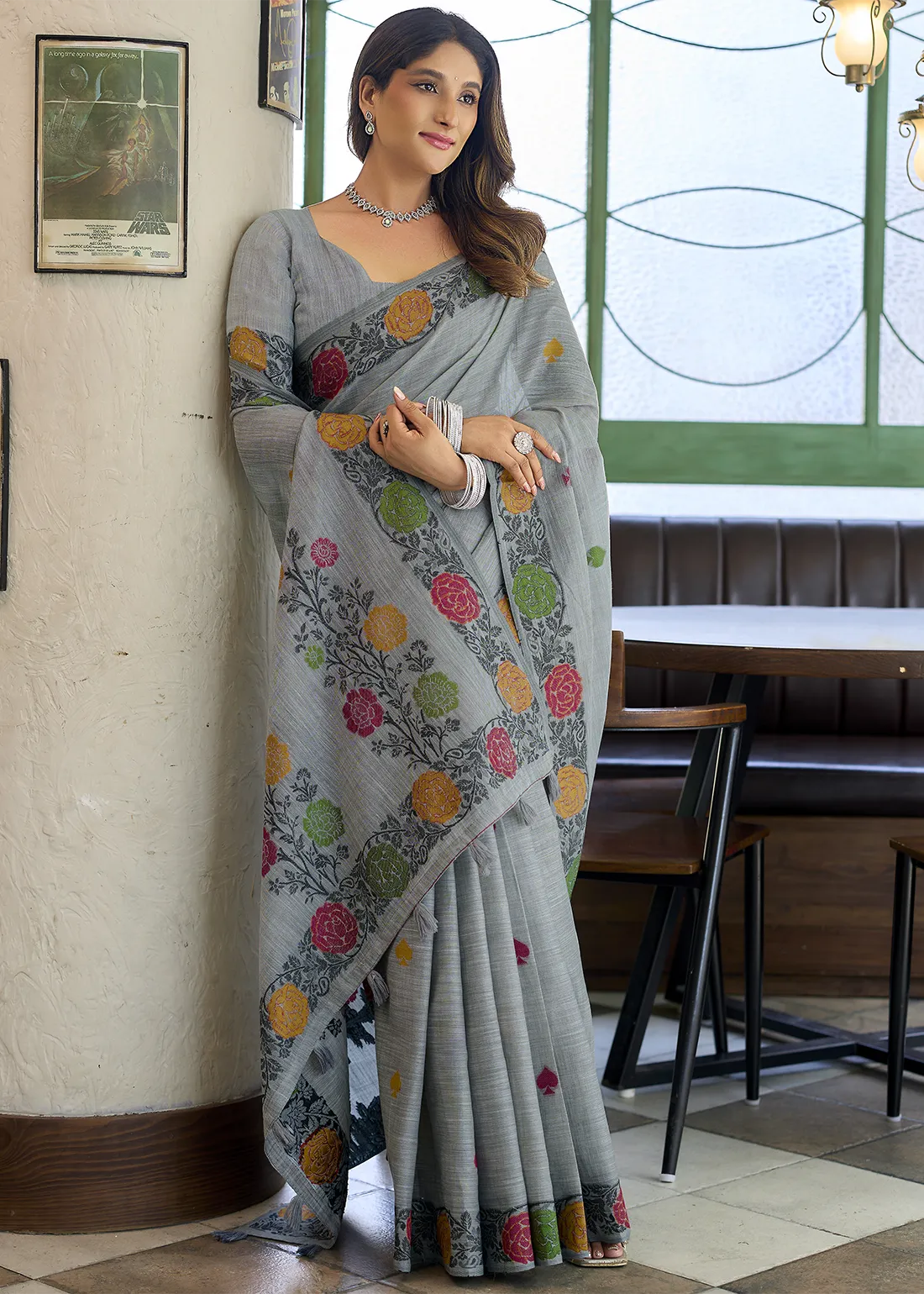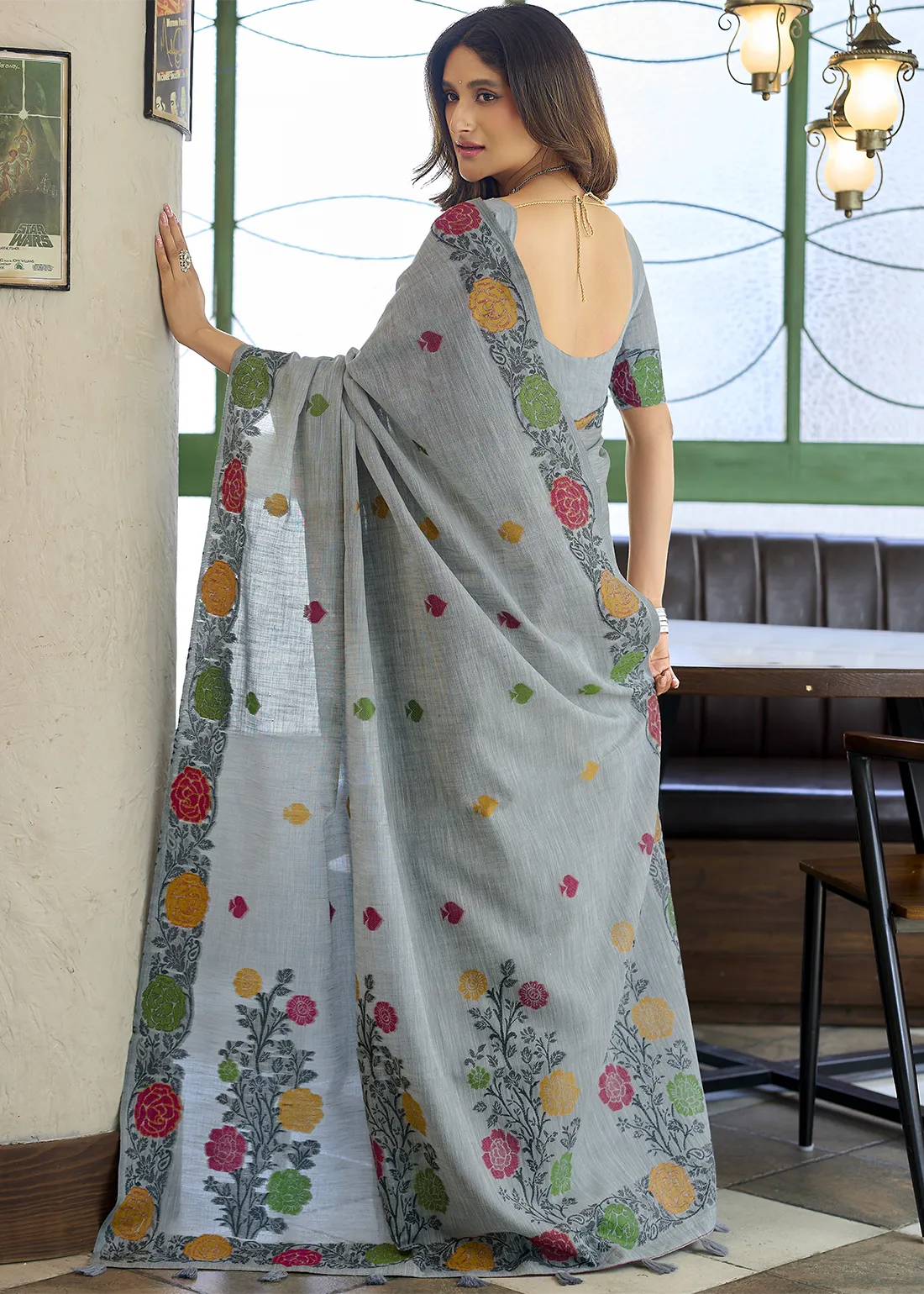 Saree: Crafted from a lightweight linen, this Grey Linen Saree features delicate woven floral motifs that add a subtle pop of color against the serene base. The pallu is adorned with larger, artistic floral patterns that enhance its visual appeal, while the tasseled pallu gives it a refined finish. Ideal for festive occasions, daytime events, or casual celebrations, this saree ensures you look graceful and poised without compromising on comfort.