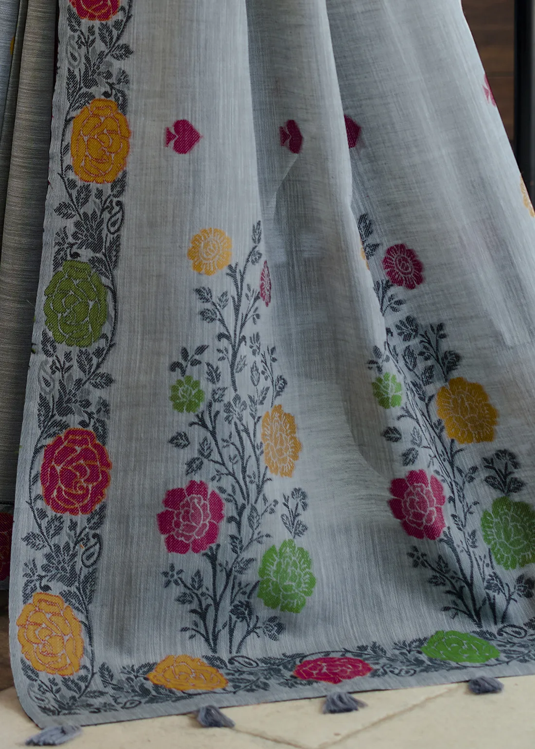Grey Woven Linen Saree with Floral Motifs