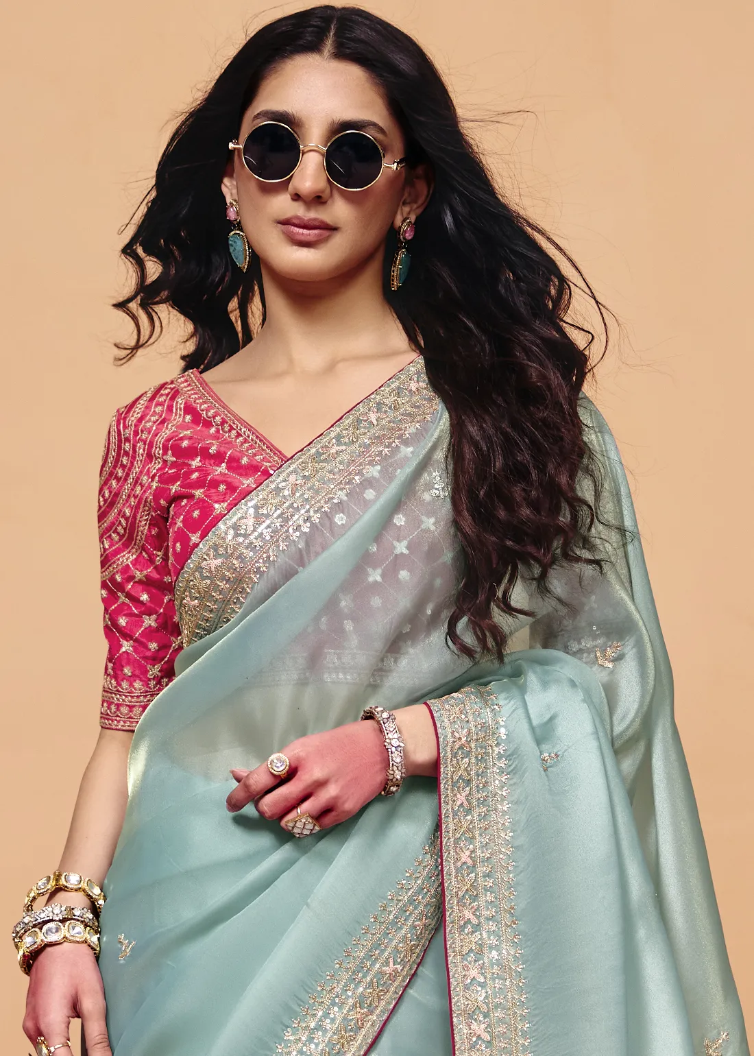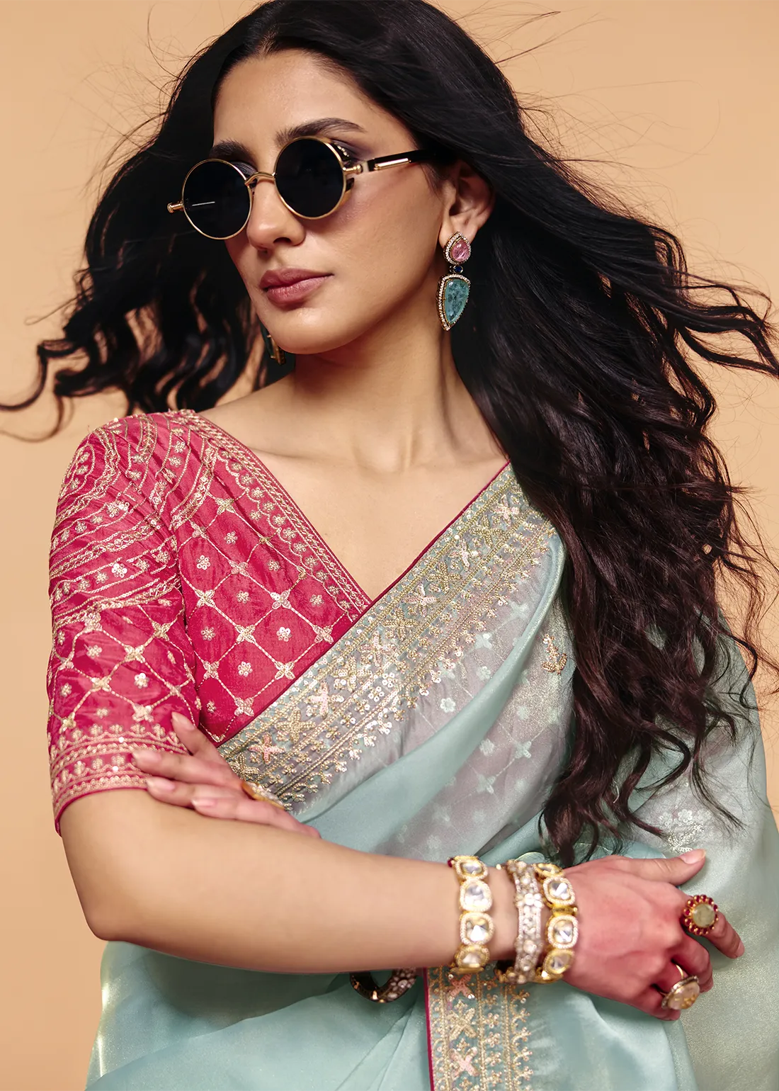 Blouse: Includes a striking contrast Fuchsia unstitched blouse piece that adds a bold, regal pop of color. Featuring heavy, coordinating sequin and stone embroidery across the fabric, it allows you to tailor a flawless, high-fashion designer look that perfectly offsets the pastel drape.