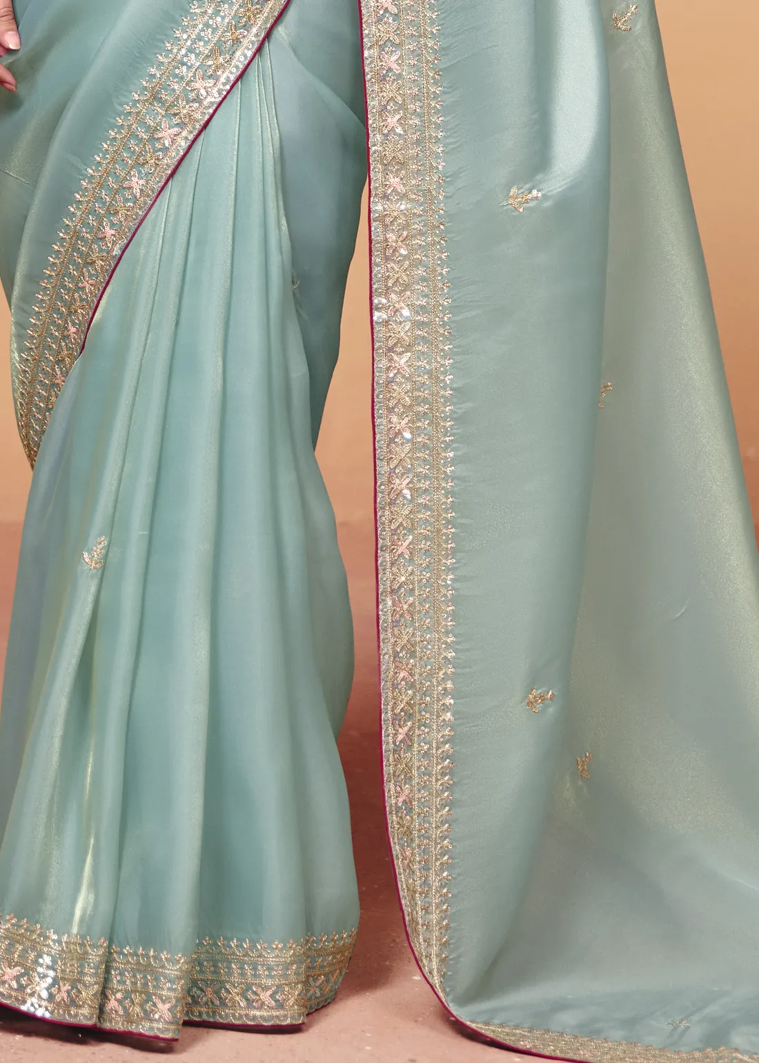 Saree: Step into the spotlight with this ethereal Ice Blue Embroidered Organza Saree. The sheer, lightweight drape of premium organza features a mesmerizing metallic sheen that perfectly captures the light. It is elegantly framed by a beautifully detailed border, hand-embellished with shimmering sequins and delicate stone work. The subtle pastel tone paired with the intricate border makes it an absolute dream for daytime weddings, pastel-themed bridesmaid ensembles, and elegant festive soirées.