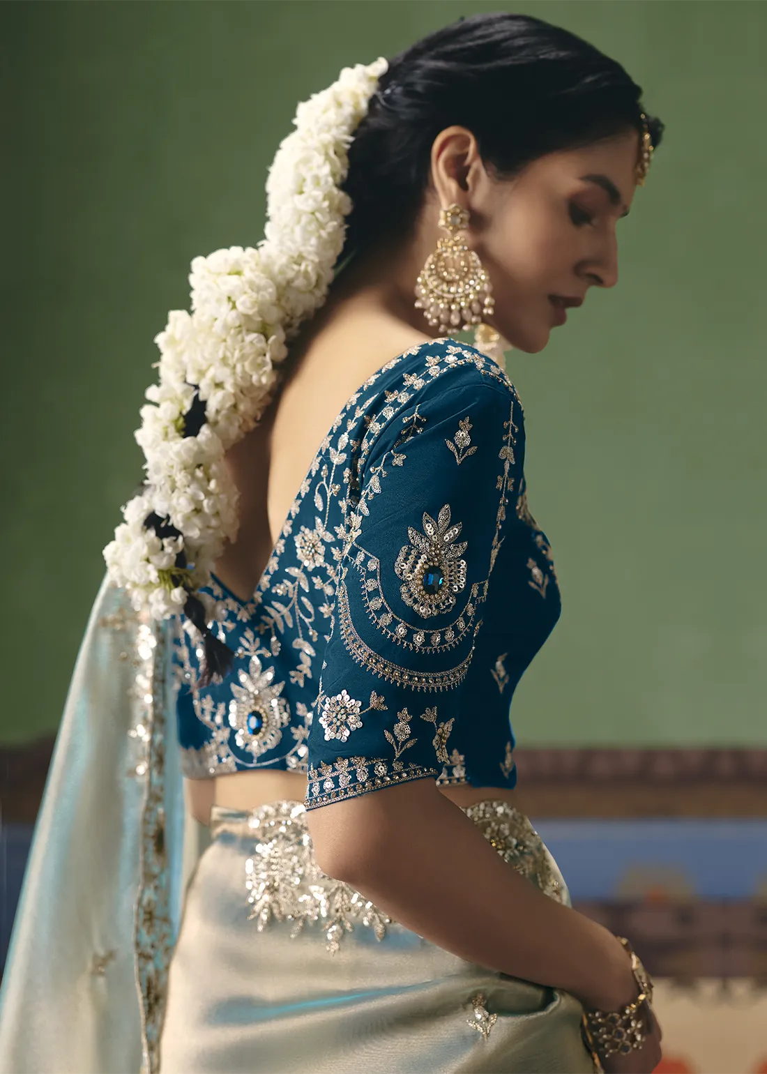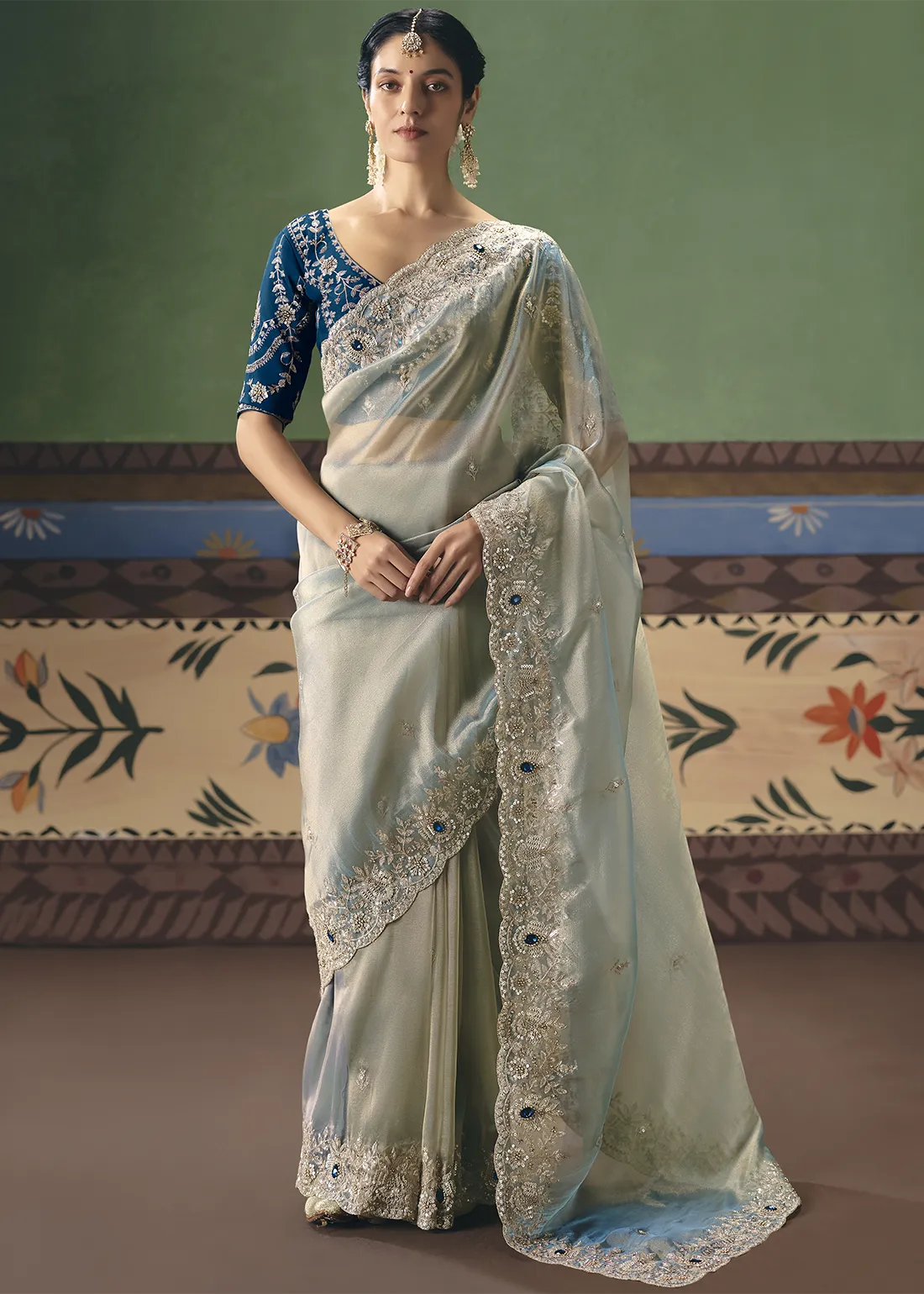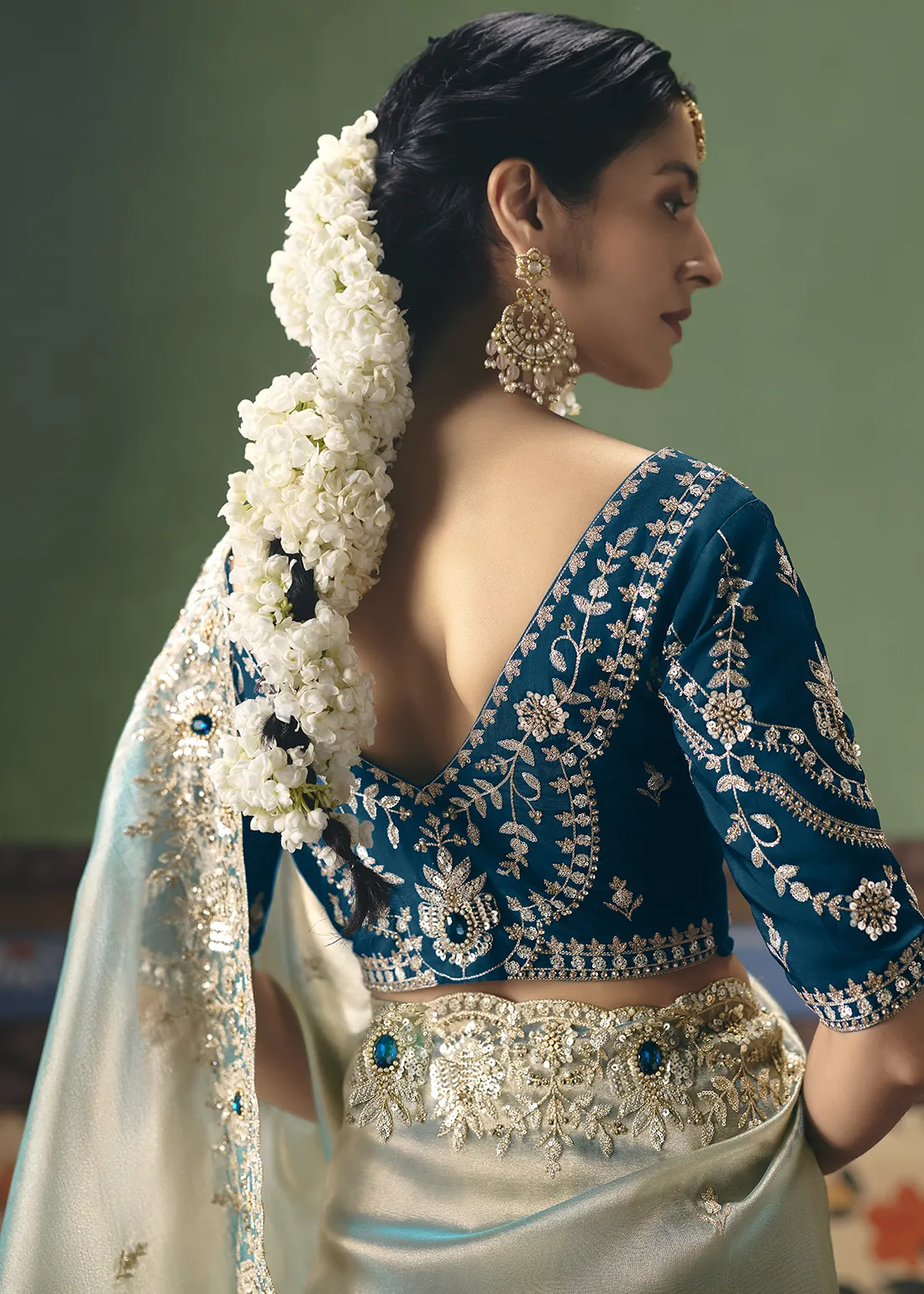 Ice Blue Embroidered Organza Saree with Peacock Blue Blouse