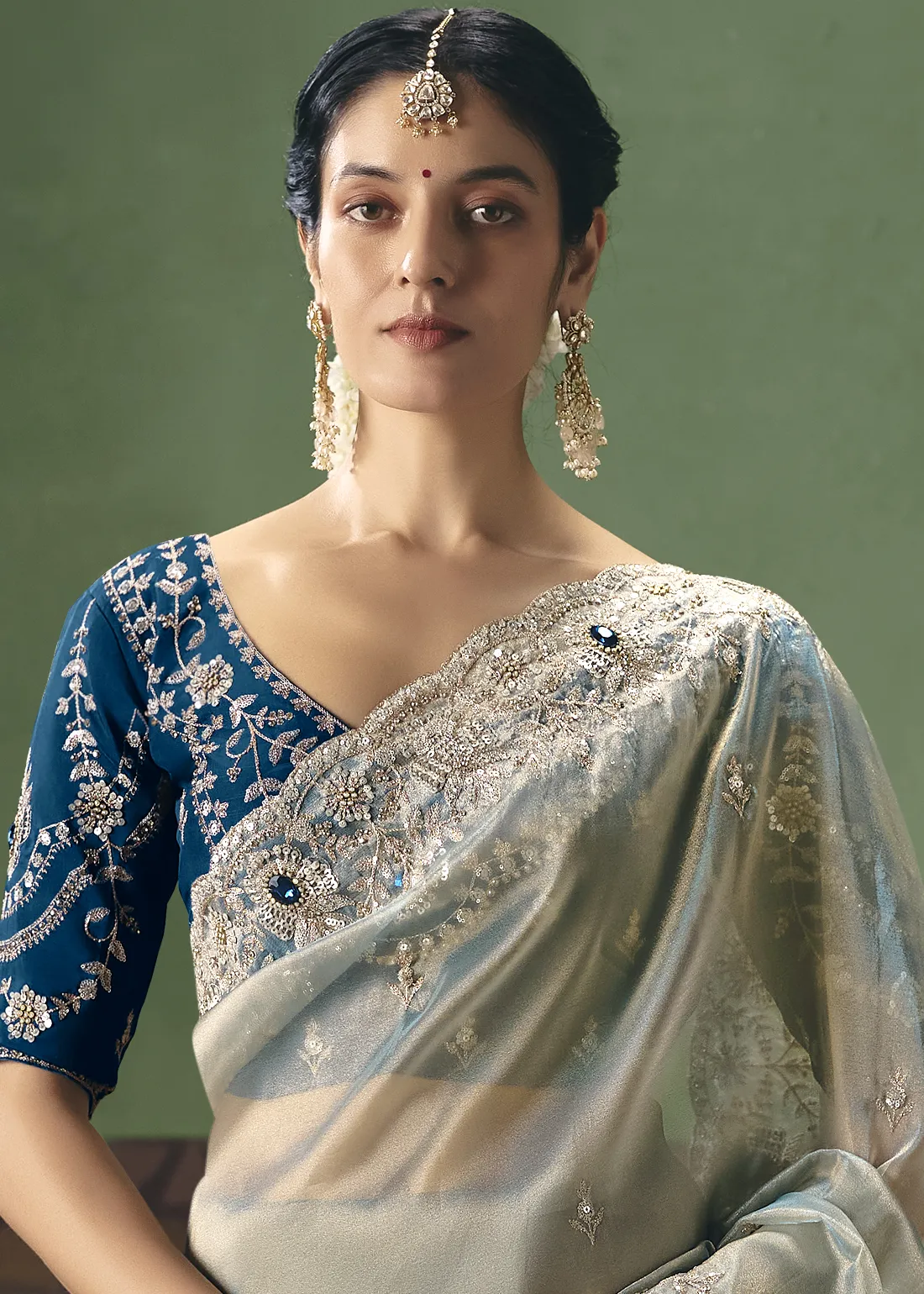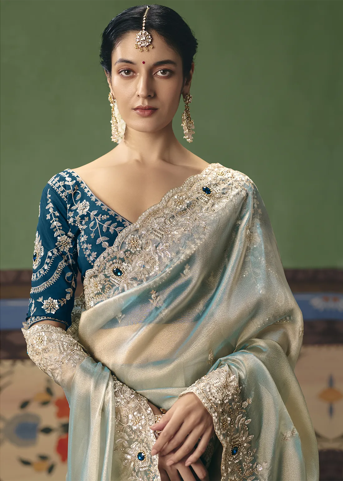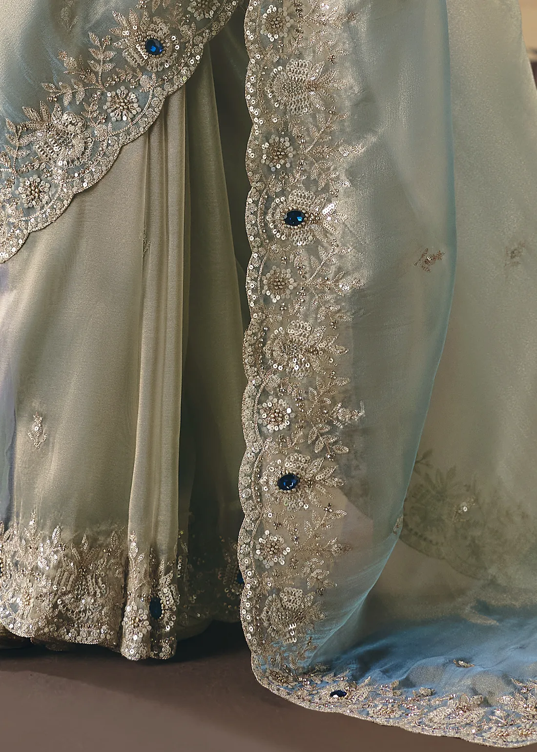 Ice Blue Embroidered Organza Saree with Peacock Blue Blouse