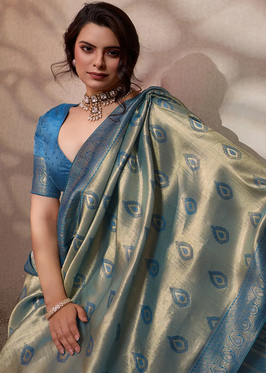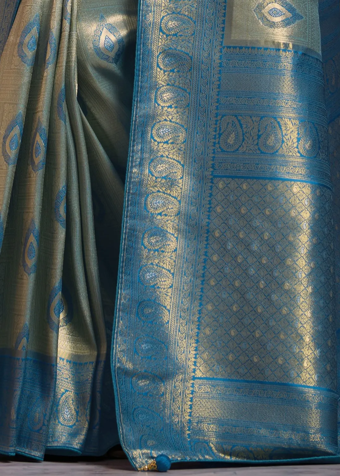 Saree: Exude cool, contemporary elegance rooted in tradition with this breathtaking Metallic Ice Blue and Azure Kanjivaram Pattu Saree. The luminous silk body offers a frosty, silver-blue sheen, intricately woven with rich golden zari showcasing classic traditional paisley (manga) motifs. It is flawlessly framed by a striking contrast Azure blue border and a grand, heavy zari pallu that radiates regal charm. Exquisitely finished with handmade designer tassels and premium edge piping to protect the fabric and ensure a structured, graceful drape, this masterpiece is the perfect choice for modern brides, elegant receptions, and grand festive occasions.