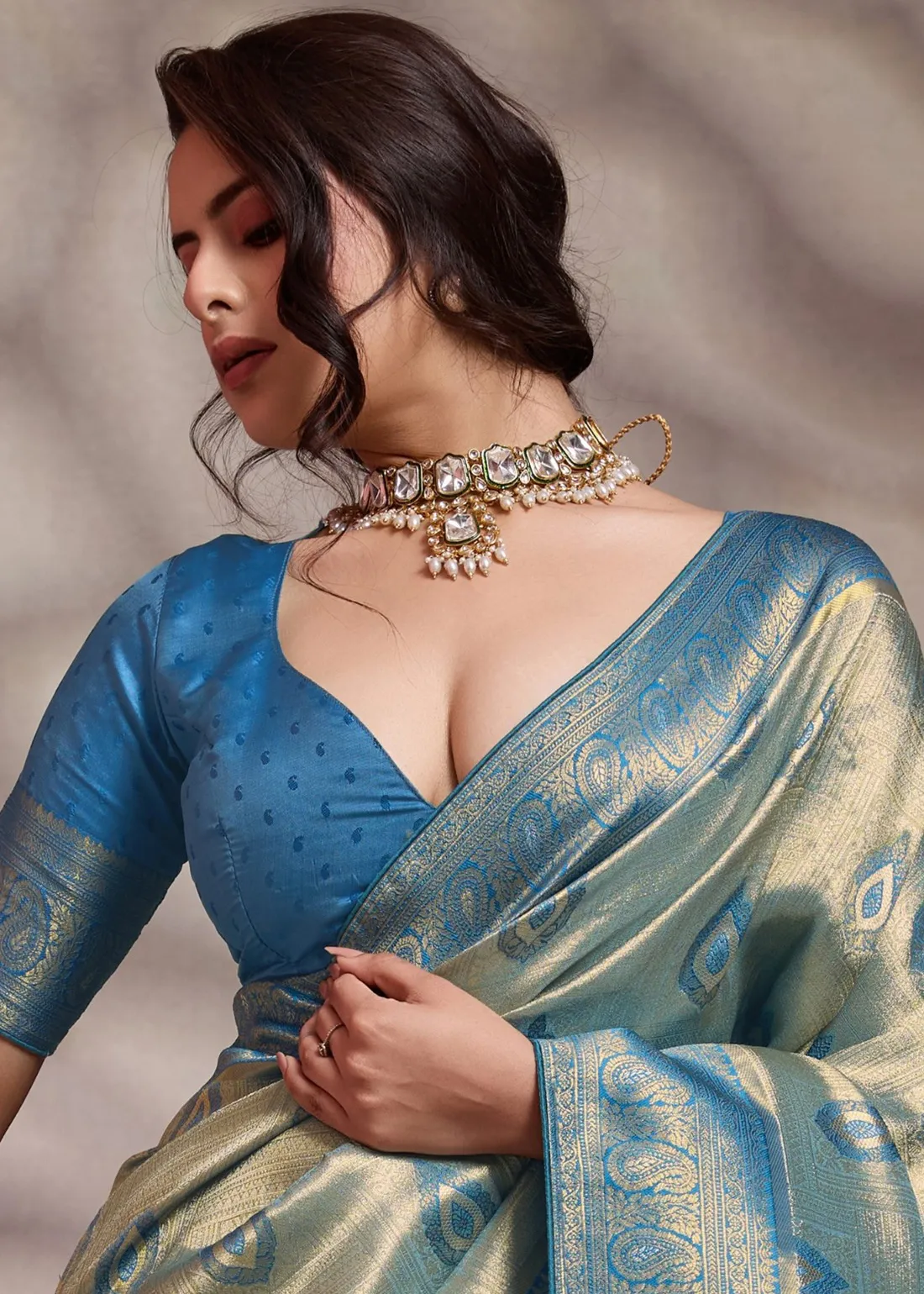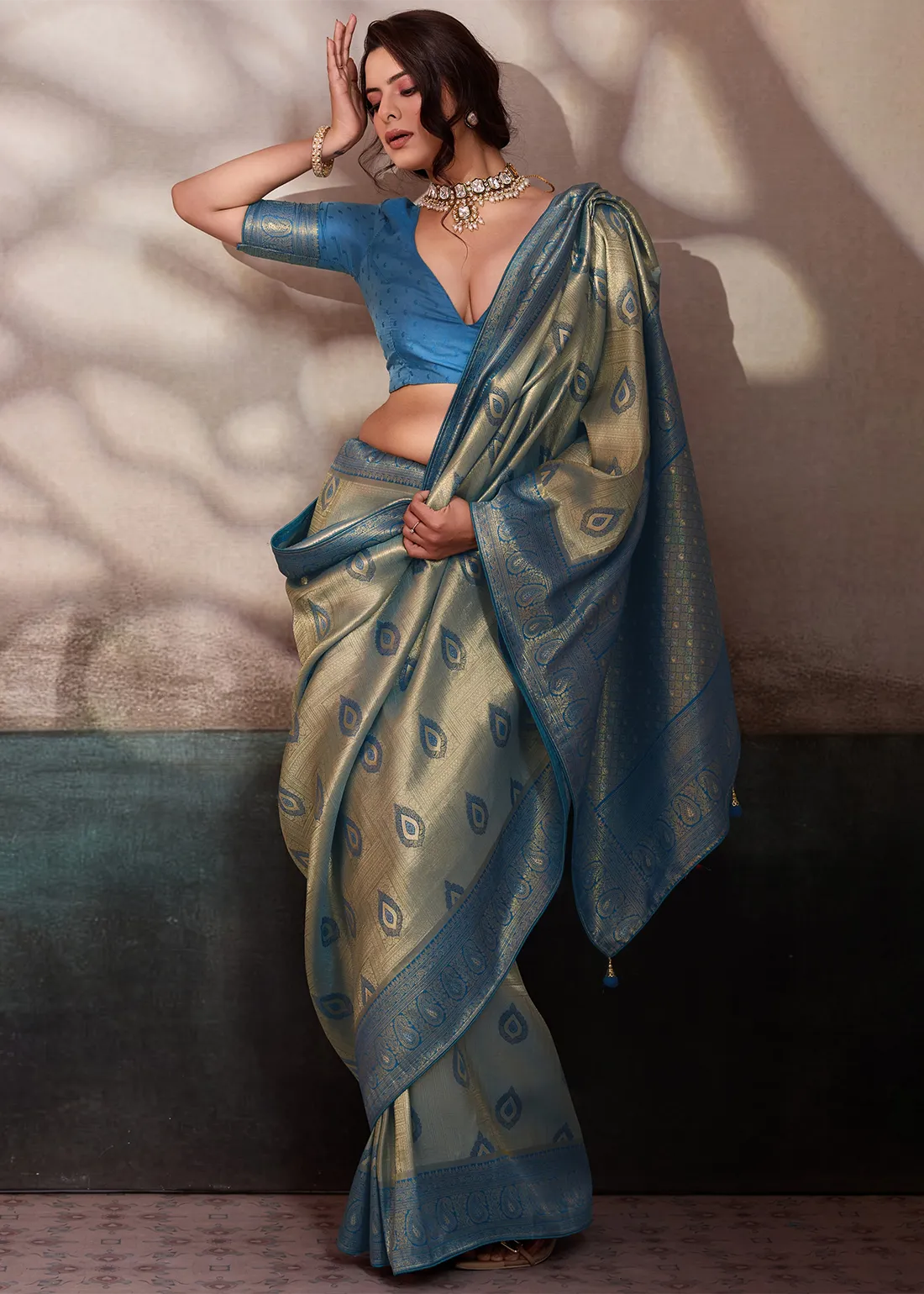 Blouse: Includes a matching contrast Azure blue unstitched blouse piece. Featuring woven zari bootis and a coordinating rich border, it allows you to tailor a magnificent, authentic, and cohesive designer ethnic ensemble.