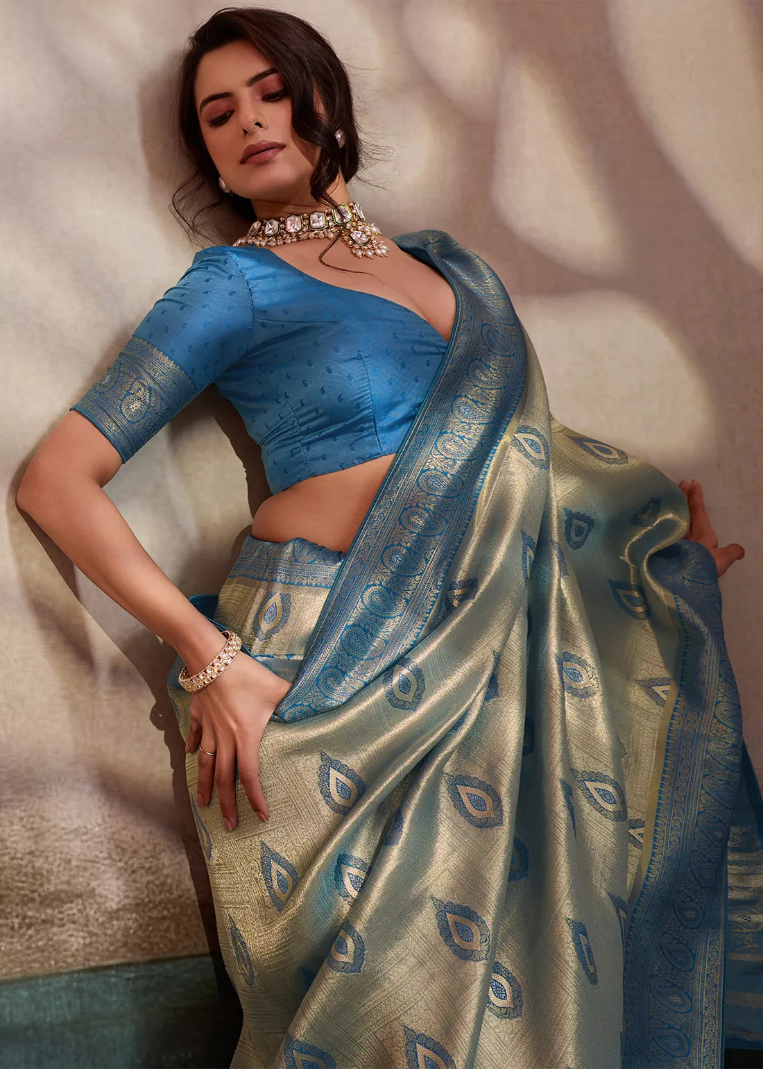 Ice Blue Kanjivaram Pattu Saree with Azure Blue Blouse