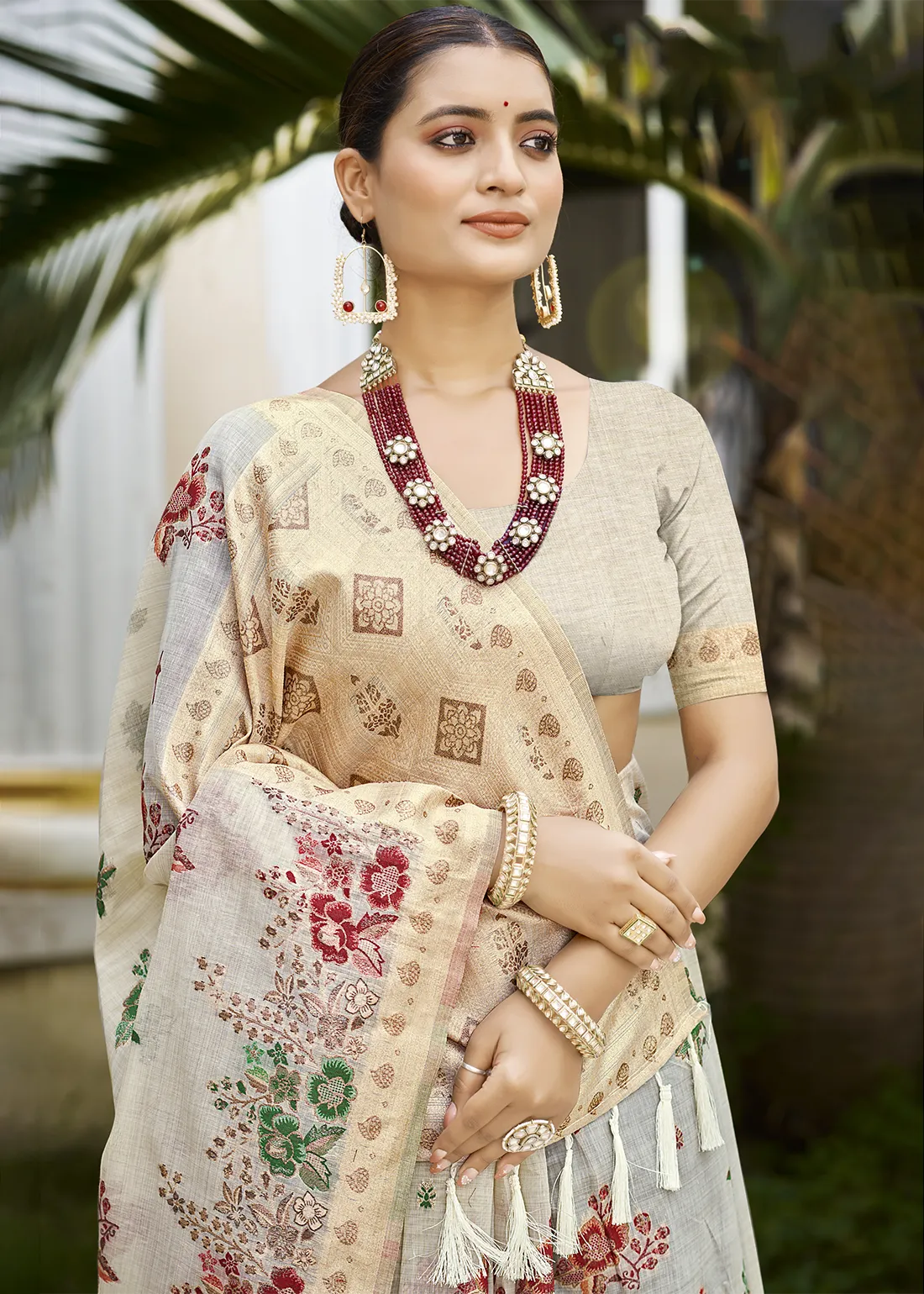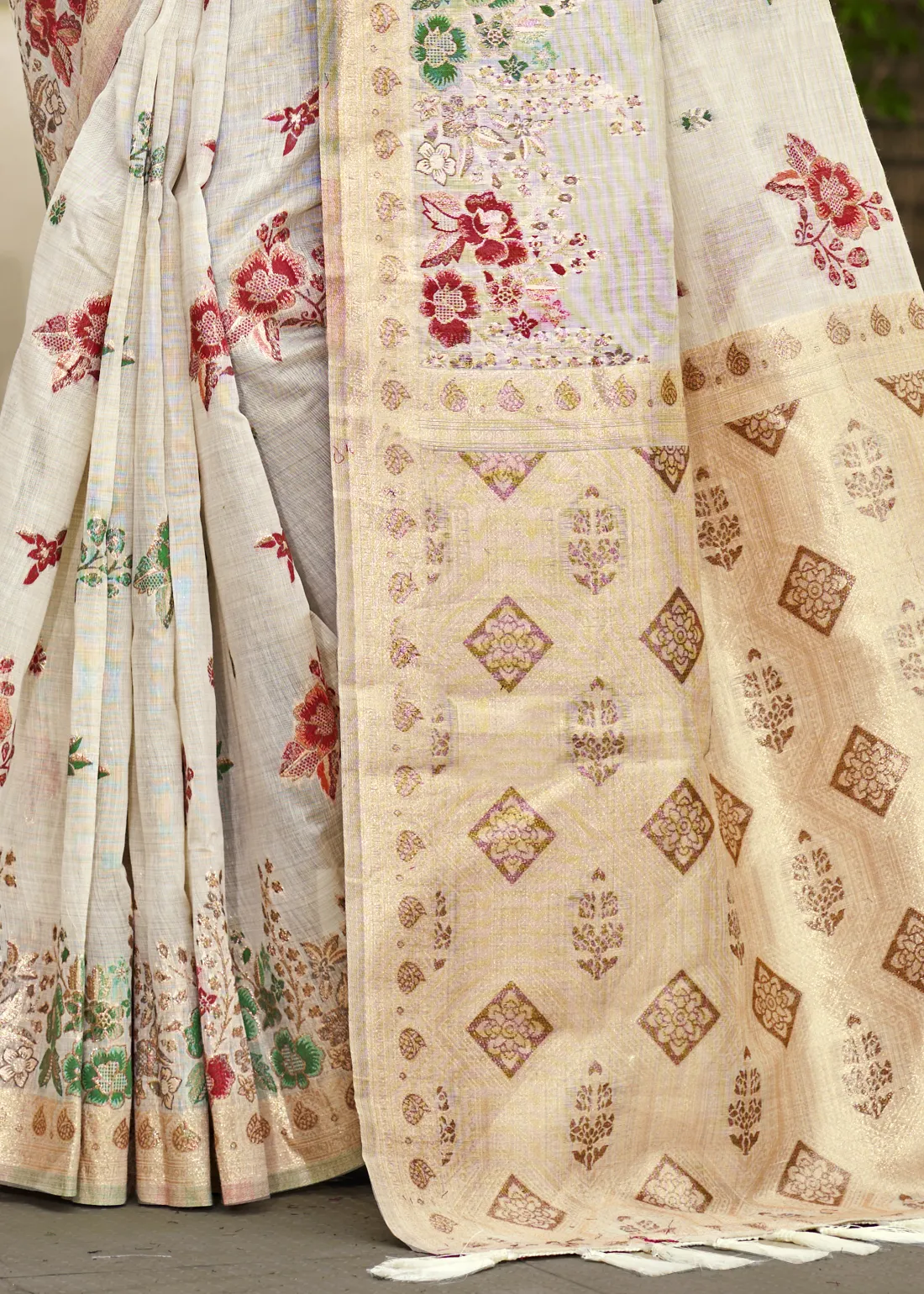 Ivory Linen Silk Banarasi Saree with Meenakari Floral Buttis