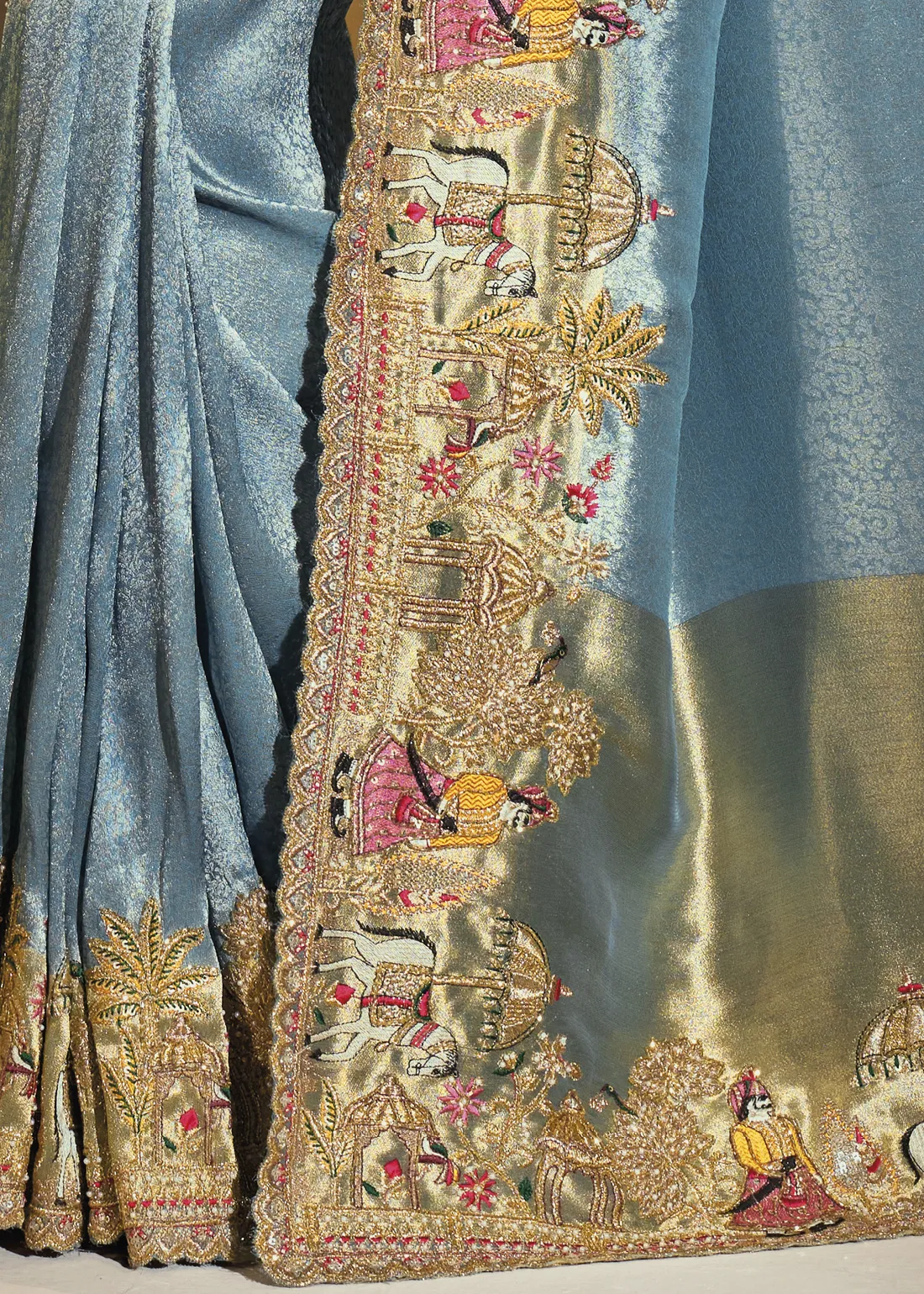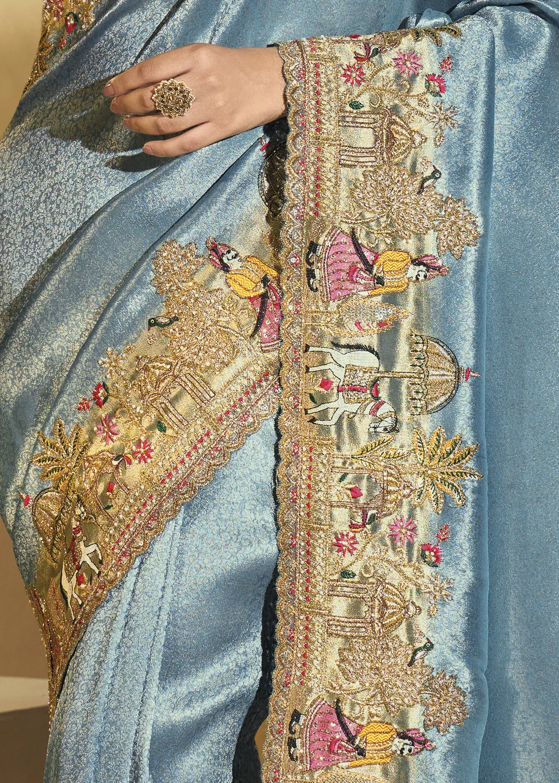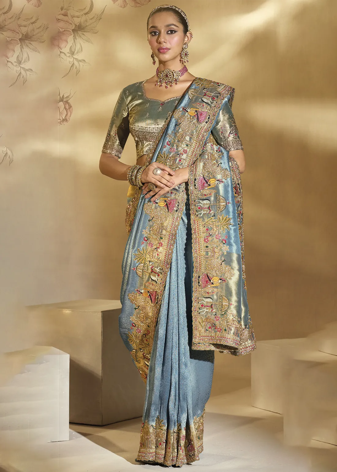 Step into timeless luxury with this exquisite Light Blue Luxe Silk Saree, a masterpiece crafted for modern brides and women who adore heritage elegance. Made from premium fabric, this saree features a breathtaking border adorned with intricate Zari, Thread, Cutdana, Mirror, and Beads work, showcasing royal motifs, floral artistry, and delicate scene-inspired embroidery.