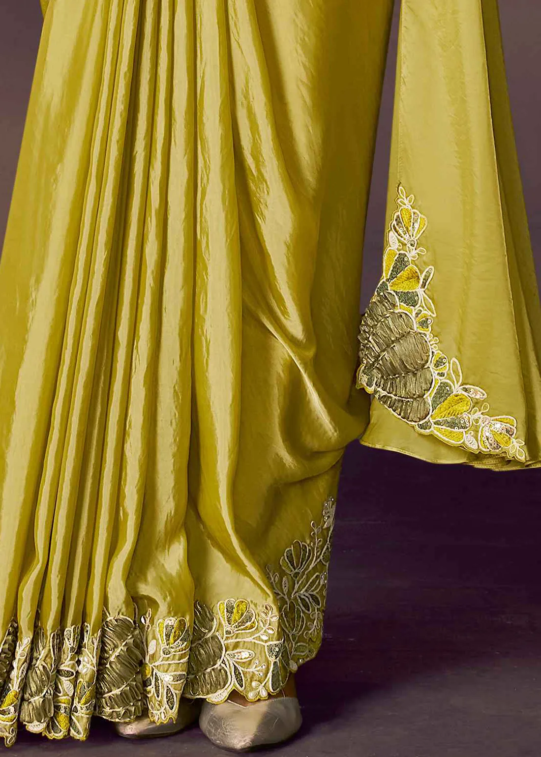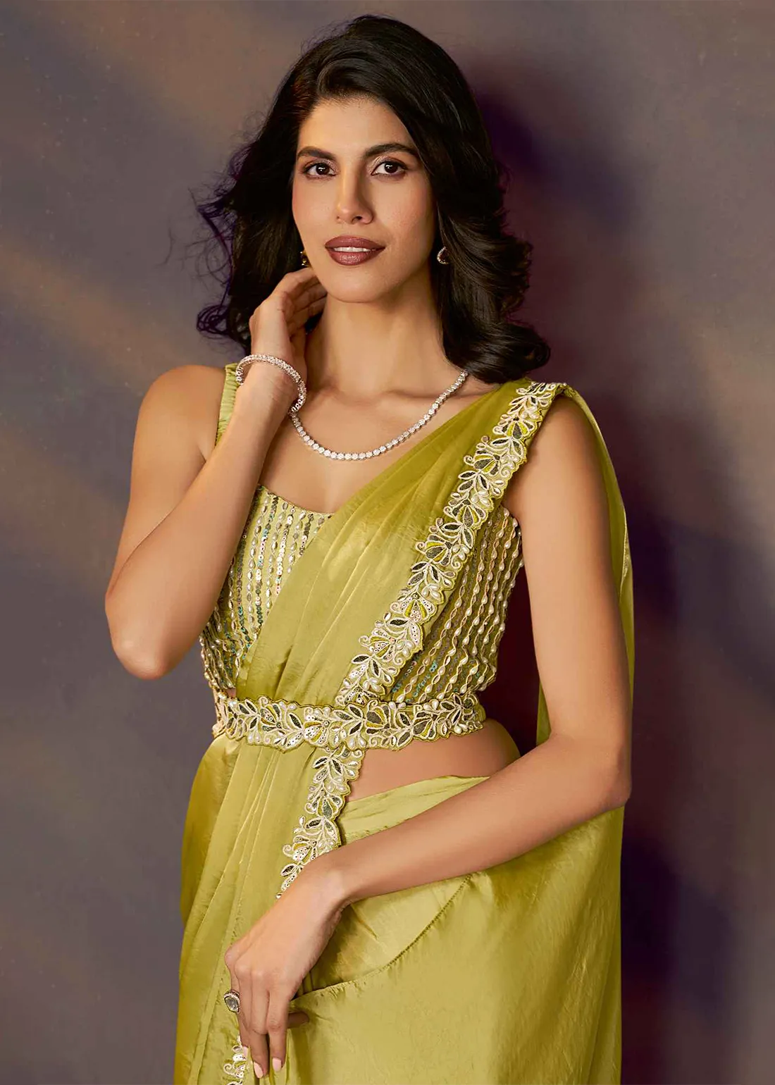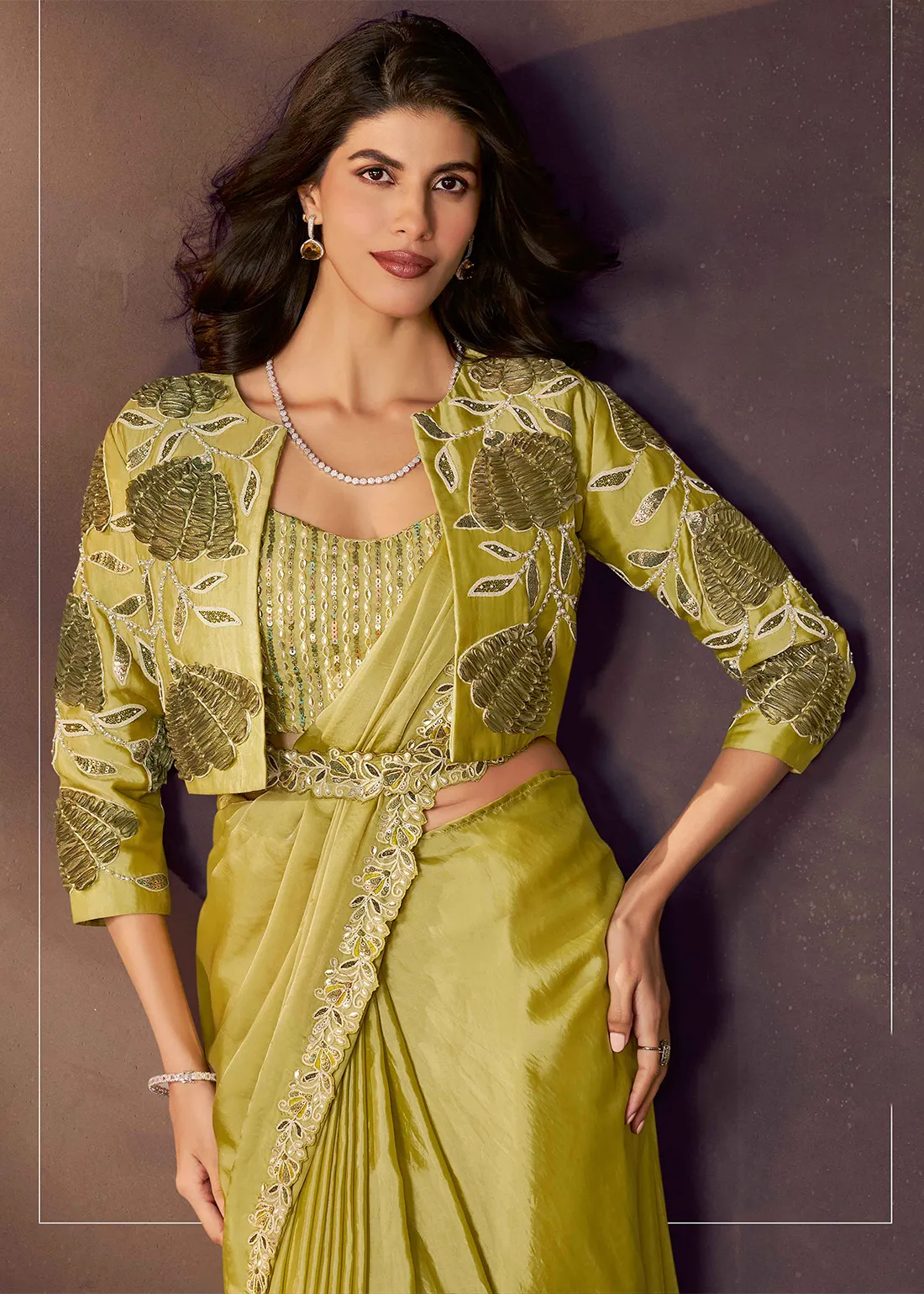 Lime Green Ready to Wear Satin Silk Saree with Jacket & Belt