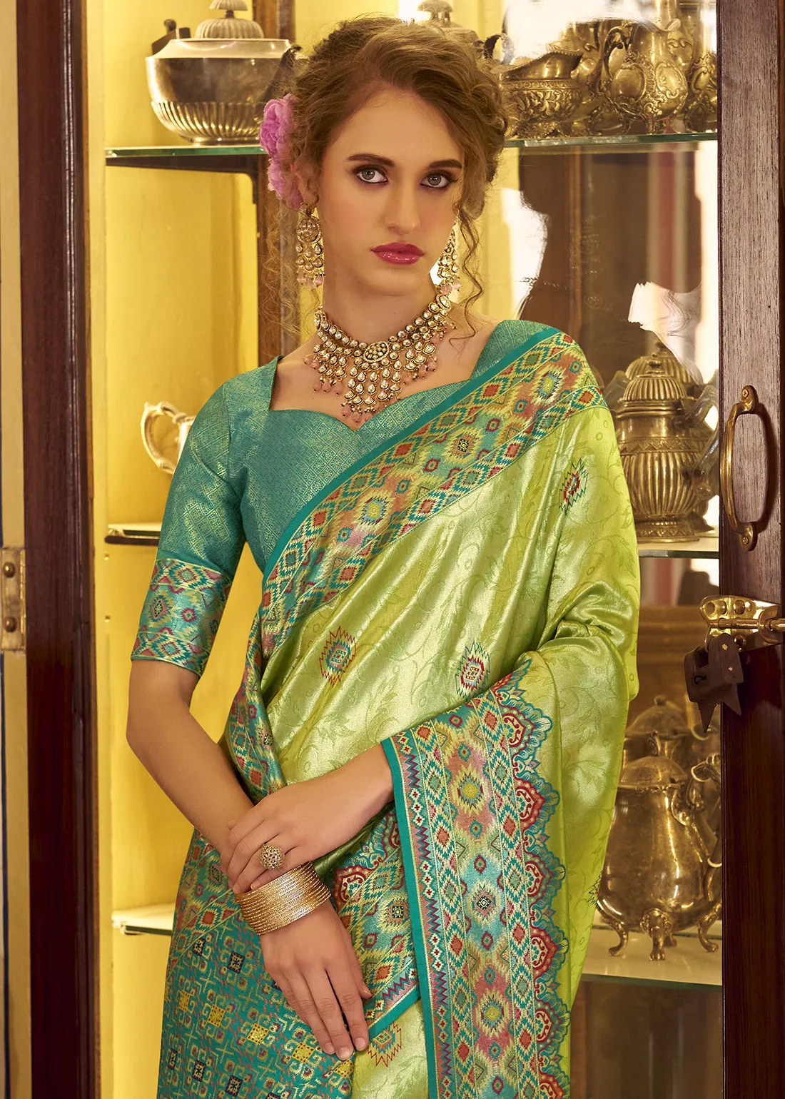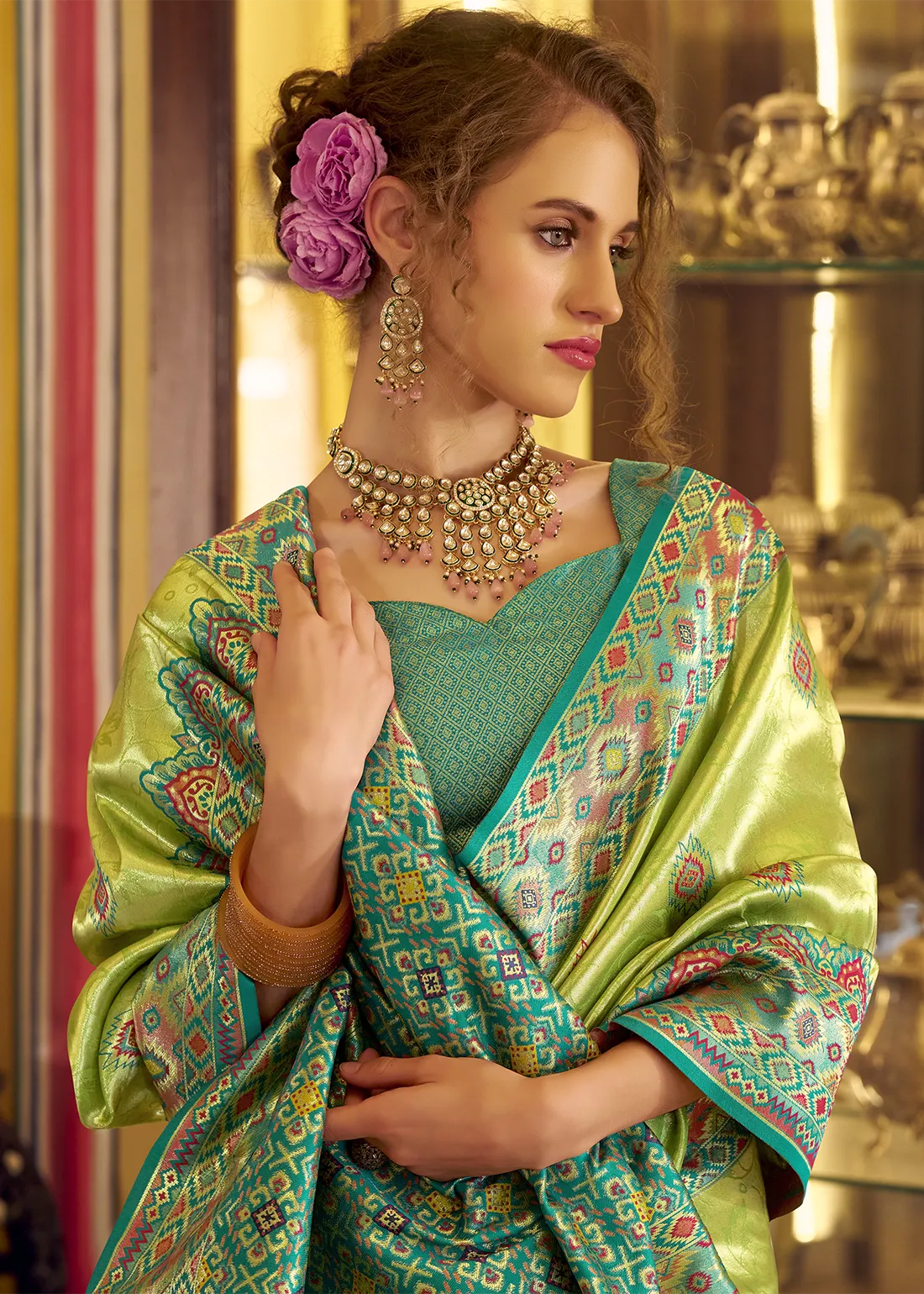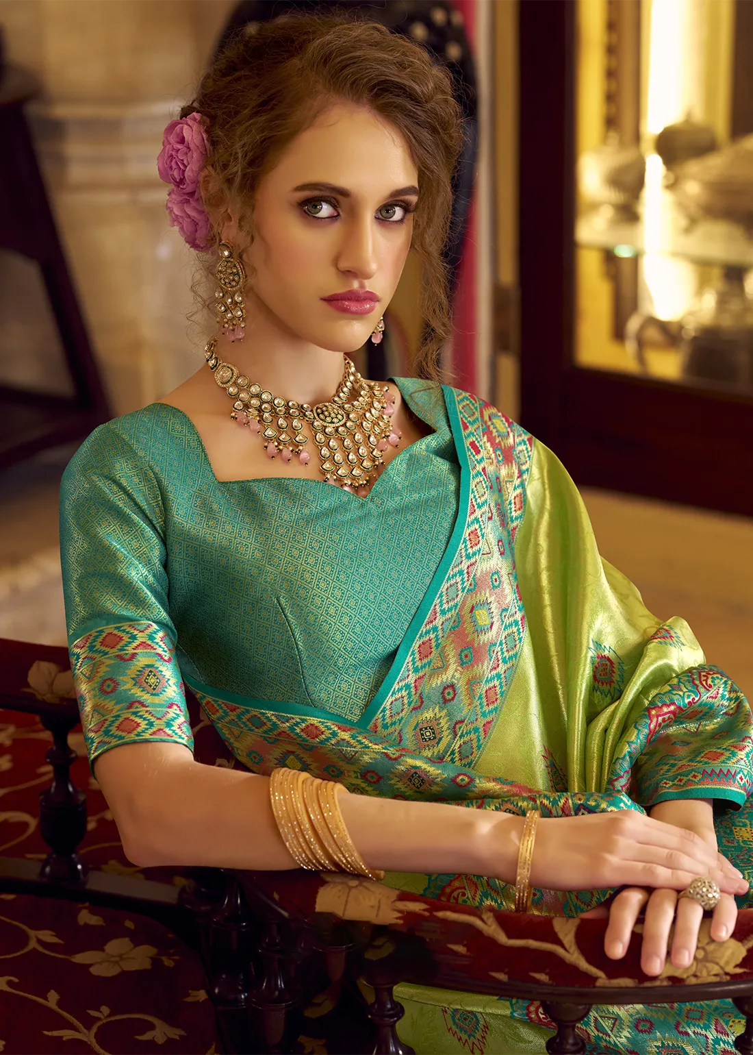 Saree: Graceful and vibrant, this Lime Green Patola Tissue Silk Saree is designed for the modern woman who loves traditional charm. The elegant self woven body is enhanced with colorful woven patola motifs, while the rich contrast border and blouse bring a striking pop of color. With floral and traditional patola patterns delicately woven into the saree, this drape is an excellent choice for festive occasions, weddings, and special celebrations. Its luxurious design ensures a refined and glamorous look.