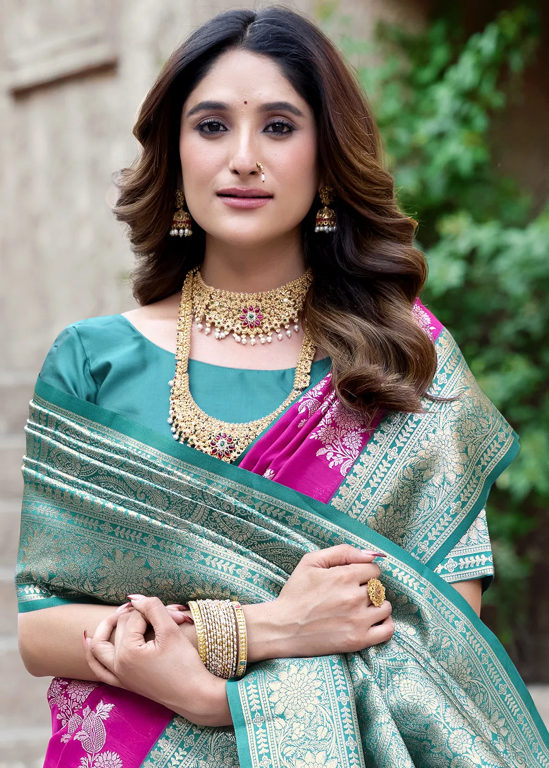 Peacock Blue & Pink Dual Colour Banarasi Saree